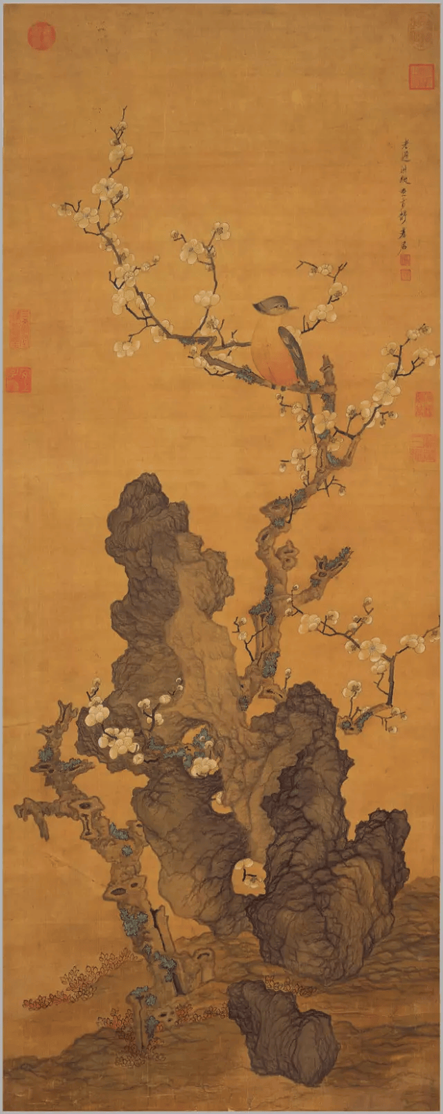 巨大的太湖石后,有一棵树干盘曲的老梅,枝丫上满布这含苞待放和盛开的梅花。一只山鸟伫立枝上,侧头而望。这只山鸟的鸟喙平伸,表情极富趣味性。陈洪绶以古籀(zhòu)法写梅干,笔力雄健。花以钩勒填彩法画成,轮廓线条细如游丝,遒劲稳定。花瓣和花蕊都用白粉点染,瓣瓣丰厚,朵朵圆实。石的皴纹扭动,笔墨圆润而含蓄。