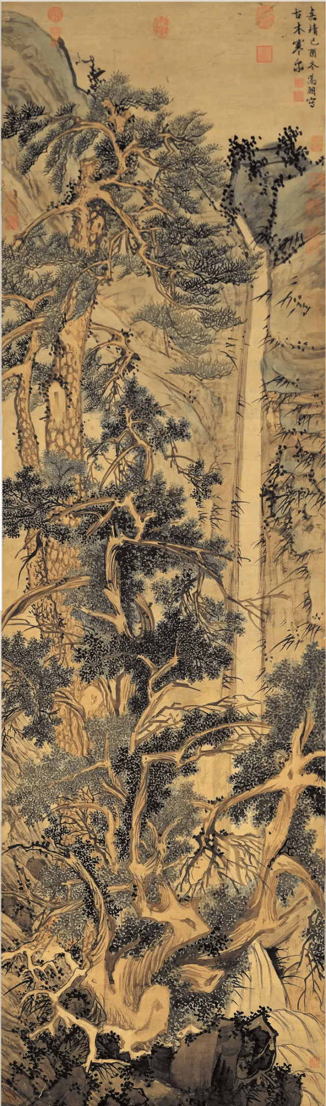 明 文徵明 《古木寒泉》 绢本设色画 194.1×59.3cm