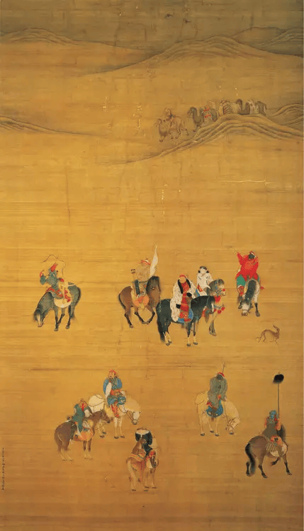 此画作于西元1280年,属于大幅作品,画北方沙漠地带,一片黄沙坡地,景色单调。在沙丘无垠的远方,正有一列骆驼驮队横越。近处人骑数众,或张弓射雁;或手架猎鹰;或绳携猎豹,皆为马上行猎之状。其中骑著黑马、身穿白裘的,应为元世祖,与世祖并驾的妇女,似为帝后,其馀八人,应是侍从,其中尚有中亚黑奴一名。