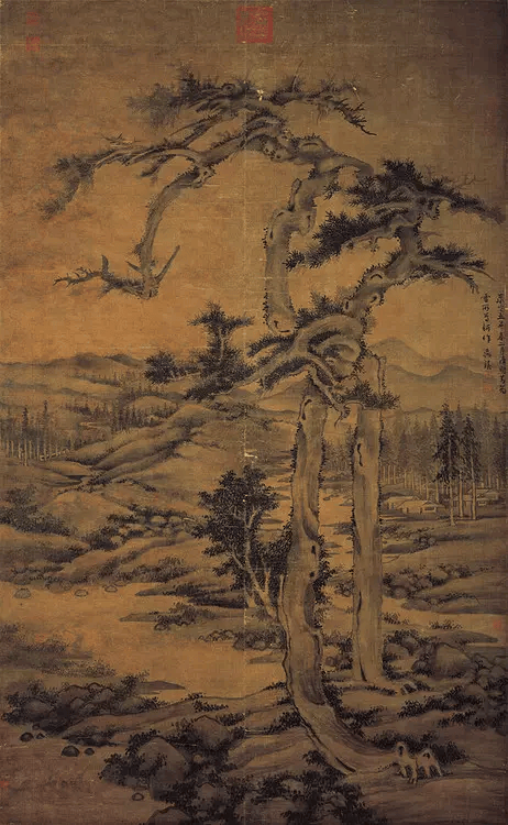 画中双树擎天而立,树后有一条蜿蜒的溪流渐渐地向后推延,几户房舍座落在岸边,空间深邃。虽然这件画轴的画题是《双松图》,可是从画上两棵树的枝干看来,吴镇画的应该是桧树才对。画中桧树的枝丫纠结,仍然保存了李成、郭熙画树的风貌。树皮以长披麻皴来表现,笔法又和董源、巨然相似。坡岸多作矾头,也是董巨山水画的重要特色。全作的笔力雄劲,墨气沉厚,有一种平淡天真的韵致。