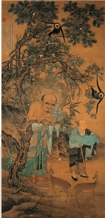 台北故宫博物馆藏画中,有三幅刘松年画罗汉,每幅都款署“开喜丁卯(1207年)刘松年画”,此轴即为其中之一。幅中罗汉浓眉高鼻,貌若印度高僧,身著右袒式袈裟,倚树沉思。身侧随侍的和尚以衣袂承接树上长臂猿所摘之石榴,身前尚有二鹿仰观,画面生动。此罗汉脸上满佈皱纹,双眉蹙起,神情专注,栩栩如生。全作用笔变化多端,衣纹流畅罗汉头后的圆光,及三树枝柯掩映,层次分明。全画敷色研丽,繁缛精美,皆臻绝纱。