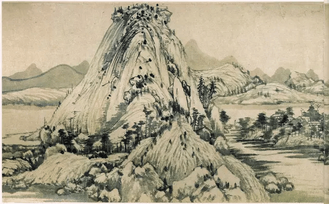 周臣(约西元1460至1535年后),字舜卿,别号东村,鹅场散人。吴郡人(今江苏苏州)。画山水师陈暹,得宋人法;擅摹李成、郭熙、马远、夏圭,用笔精熟。又兼工人物,无论古貌奇姿,或绵密萧散,均能各极意态。唐寅、仇英二家,为其最杰出的弟子。