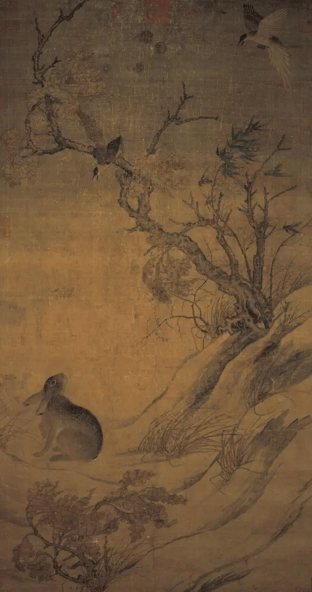 本幅描绘两只山喜鹊,向一只野兔鸣叫示警。山喜鹊属鸦科鸟类,性机灵,喜群聚,有卫护领域的习性。画面上一只腾空飞来助阵,一只据枝俯向鸣叫,并向闯入者张翅示威,野兔知道这是威胁性不太大的鸟类,无需像遇到鹰隼那样紧张,故伫足回首张望,似欲回应经此路过不行吗?三者动态与其呼应之关系,恰构成似有S型之韵律动感。还有树木的枝叶、竹、草均受风而有倾俯之姿,更添增了活泼生动的神韵。这种自然生态中的景象,不是从笼栏中能观察到的,画家必需具备精湛的绘画描写能力,而且时常到郊野观察,在偶然中见此生动有趣的一幕,遂以精练的技法忆写稍纵即逝的景象,再参考平时曾画过的相关画稿,或继续观察描绘,始能慢慢完成工谨详实的作品。此画成于嘉右辛丑(1061)年。