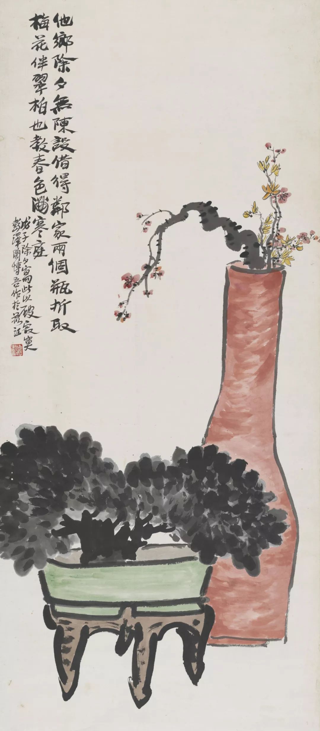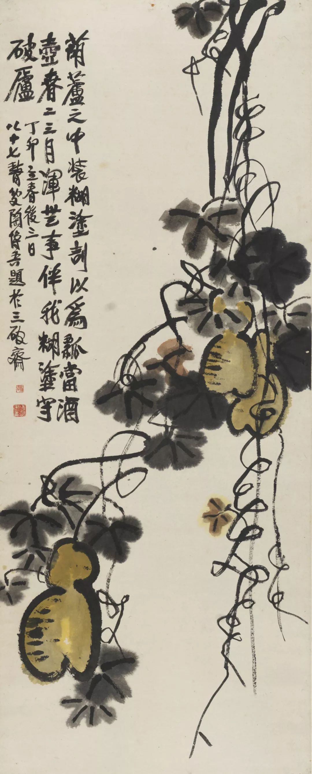 论及陶博吾先生的绘画,我们亦无法绕开吴昌硕的存在,因为陶博吾在绘画语言的使用上,的确遵从了吴昌硕所贯彻的以篆籀笔法直接入画的法则。虽然早在六百年前赵孟頫就提出了“石如飞白木如籀”的文人画论,并且以后代有作家进行探索尝试,但以篆书笔法入画直到吴昌硕才算真正全面到位。
