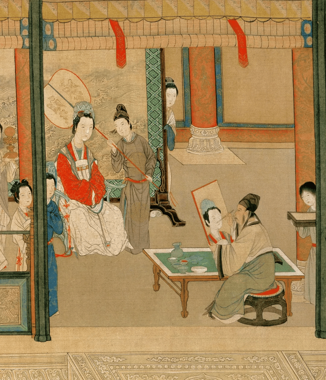 仇英最为今人称道的便是其“青绿”技法,他也将这种颜色运用于长卷人物场景中,他的配色总是很好看,这种敏感得益于其早年漆工的出身。其实,在我们今天看来,这些传统器物之美非常迷人,精工细作的雅致已成绝唱,所以能作出好漆器的人,他的画画当然不会差,加之仇英后天的勤奋与悟性,证明了即使是天才确实也是由99%的汗水塑造的真理。