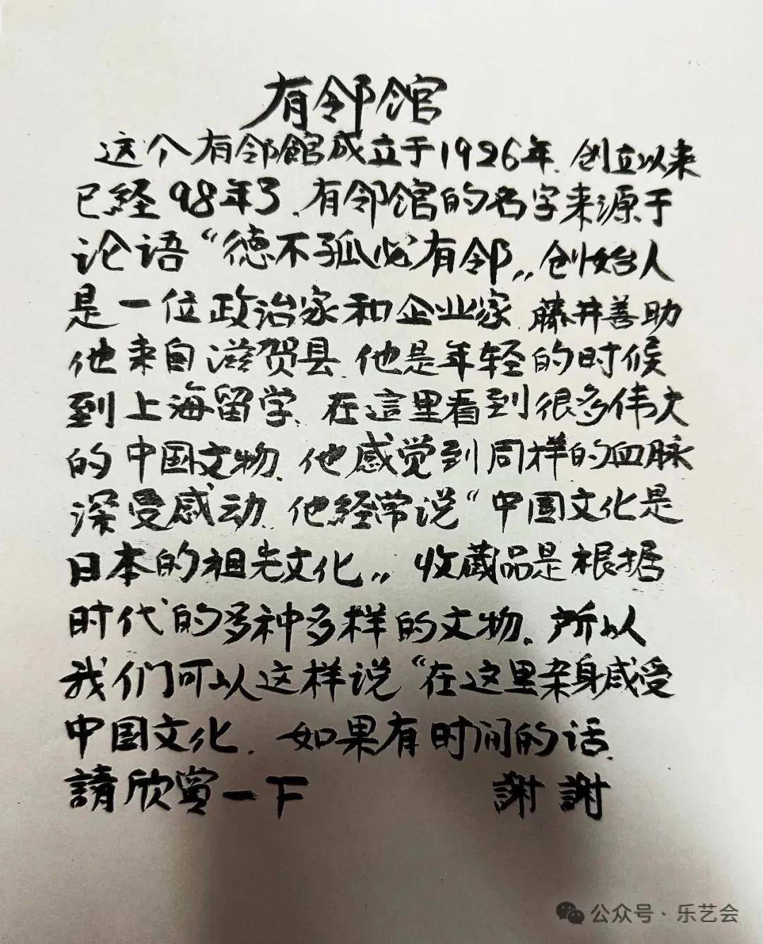 有邻馆由日本近江的富商藤井善助(1873-1943)创建于1926年10月。藤井善助早年留学于上海的日清贸易研究所(1901年改组为东亚同文书院),回到日本后继承家业,开始收集中国文物。藏品包括商、周青铜器到宋、元、明、清书画。