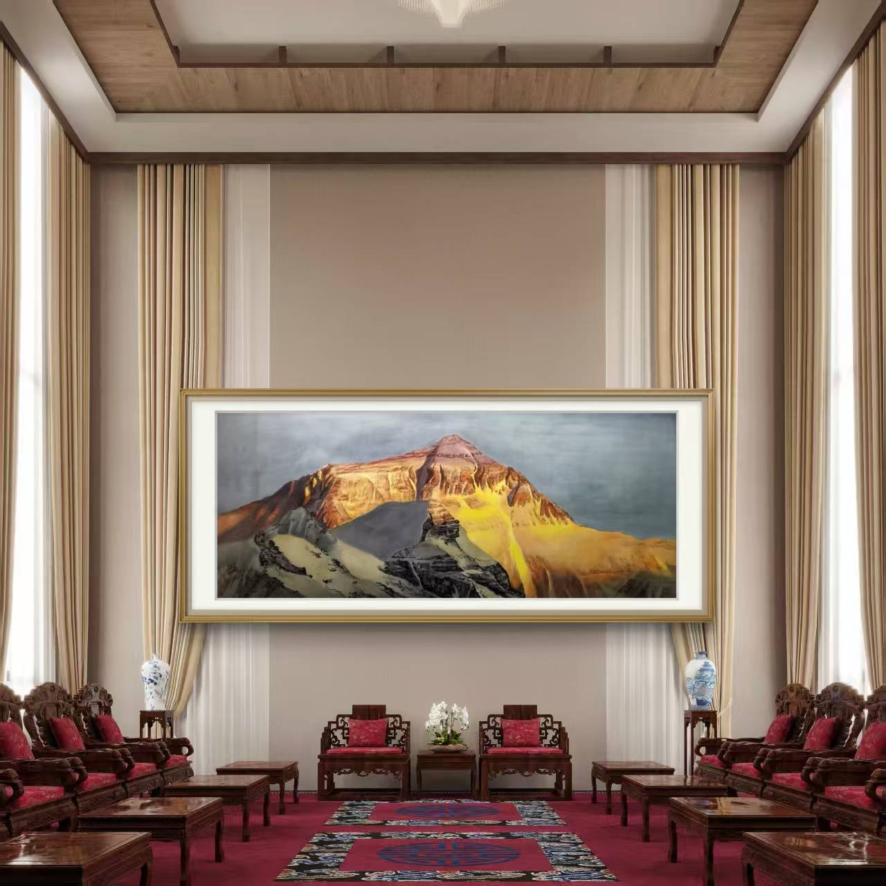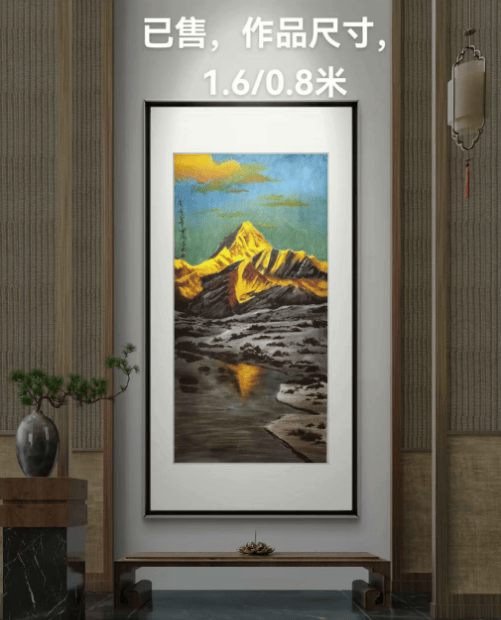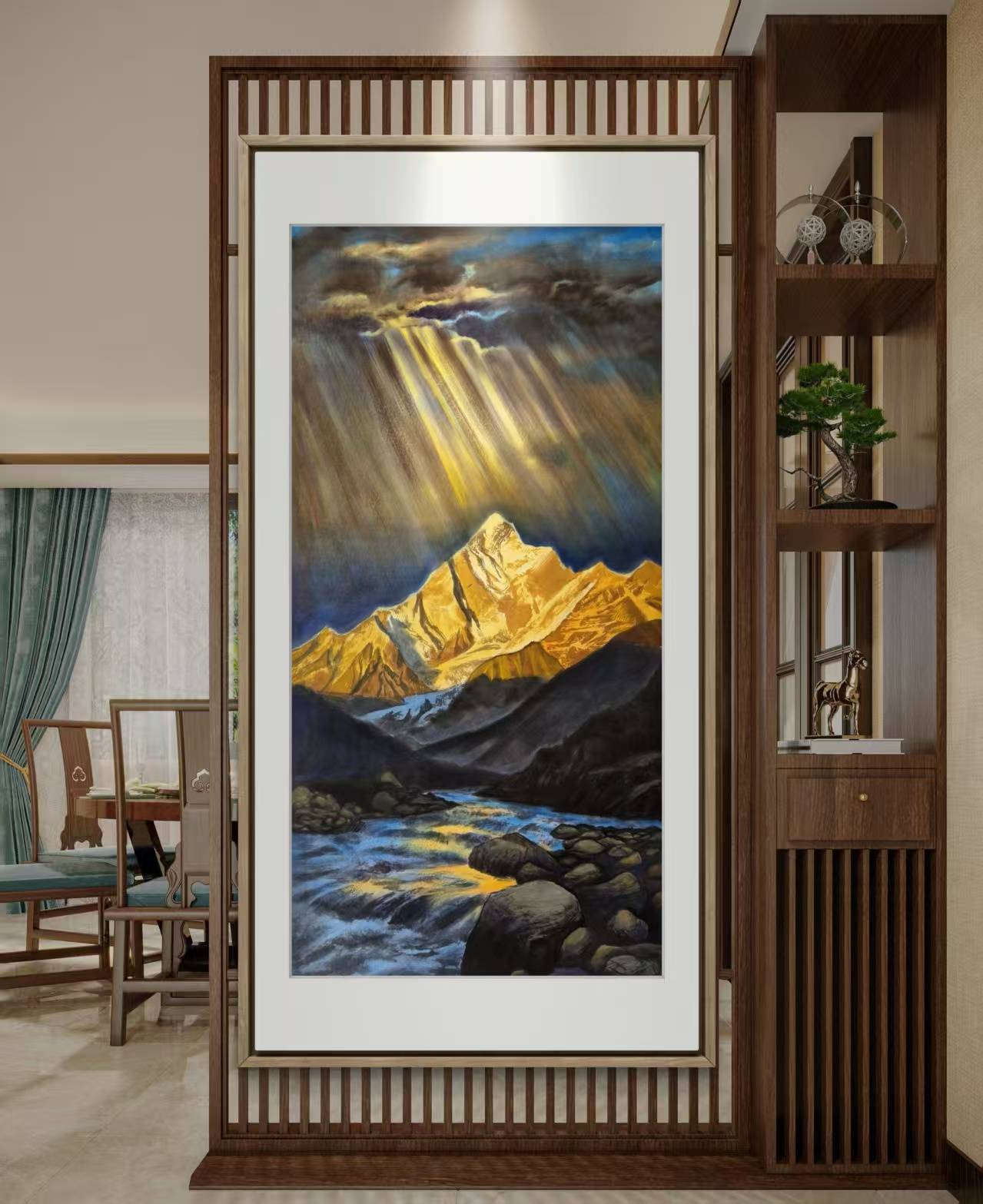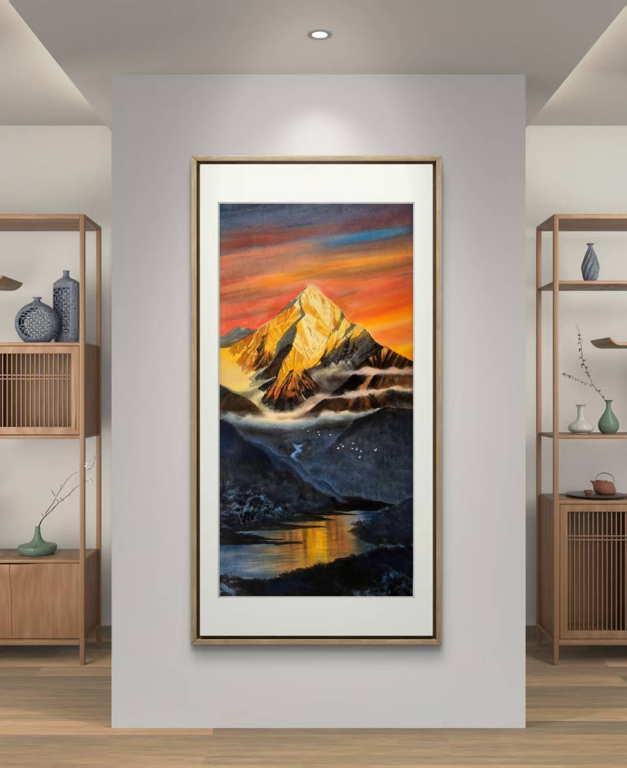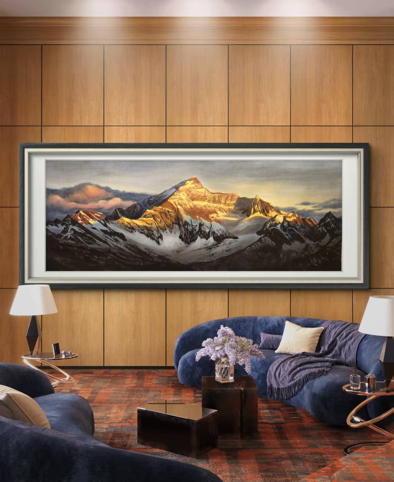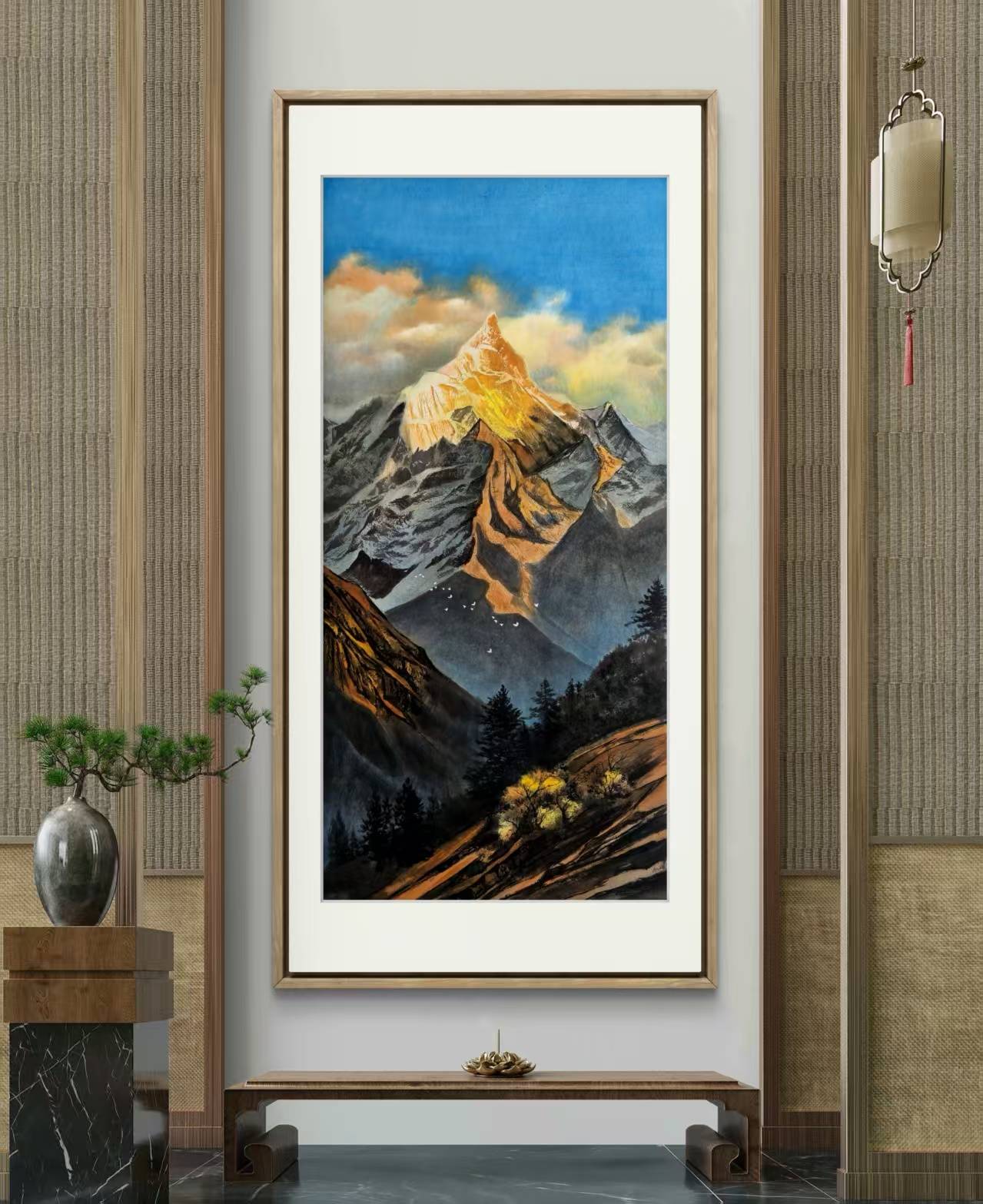 画家为亮早期以创作黄河,大海,长城题材为主,被誉为著名爱国题材画家,近几年走偏国内能呈现自然奇观日照金山的各大名山,4次进入藏区2次进驻珠峰大本营创作大量日照金山作品。