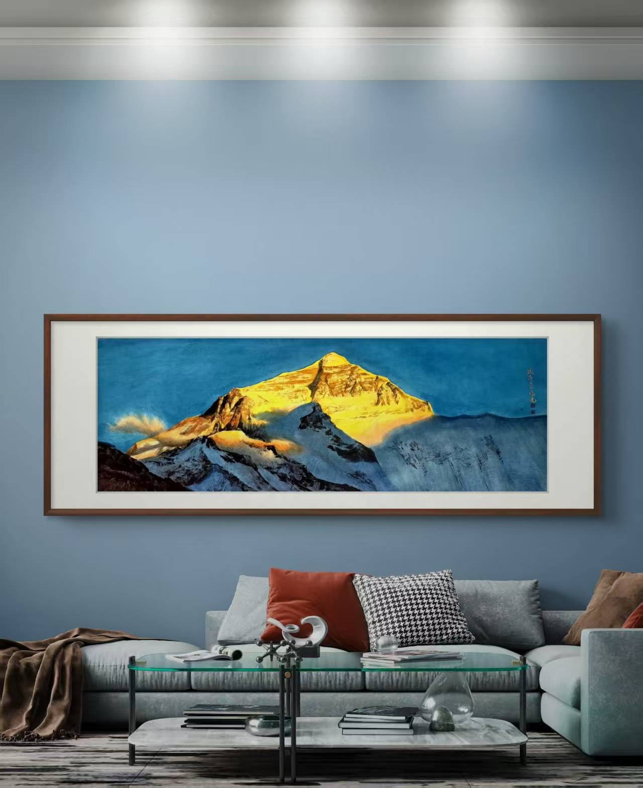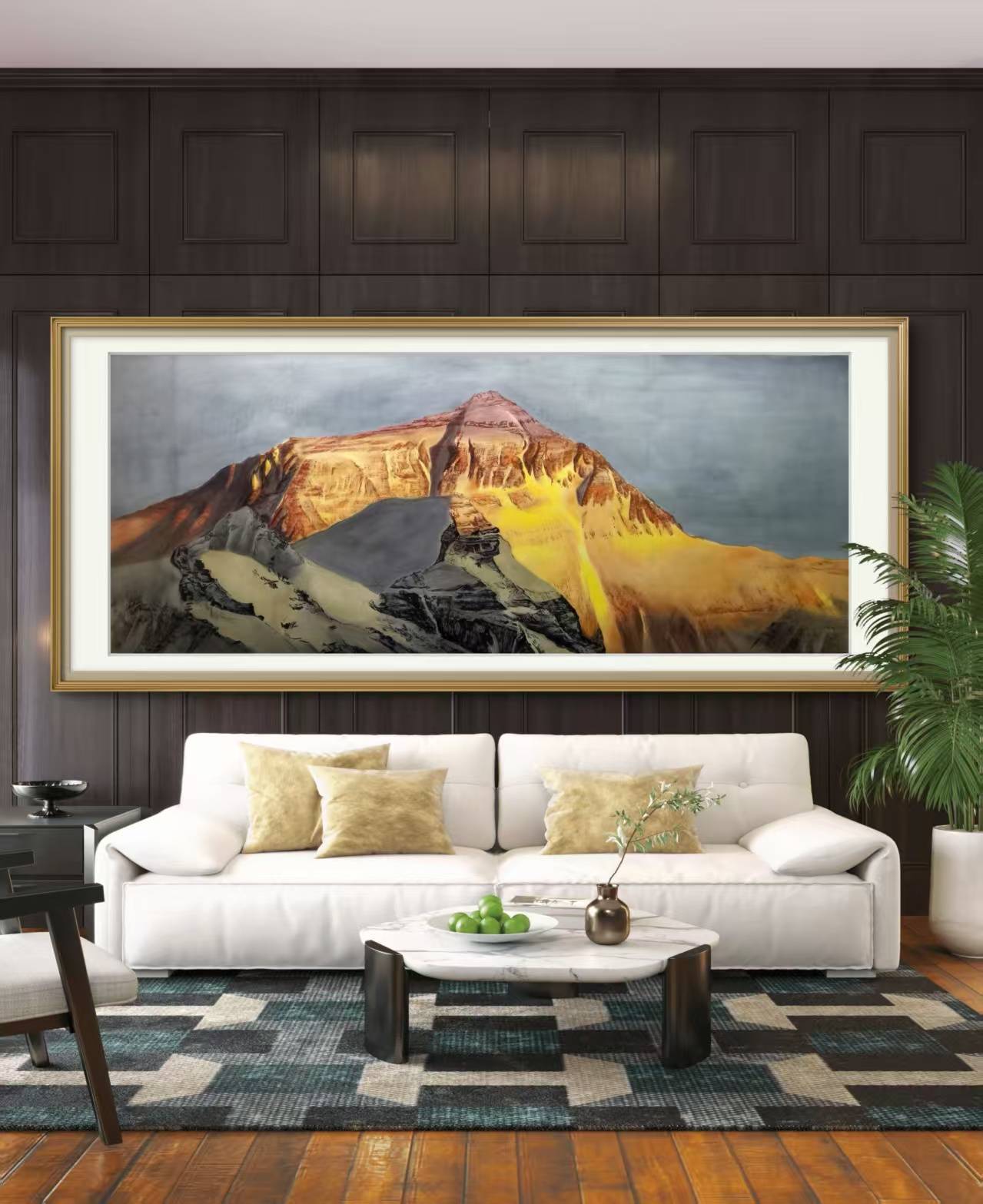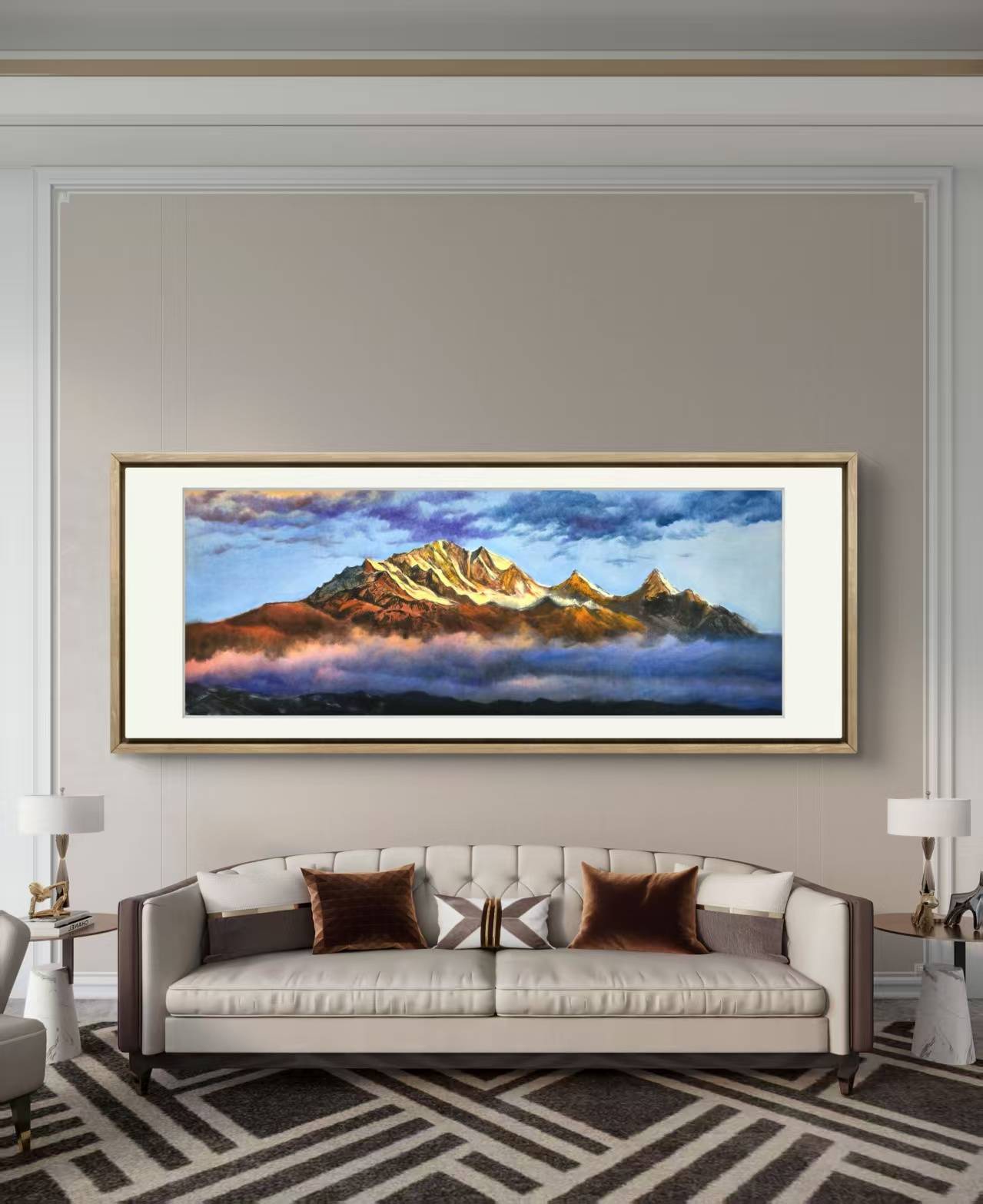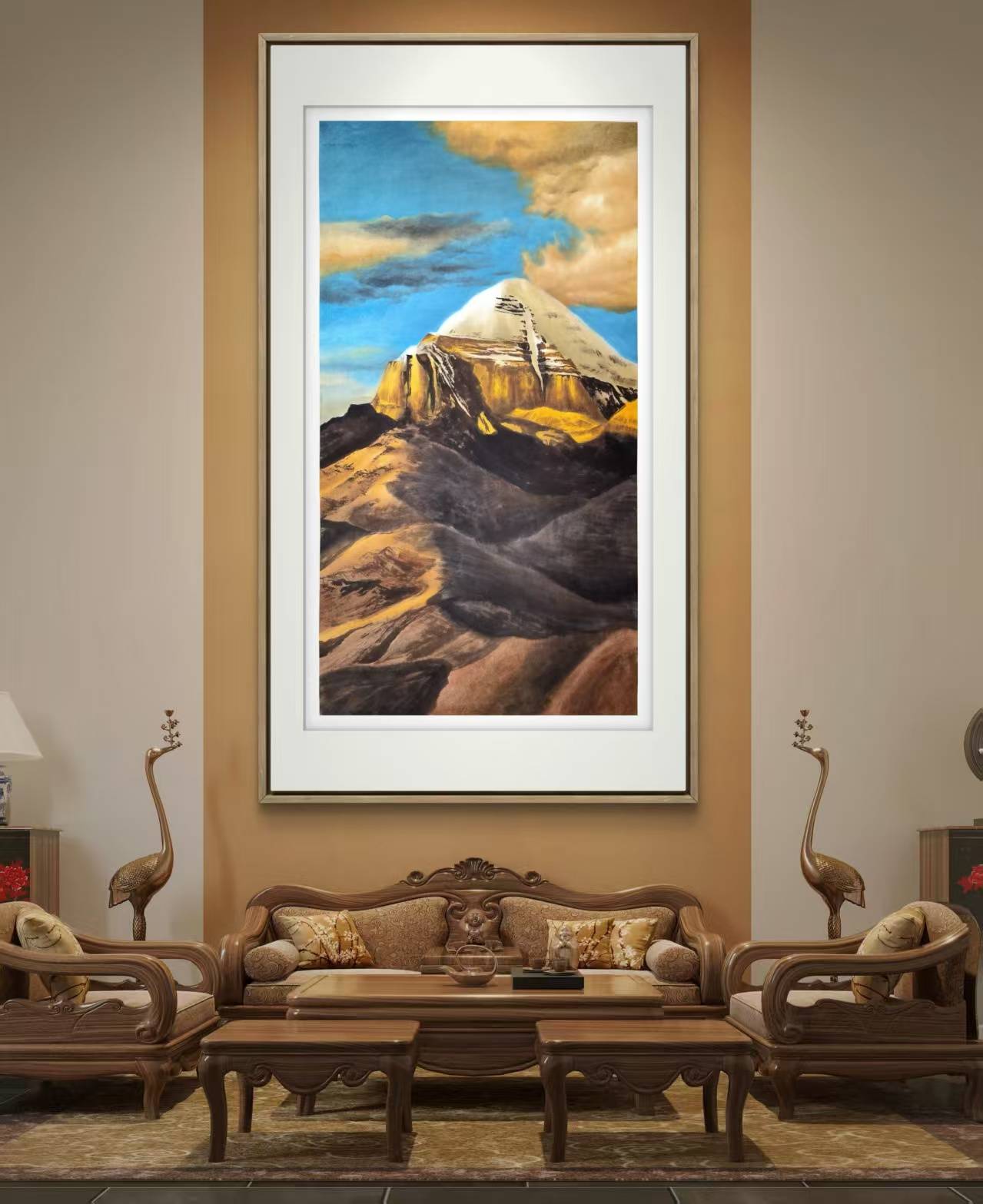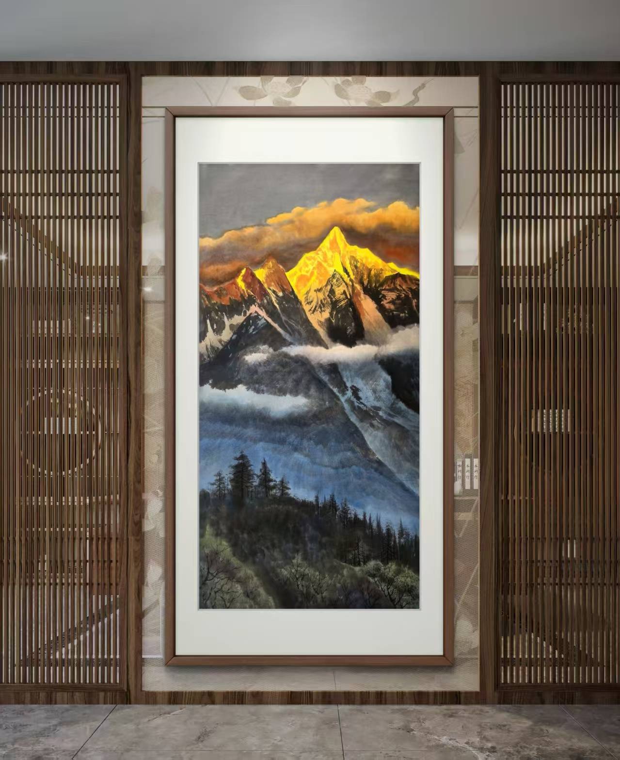 画家为亮早期以创作黄河,大海,长城题材为主,被誉为著名爱国题材画家,近几年走偏国内能呈现自然奇观日照金山的各大名山,4次进入藏区2次进驻珠峰大本营创作大量日照金山作品。