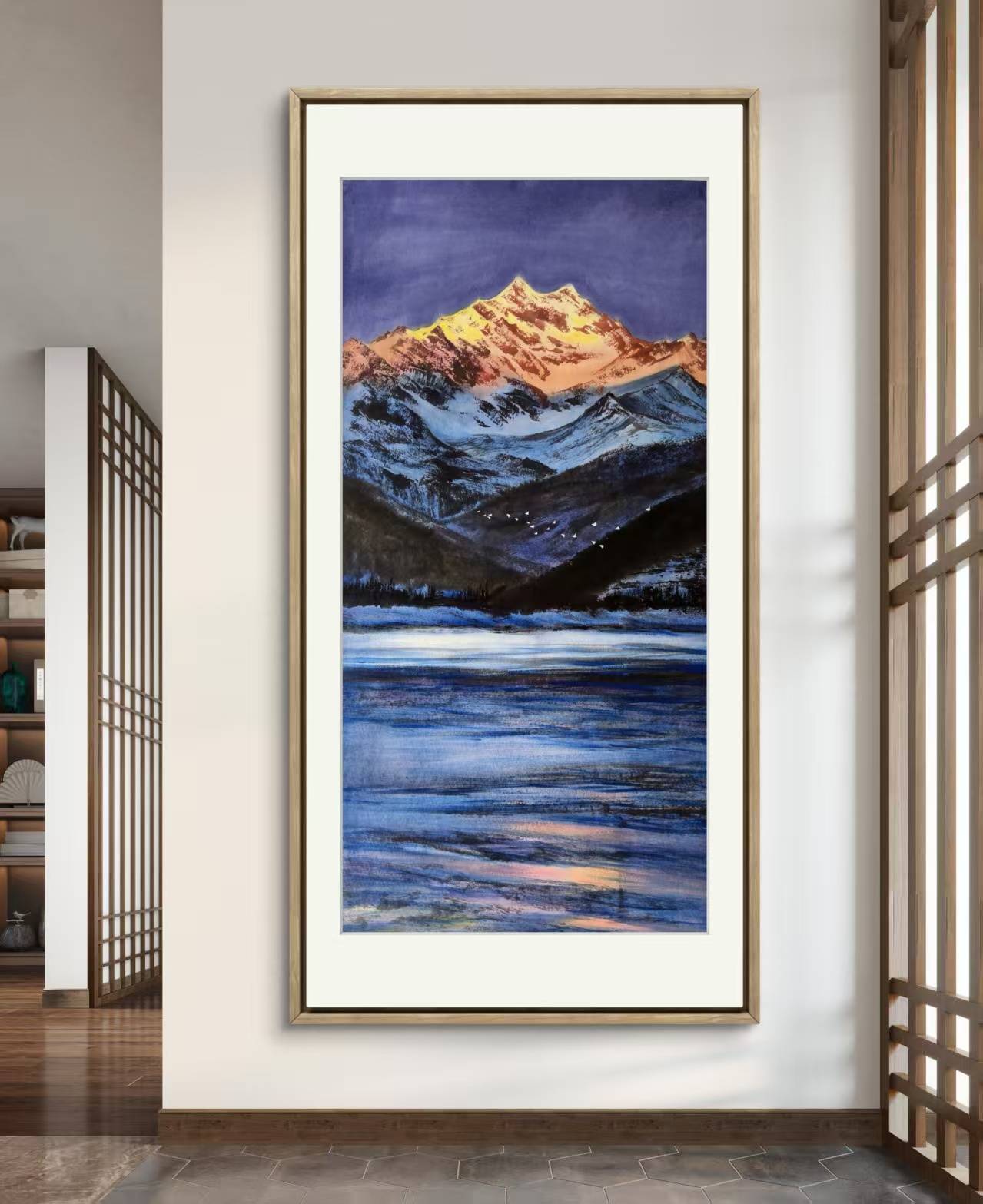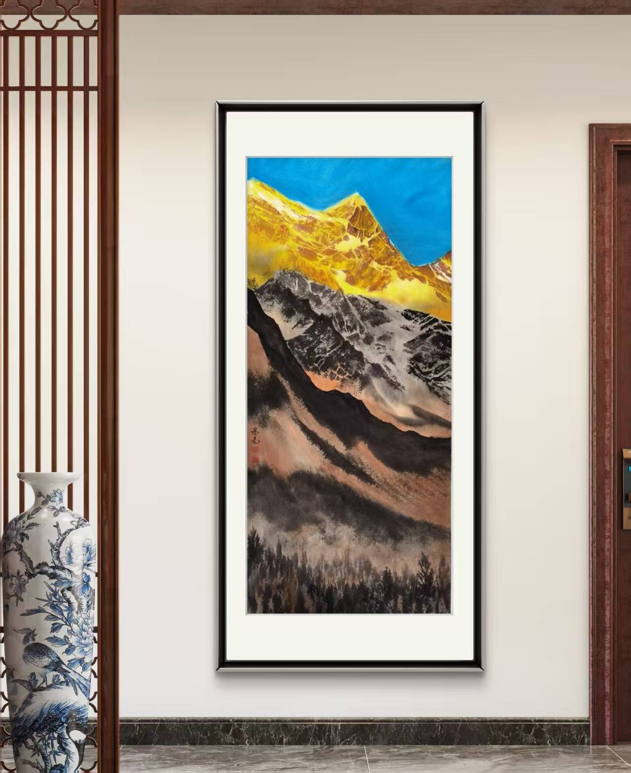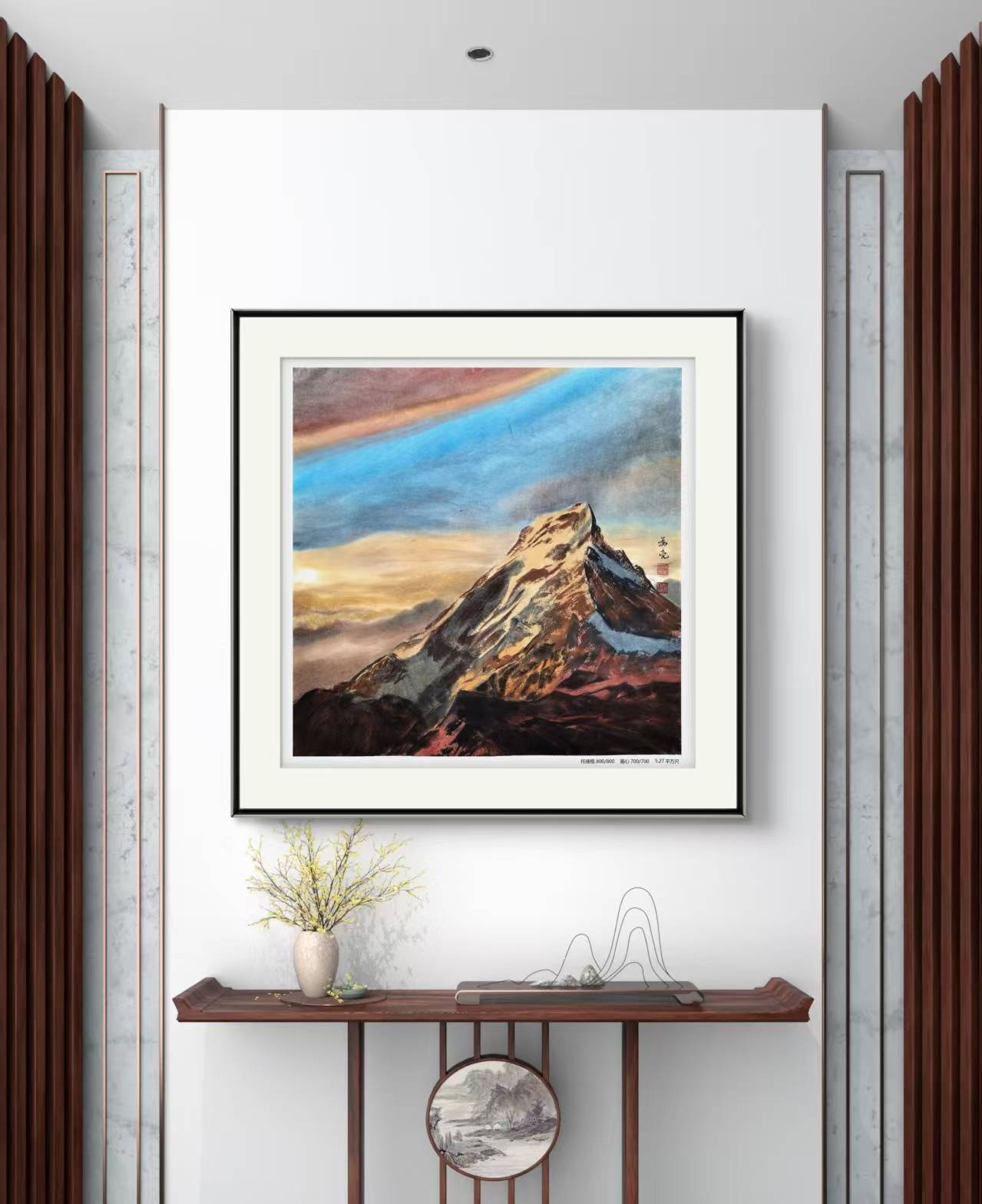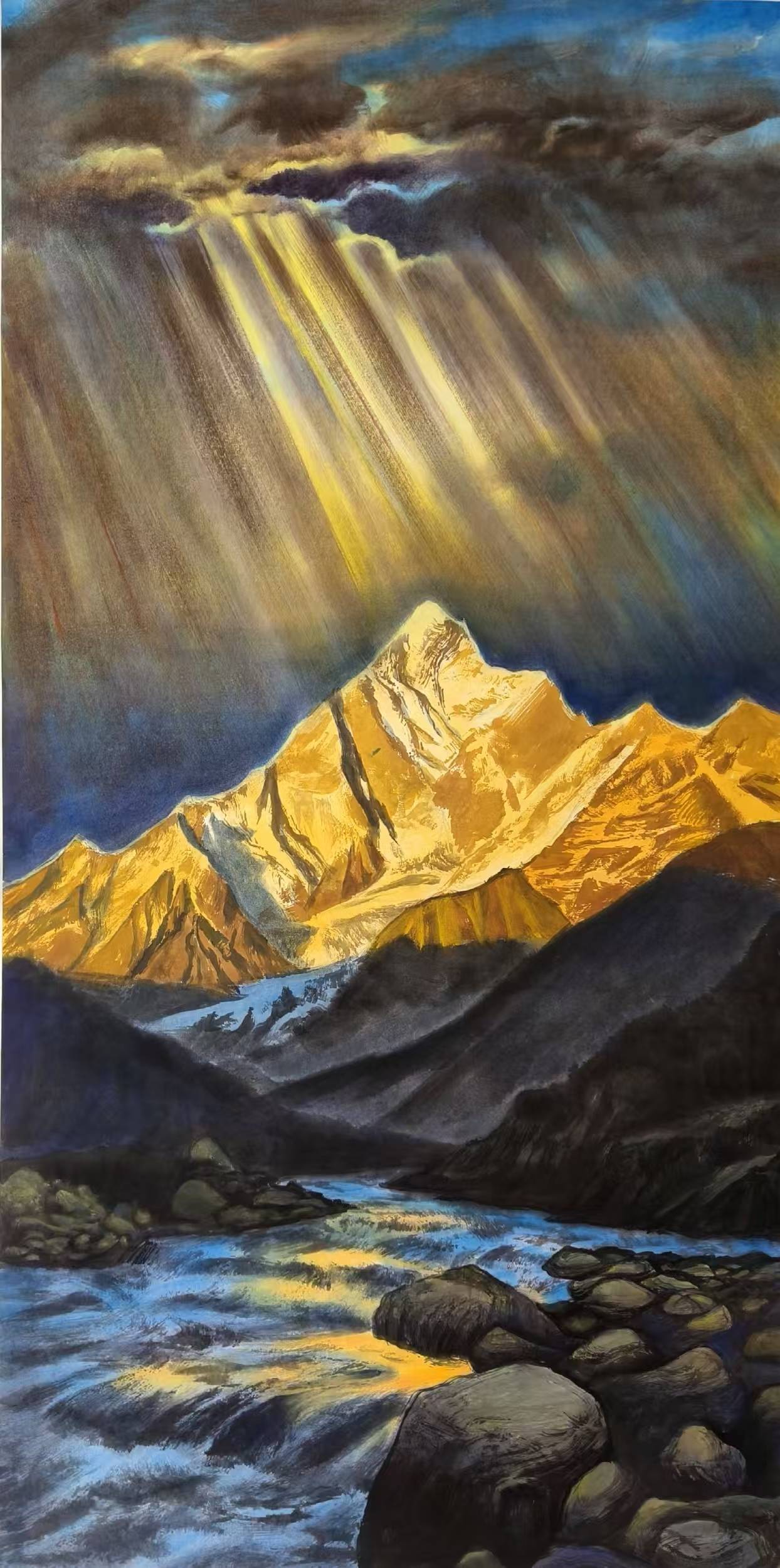 画家为亮早期以创作黄河,大海,长城题材为主,被誉为著名爱国题材画家,近几年走偏国内能呈现自然奇观日照金山的各大名山,4次进入藏区2次进驻珠峰大本营创作大量日照金山作品。