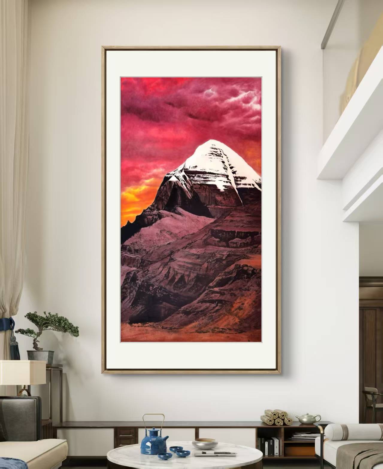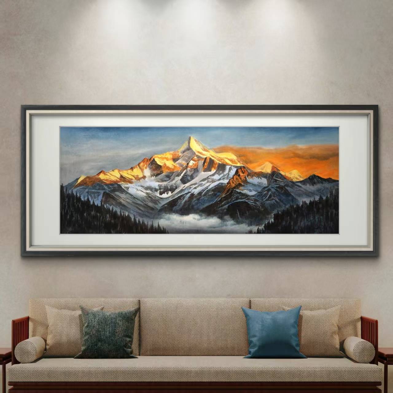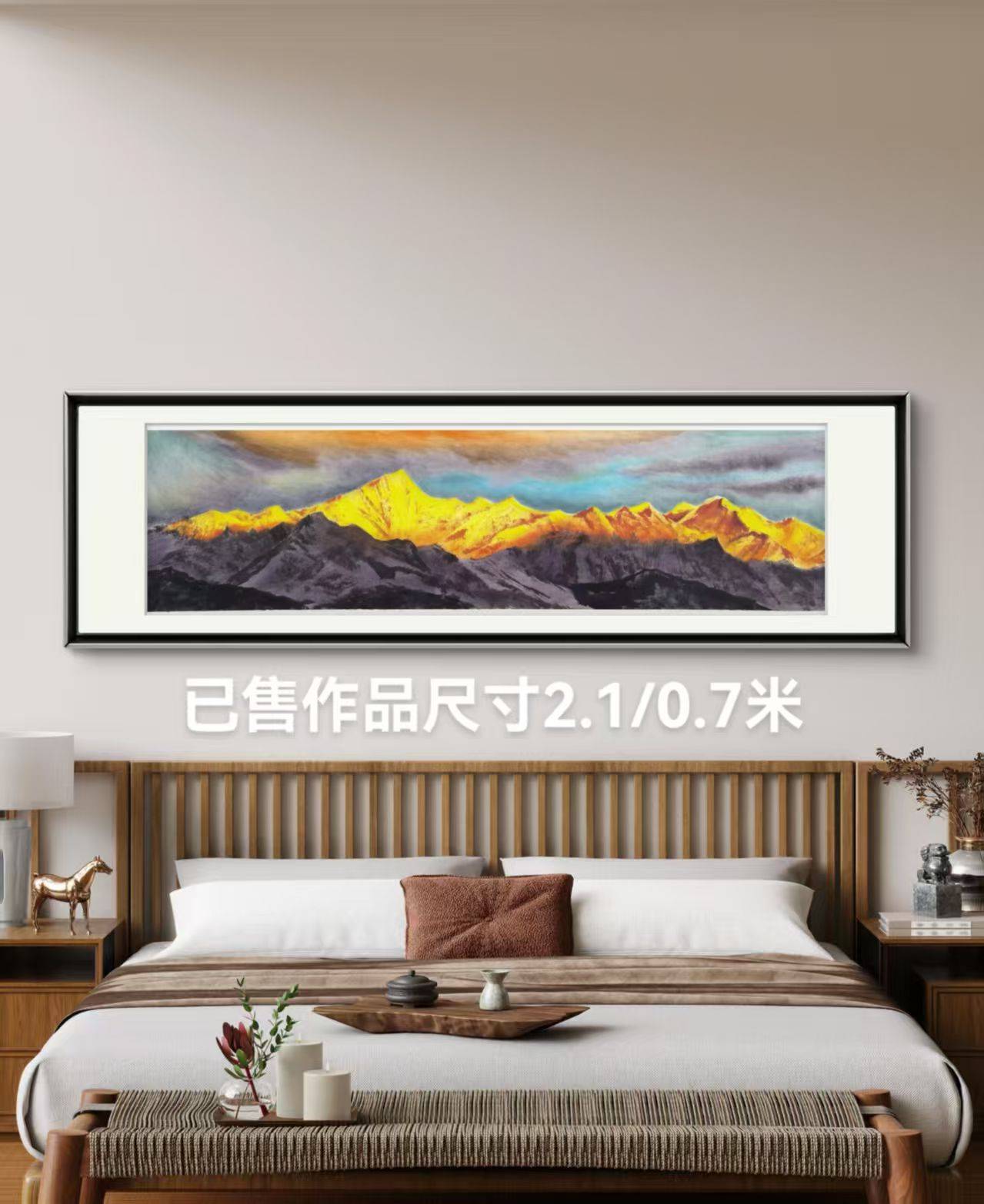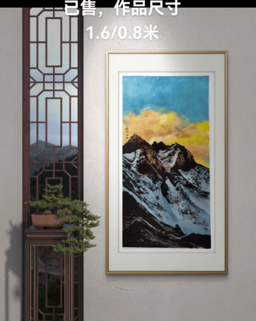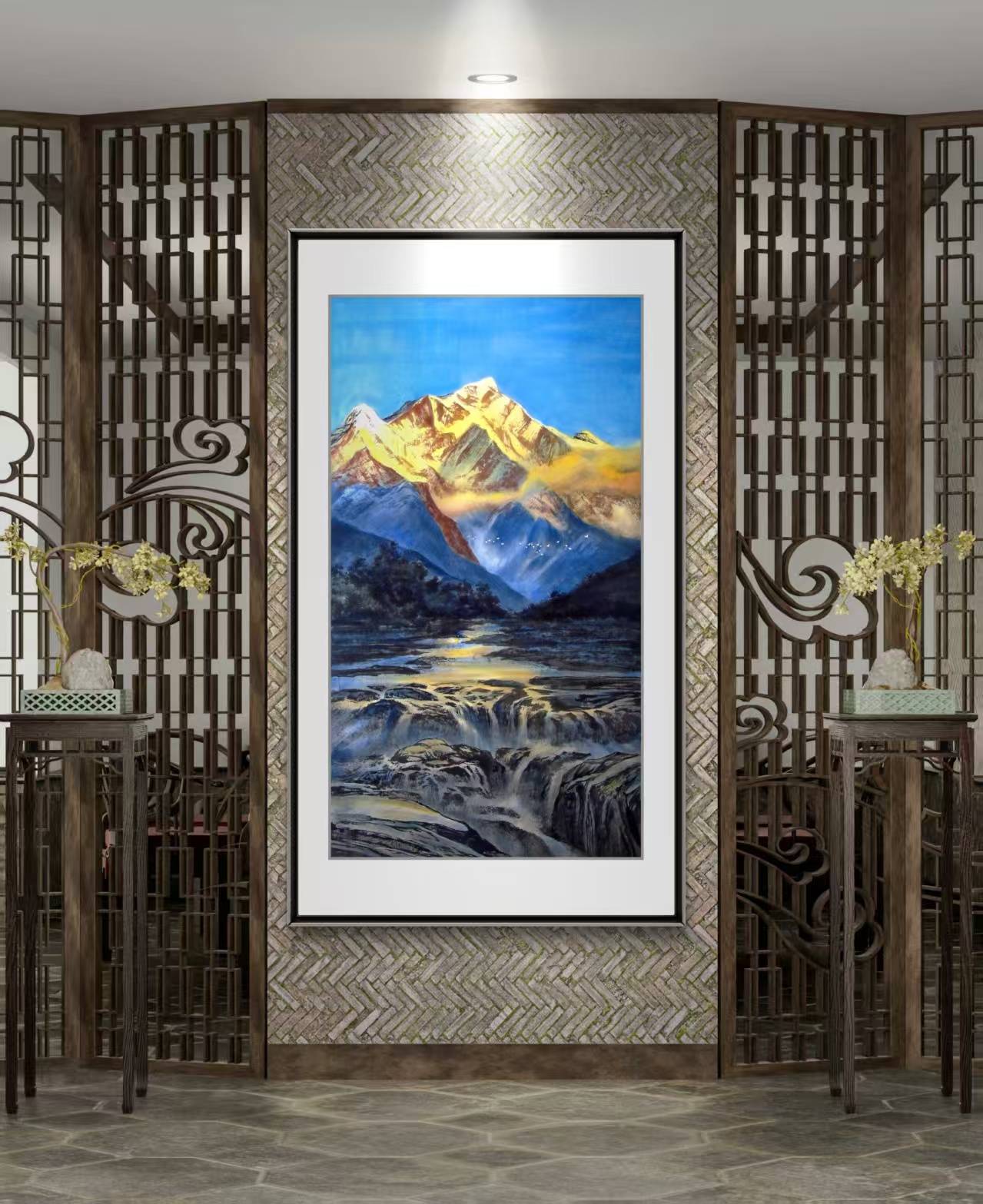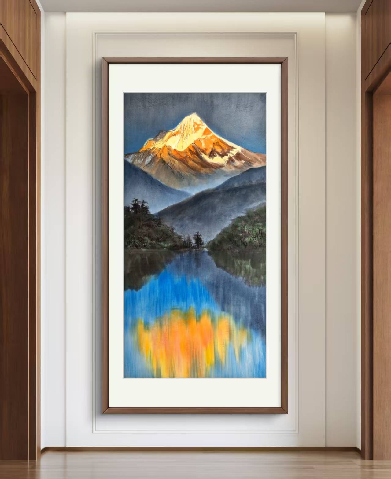 画家为亮早期以创作黄河,大海,长城题材为主,被誉为著名爱国题材画家,近几年走偏国内能呈现自然奇观日照金山的各大名山,4次进入藏区2次进驻珠峰大本营创作大量日照金山作品。