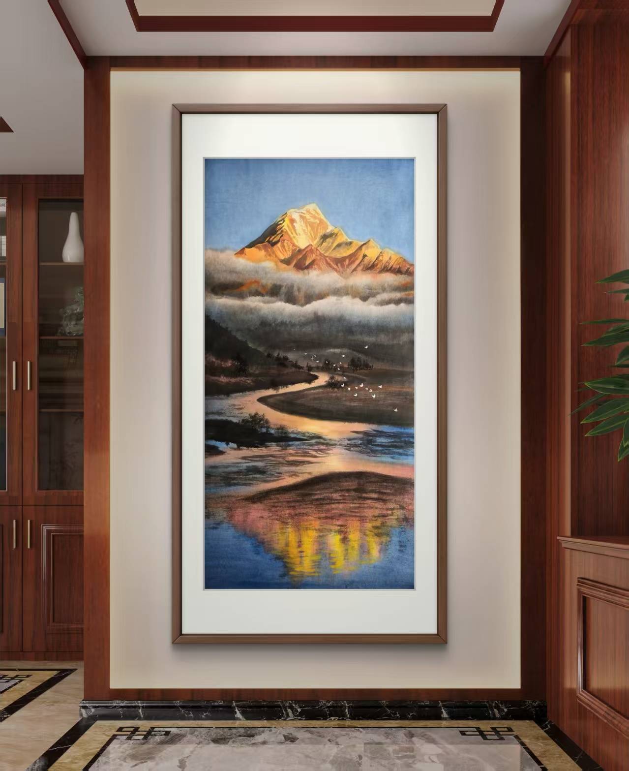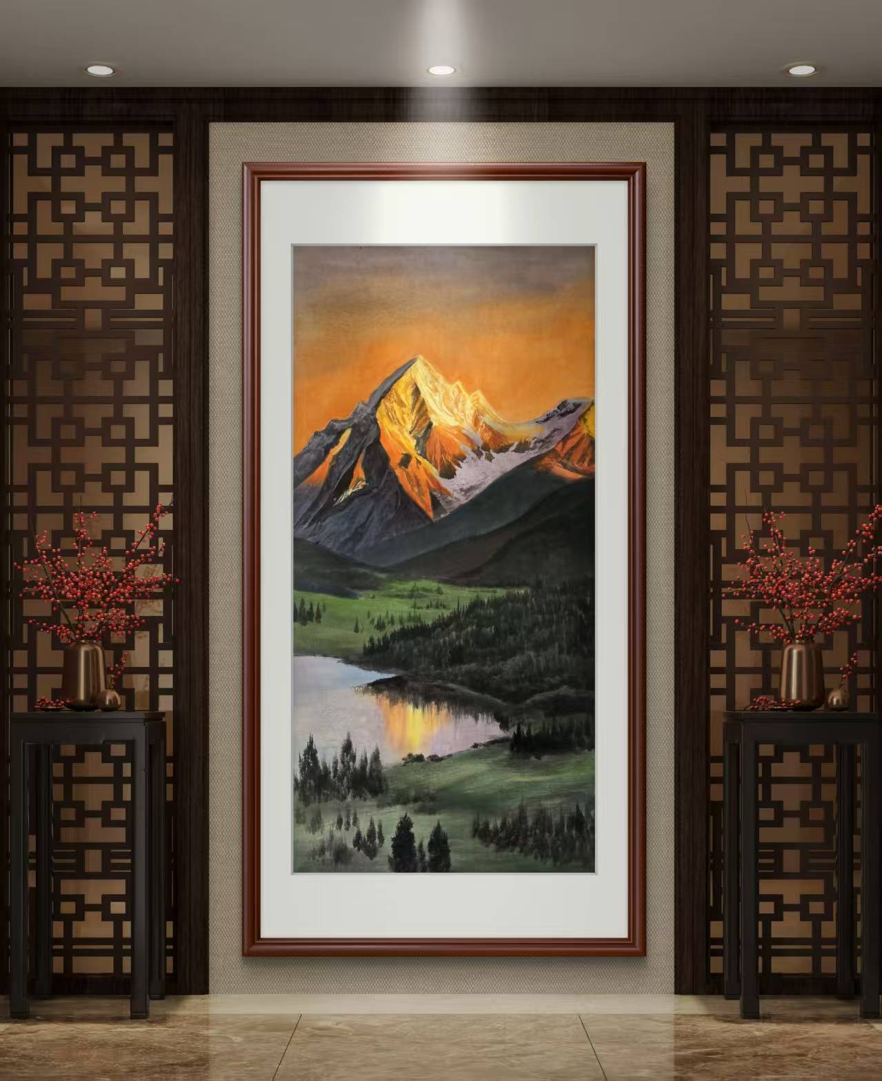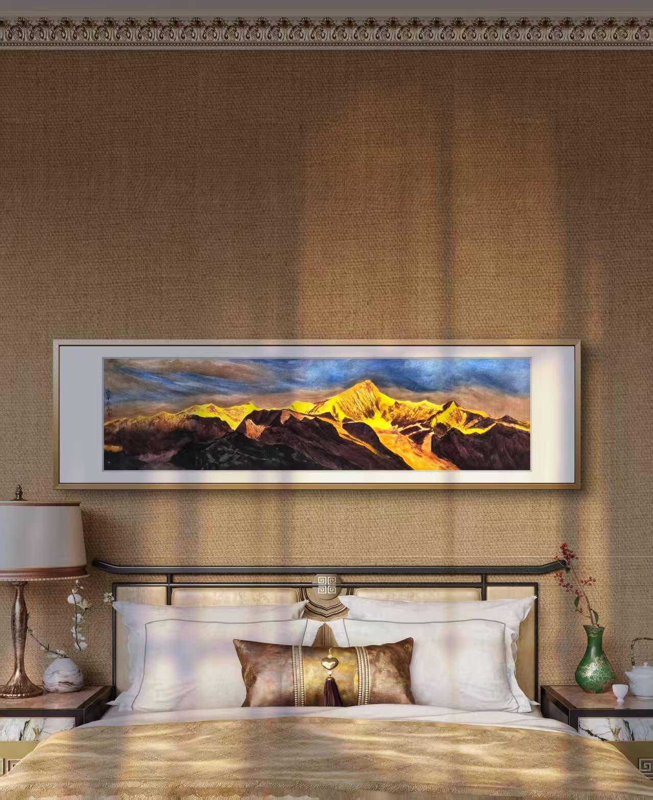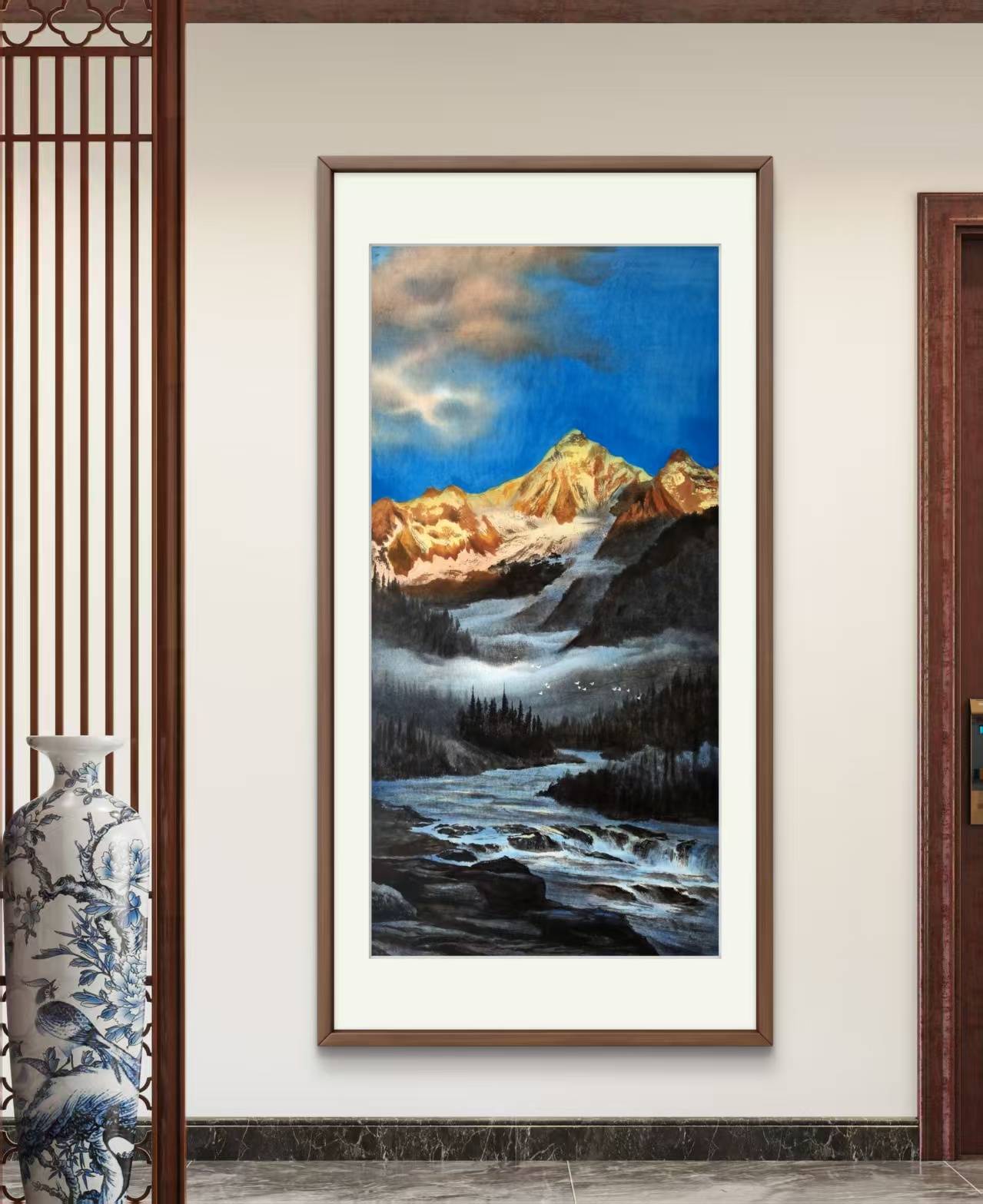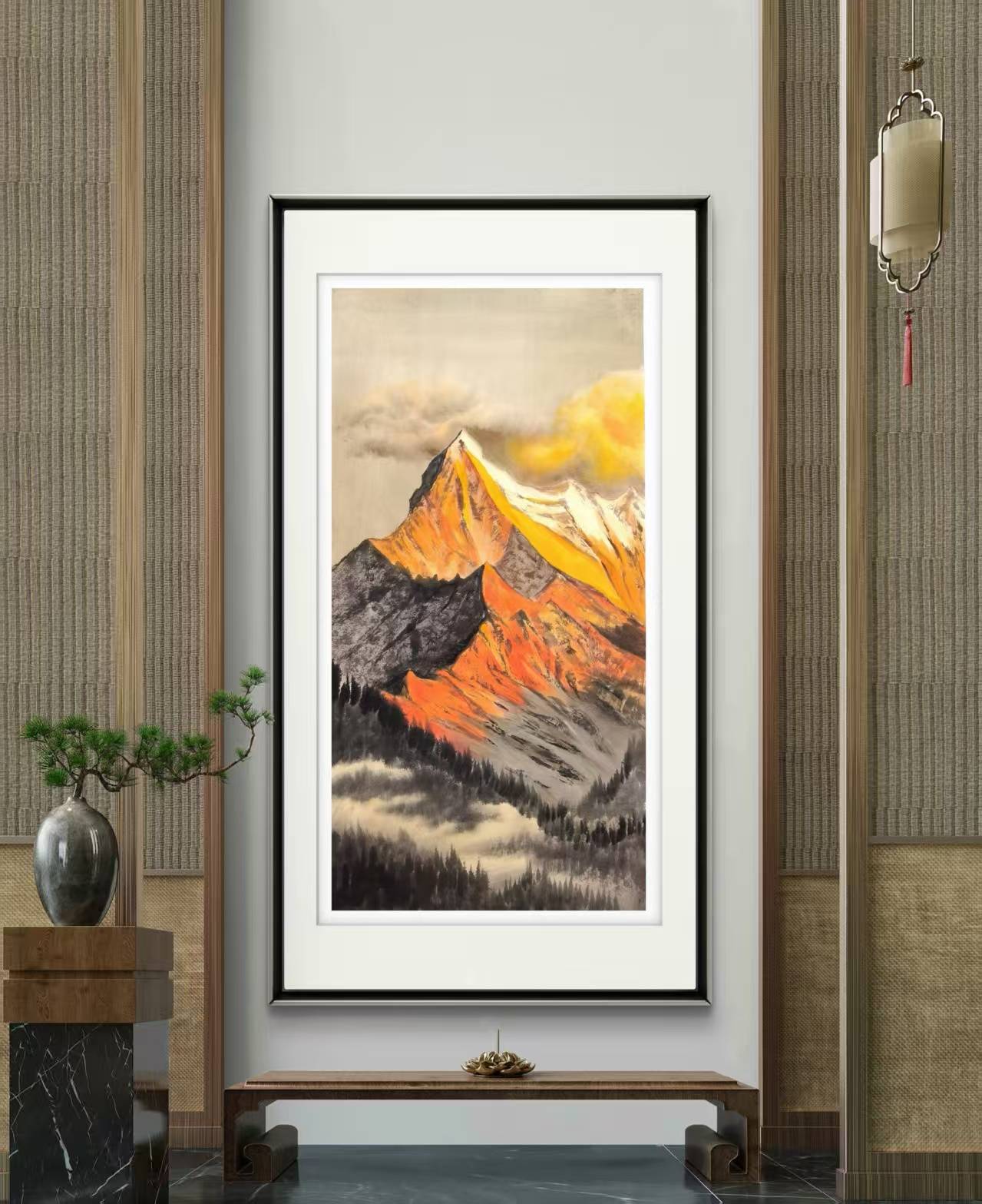 画家为亮早期以创作黄河,大海,长城题材为主,被誉为著名爱国题材画家,近几年走偏国内能呈现自然奇观日照金山的各大名山,4次进入藏区2次进驻珠峰大本营创作大量日照金山作品。