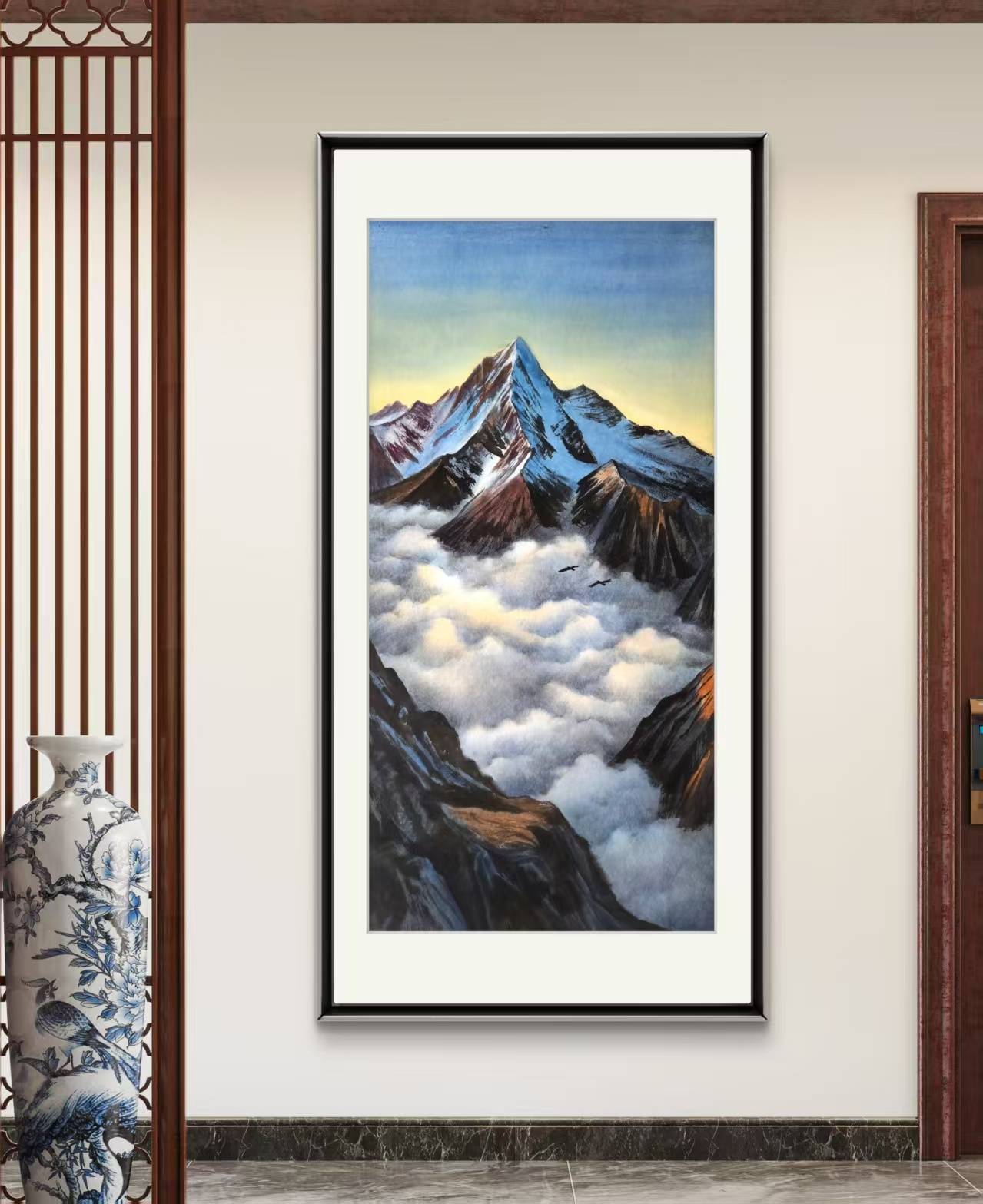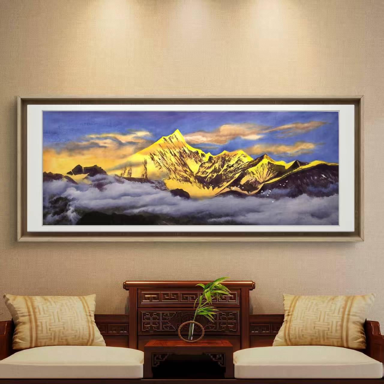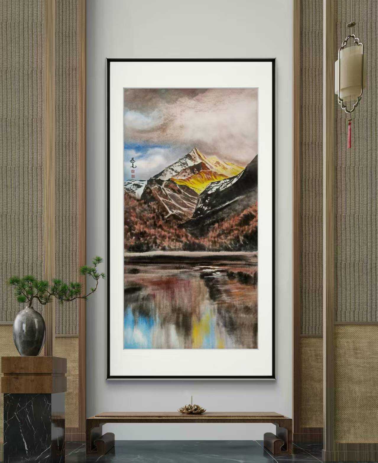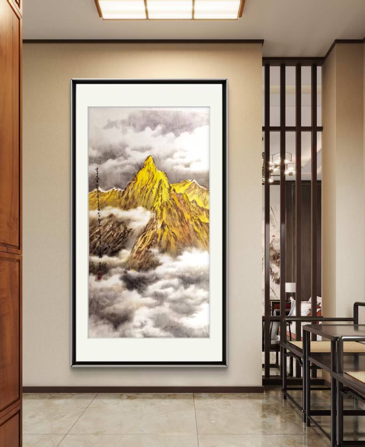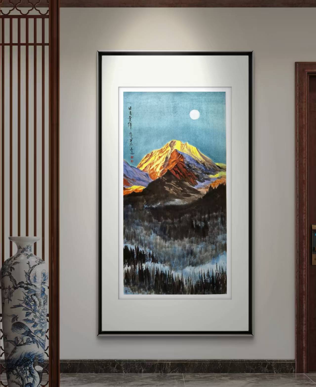 画家为亮早期以创作黄河,大海,长城题材为主,被誉为著名爱国题材画家,近几年走偏国内能呈现自然奇观日照金山的各大名山,4次进入藏区2次进驻珠峰大本营创作大量日照金山作品。
