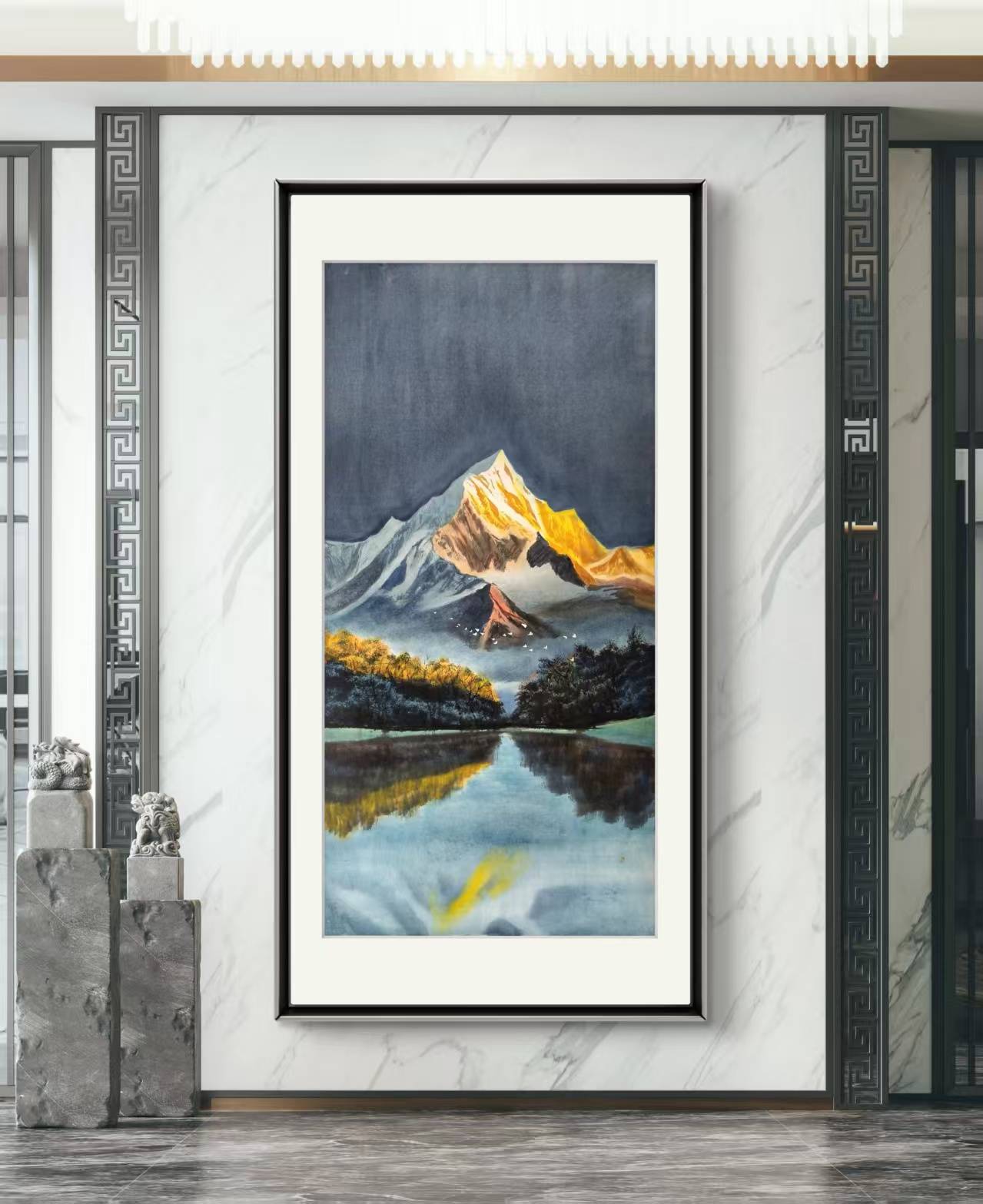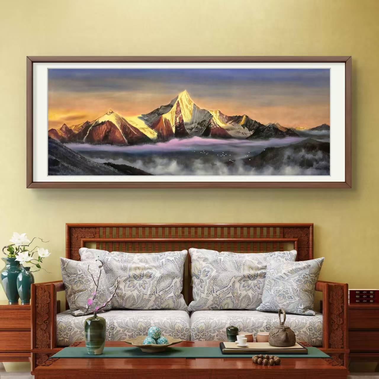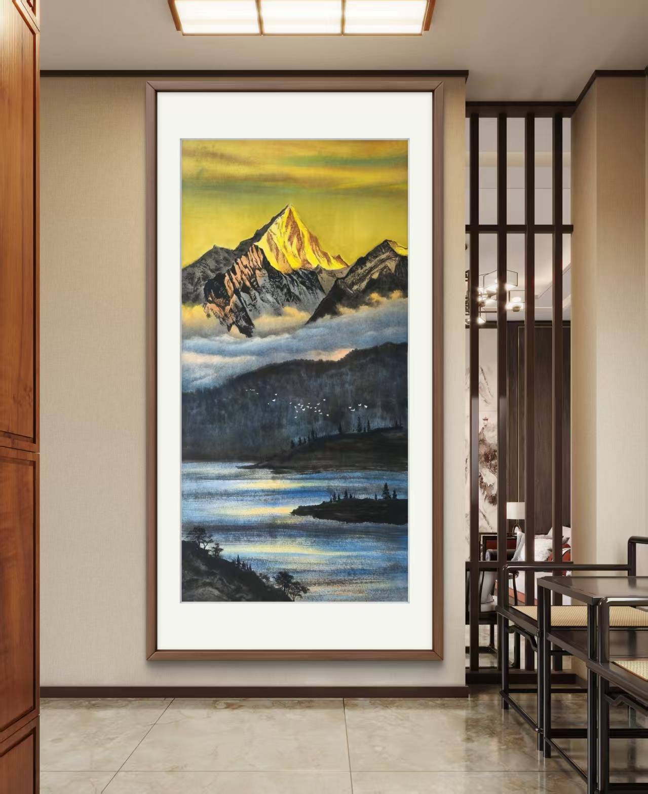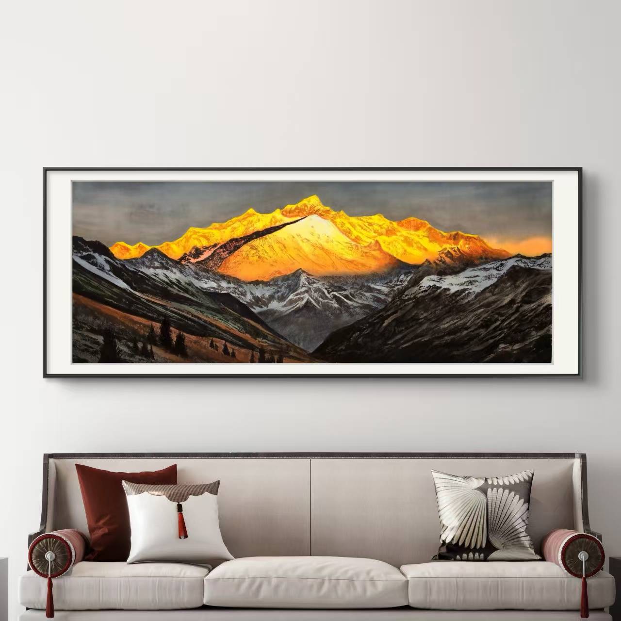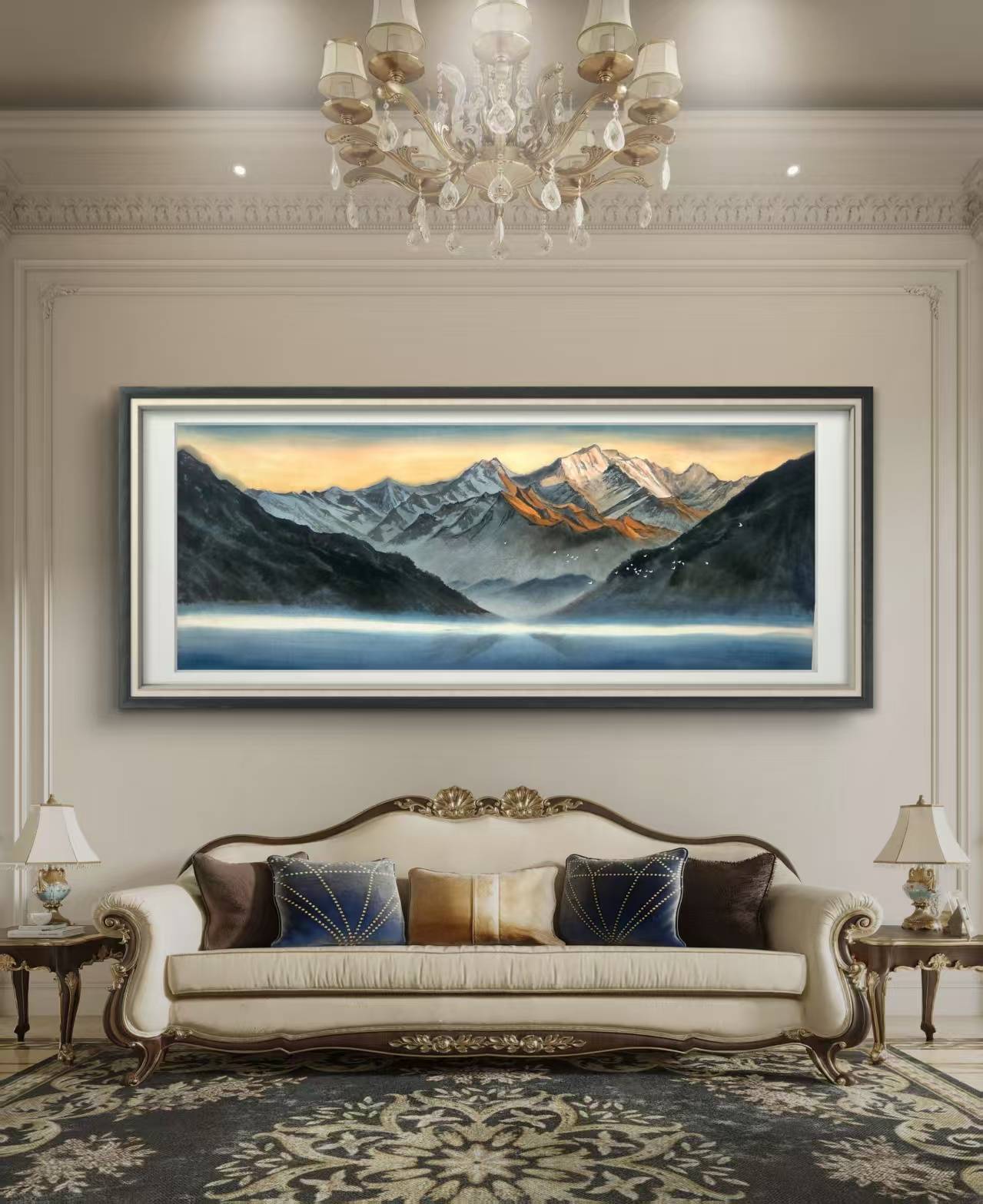 画家为亮早期以创作黄河,大海,长城题材为主,被誉为著名爱国题材画家,近几年走偏国内能呈现自然奇观日照金山的各大名山,4次进入藏区2次进驻珠峰大本营创作大量日照金山作品。