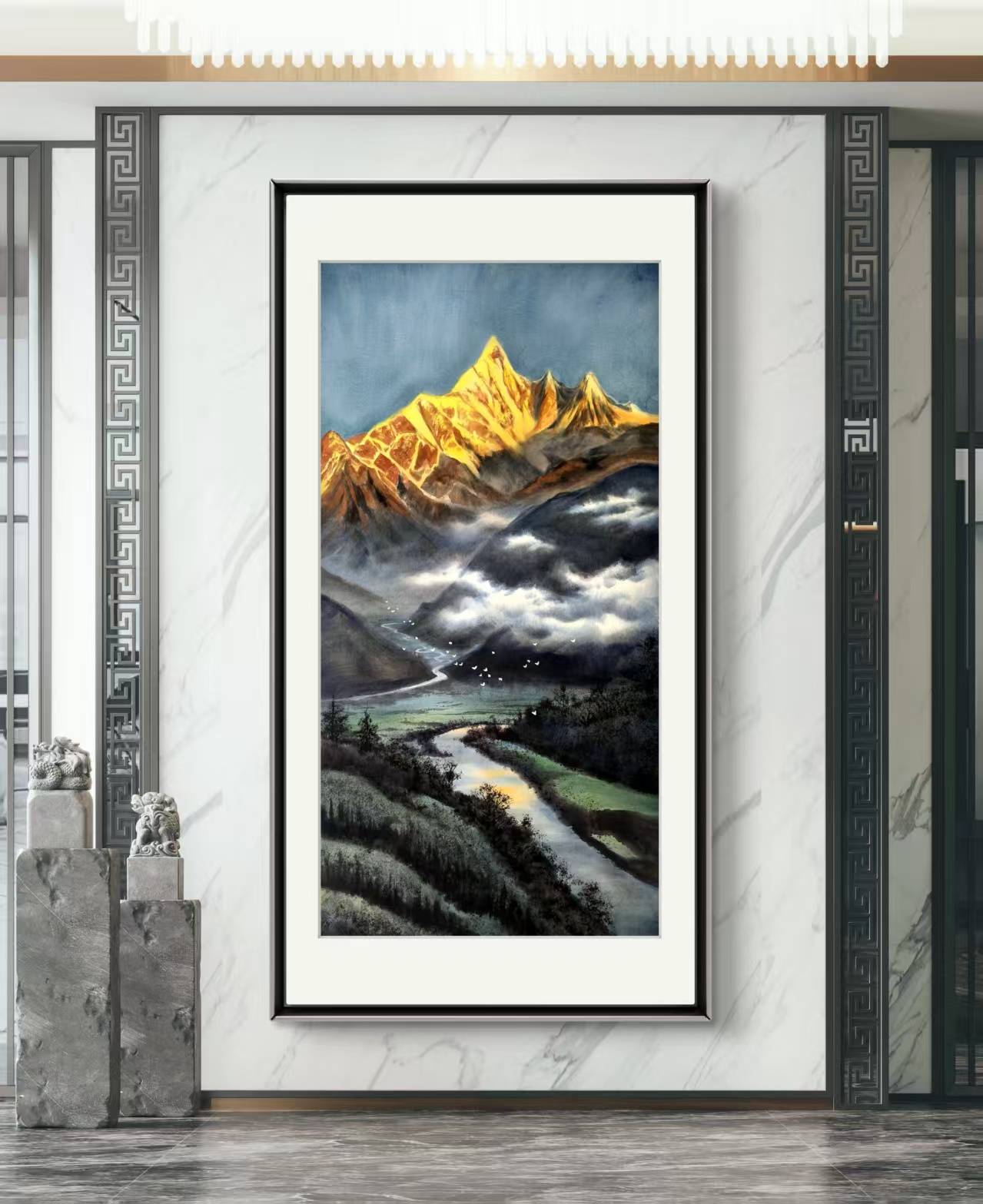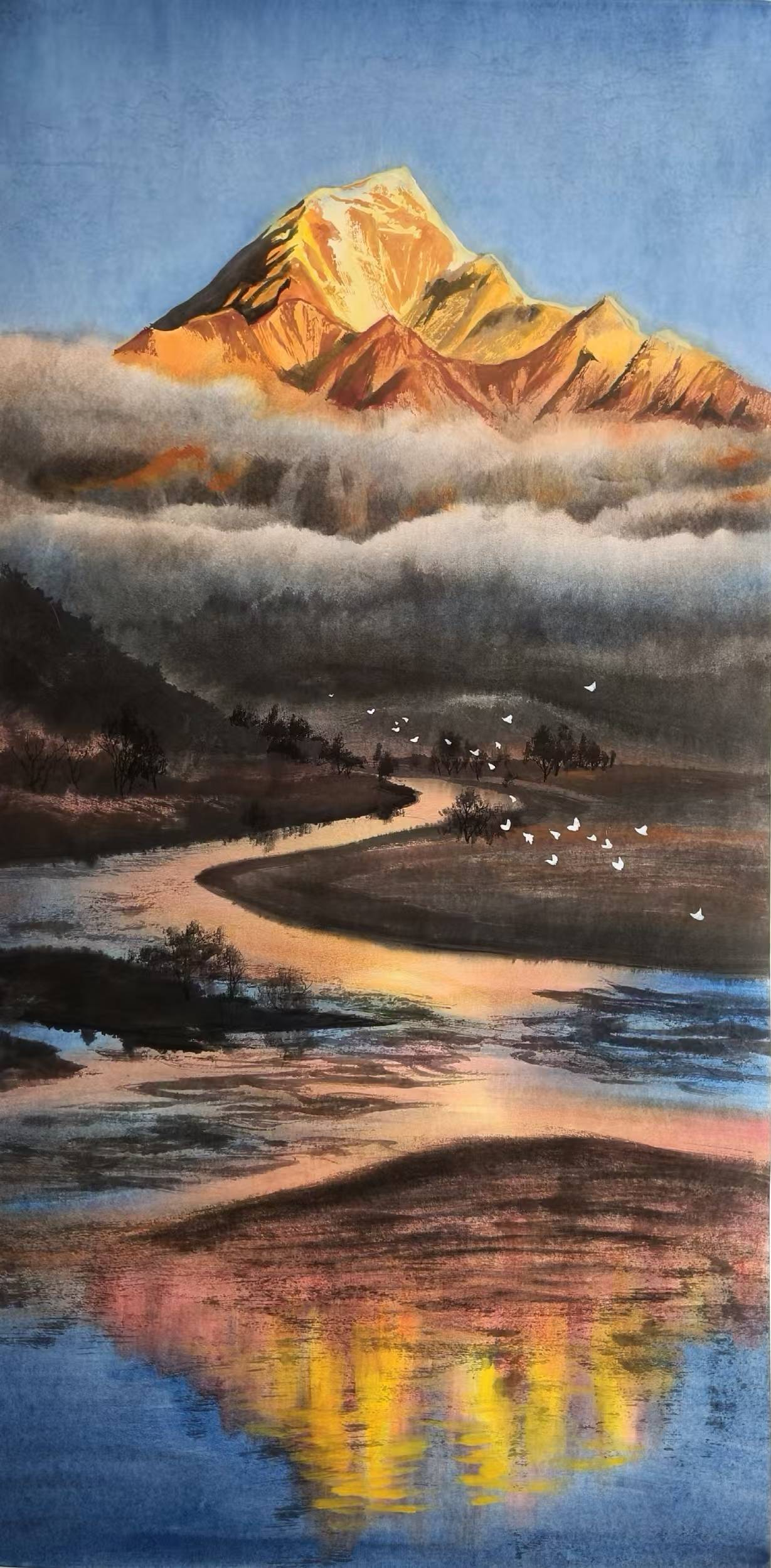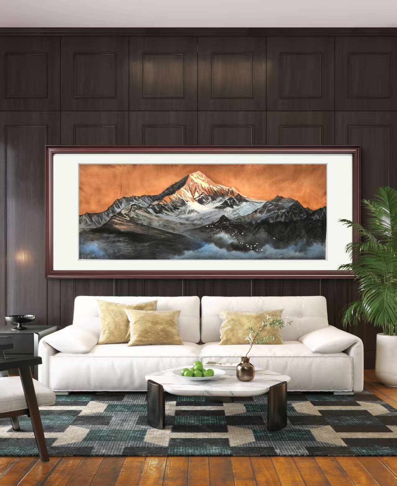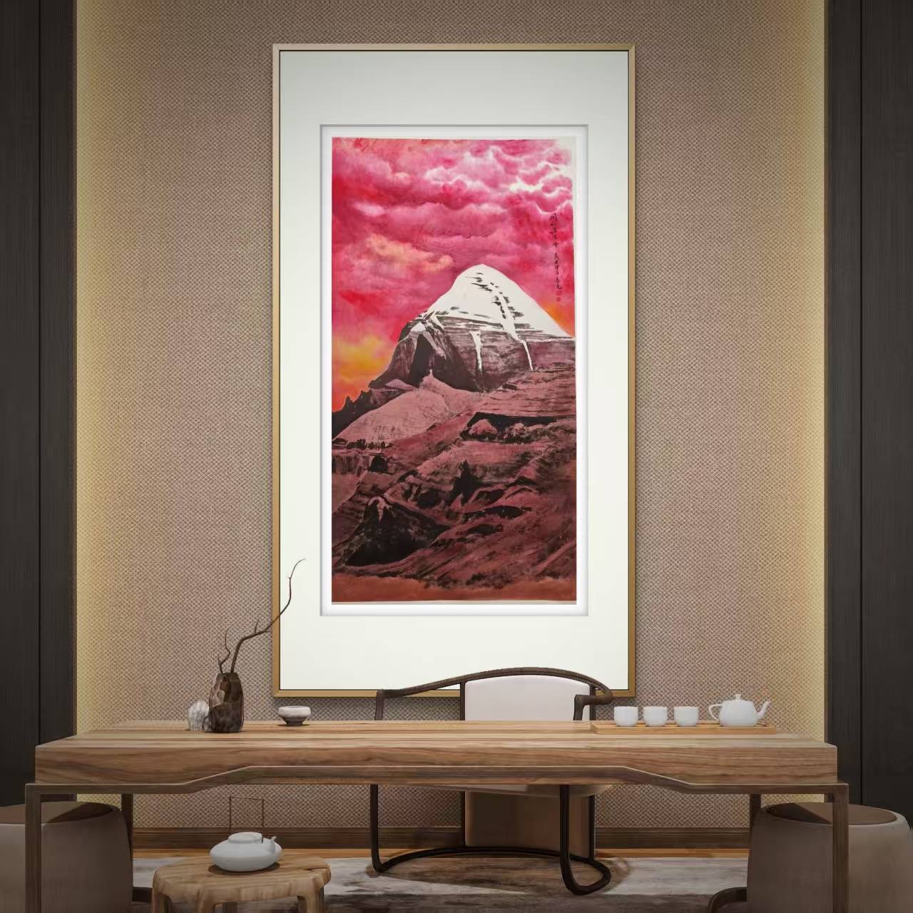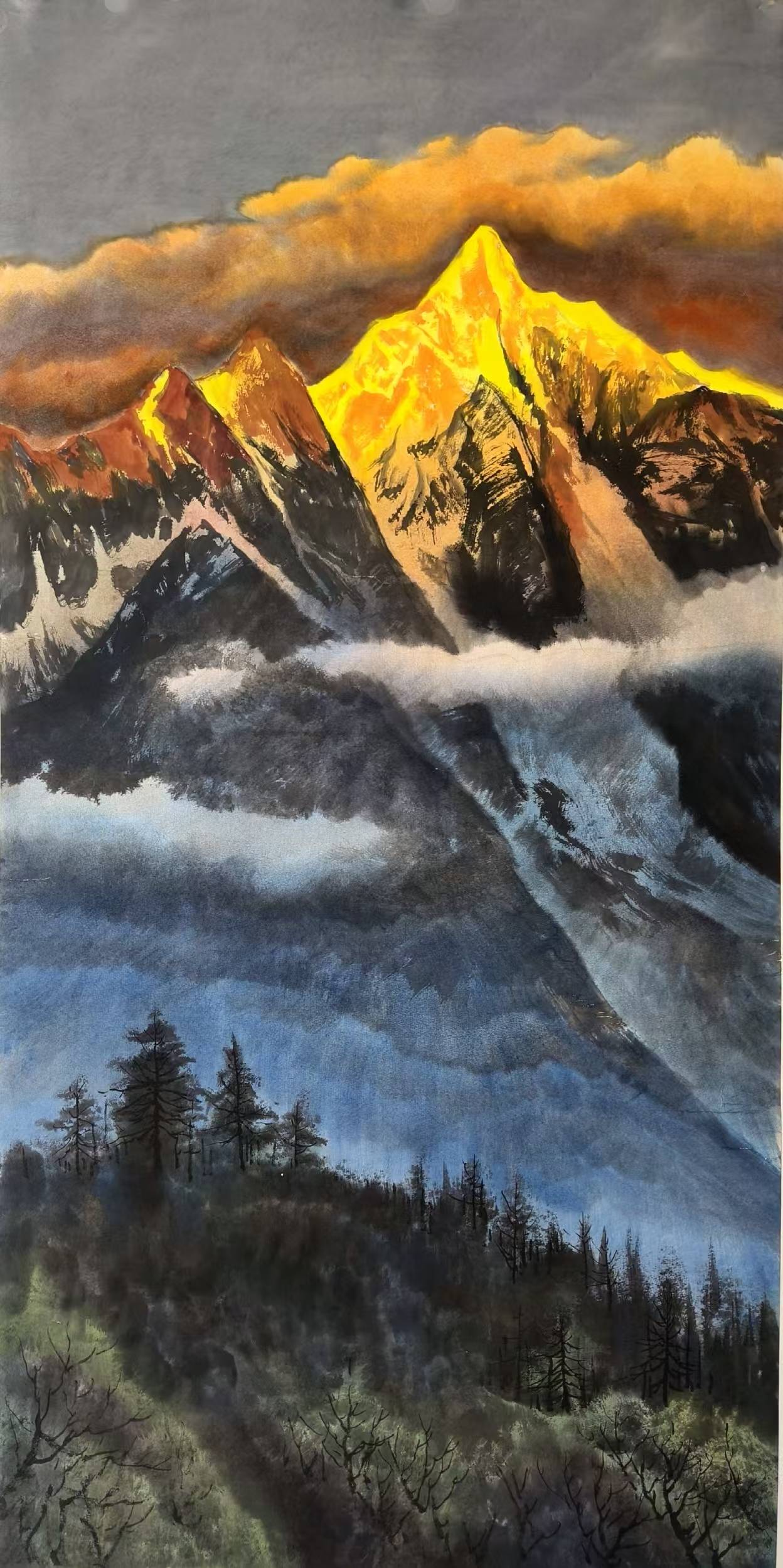 画家为亮早期以创作黄河,大海,长城题材为主,被誉为著名爱国题材画家,近几年走偏国内能呈现自然奇观日照金山的各大名山,4次进入藏区2次进驻珠峰大本营创作大量日照金山作品。