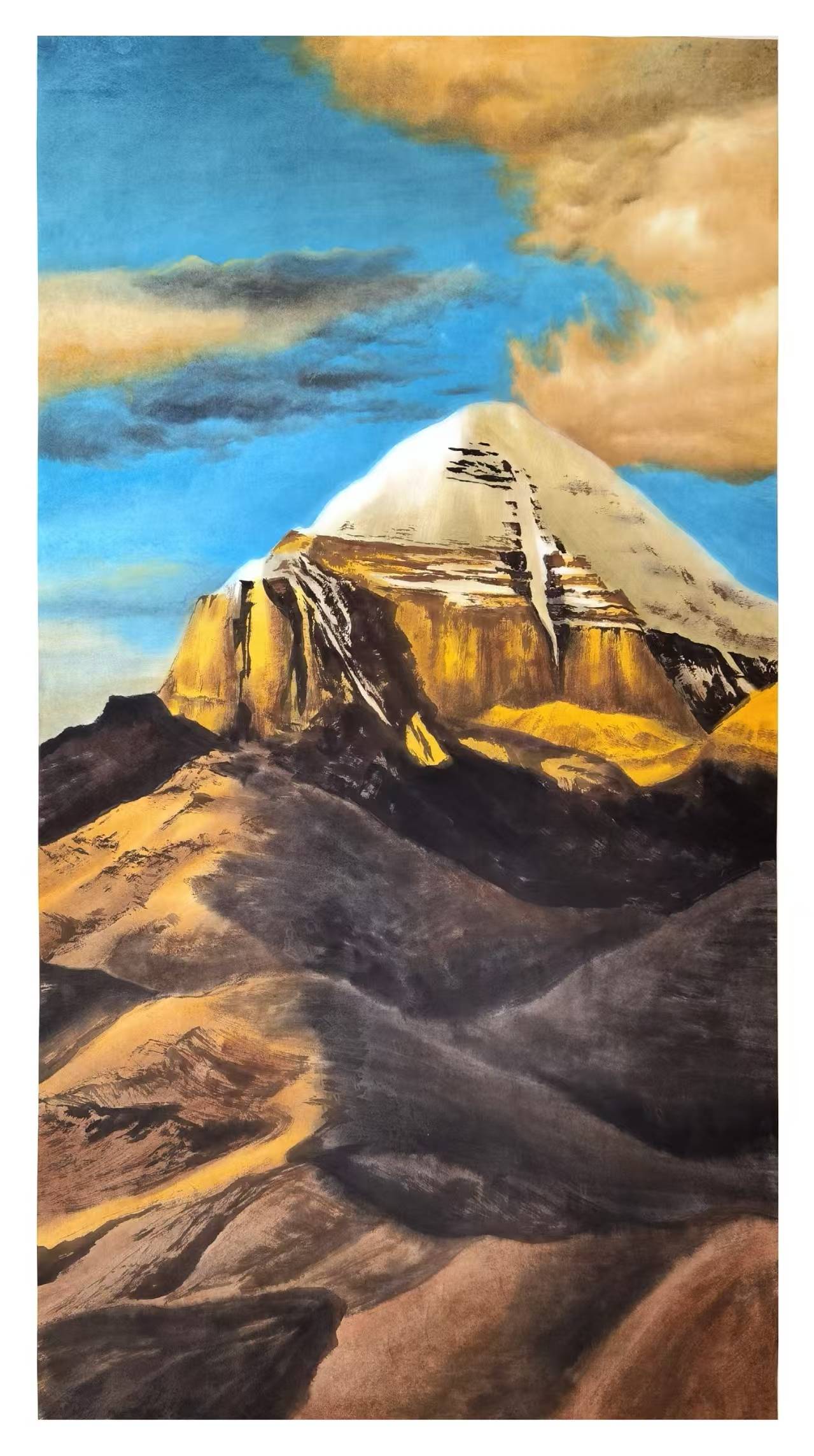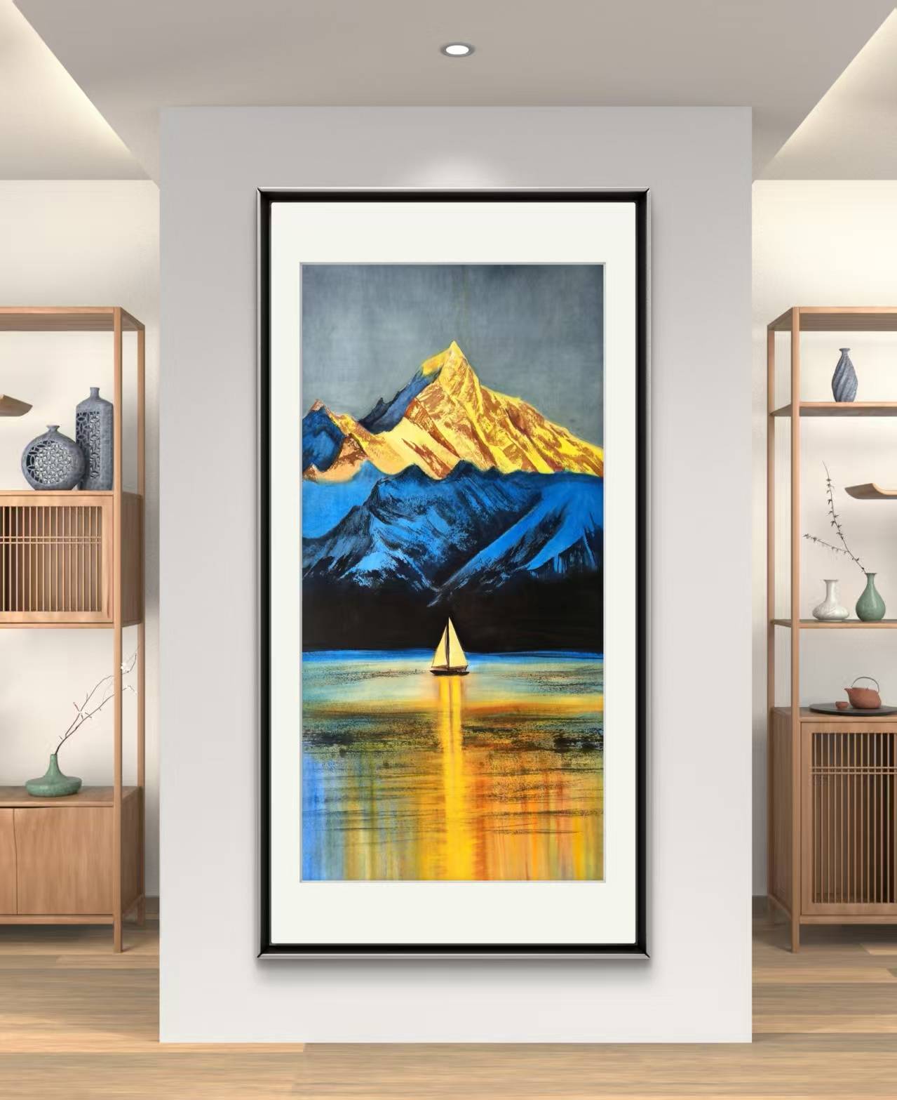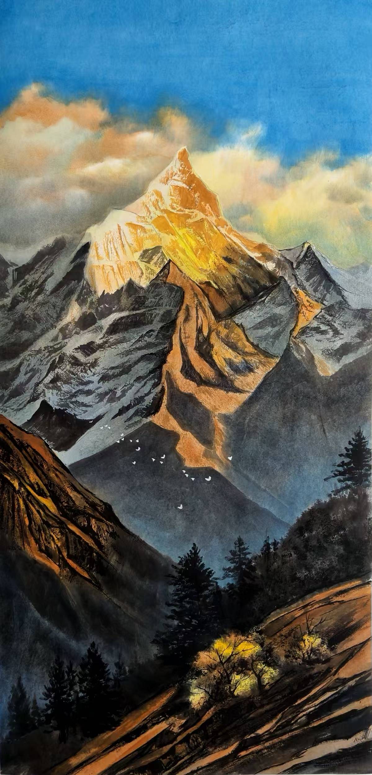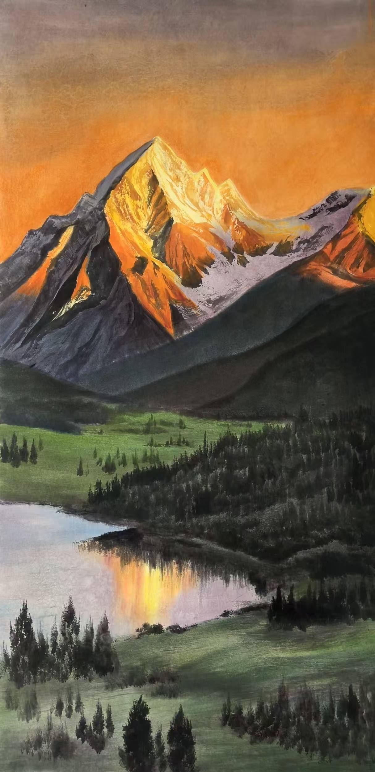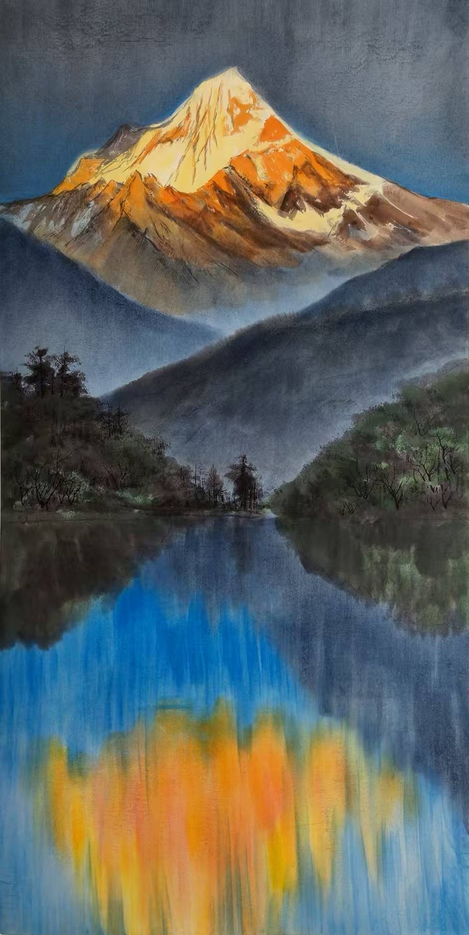 画家为亮早期以创作黄河,大海,长城题材为主,被誉为著名爱国题材画家,近几年走偏国内能呈现自然奇观日照金山的各大名山,4次进入藏区2次进驻珠峰大本营创作大量日照金山作品。