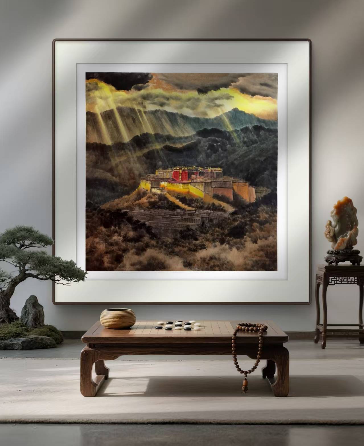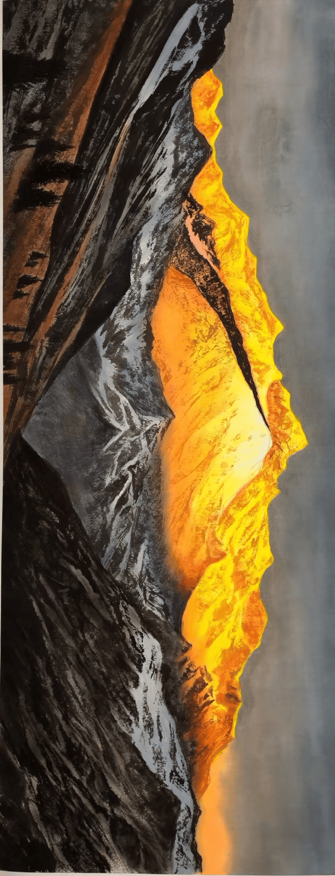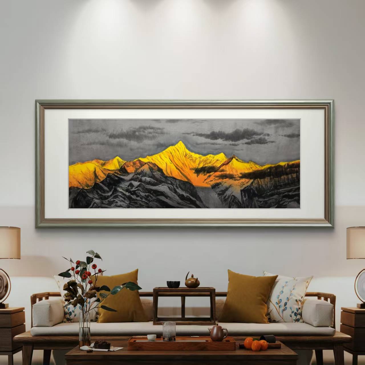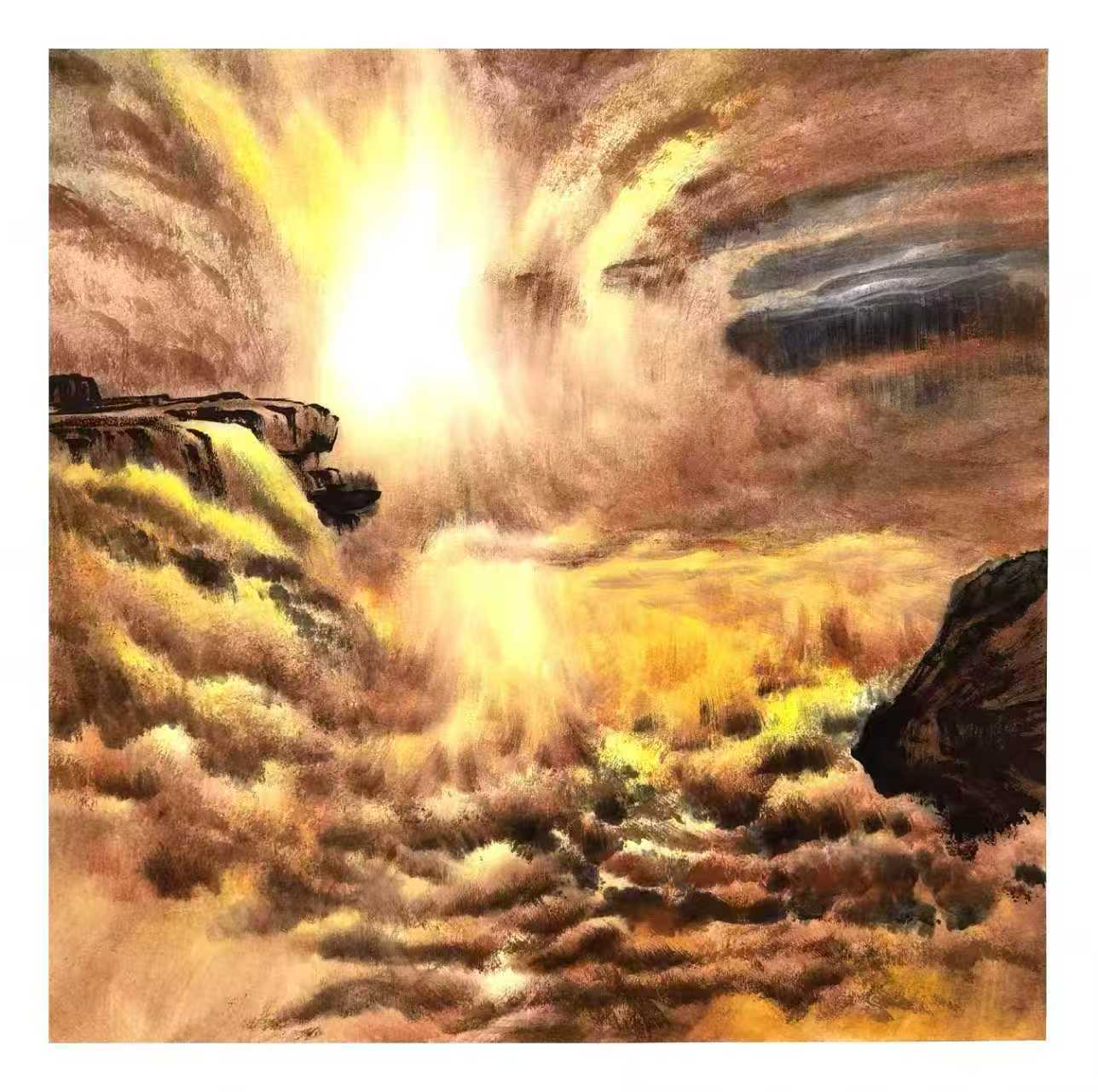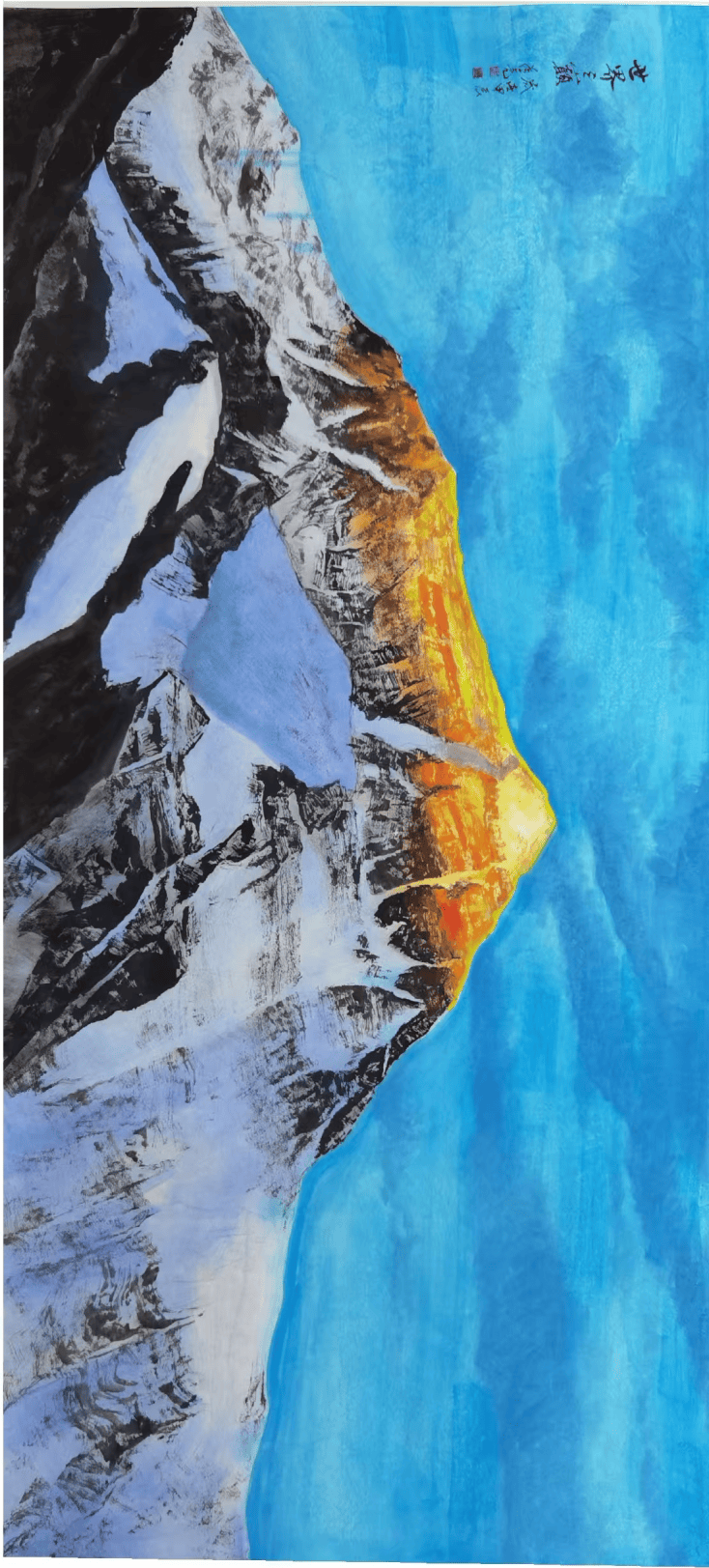 画家为亮早期以创作黄河,大海,长城题材为主,被誉为著名爱国题材画家,近几年走偏国内能呈现自然奇观日照金山的各大名山,4次进入藏区2次进驻珠峰大本营创作大量日照金山作品。