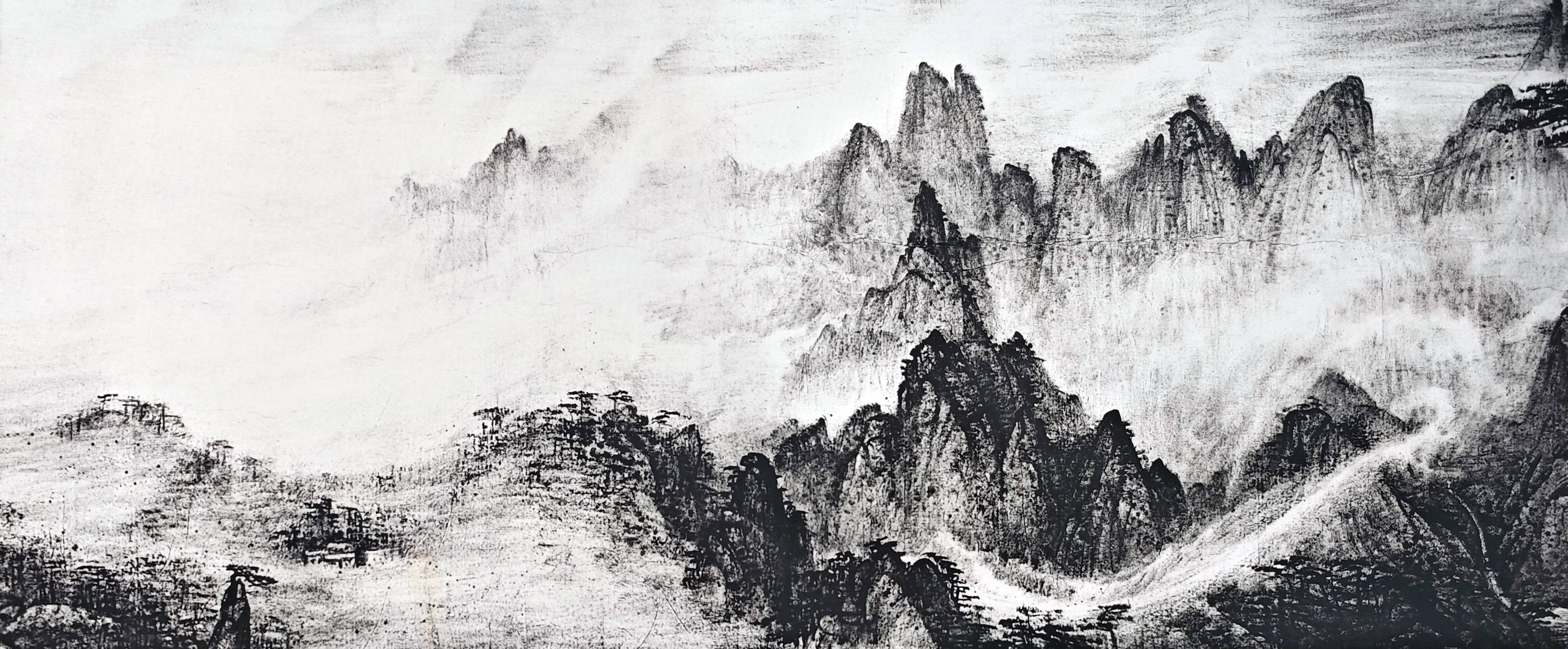 朱峰的焦墨艺术实践,本质上可视为一场现象学的视觉探索。他创作《五百里黄山神游图卷》时 “既不翻阅以往的任何一张自己的写生习作,也不参考任何一幅古人的长卷印刷品,凭直觉灵感的迸溢,信手涂去”【1】,他凭借凝练的笔墨语言,采用“减笔”策略,主动搁置传统山水画的程式经验,大胆突破散点透视的视觉惯性,运用分形几何原理的排线技法,用复笔勾勒山石的自相似结构和云雾的流动走向,重构山石造型。同时采用拓底肌理技法,通过渴笔皴擦的形态学转换,捕捉山水在纯粹直观中的自我显现,实现了对胡塞尔“悬搁”概念的视觉转译。值得一提的是,他创新运用的“拓底肌理”技法,将宣纸置于粗糙的水泥地面上,用吹风机对画面进行热吹,并反复皴擦画面,把拓印的偶然性转化为必然的审美形态,使焦墨的枯涩质地与黄山地貌的嶙峋骨相形成同构。渴笔焦墨构成的山石肌理与飞白,并非只是对物象的描绘,而是对其本质的捕捉,使现象学还原在视觉上得以显现。它剥离了黄山作为自然客体的既有认知,让山石的本真状态在知觉中呈现。