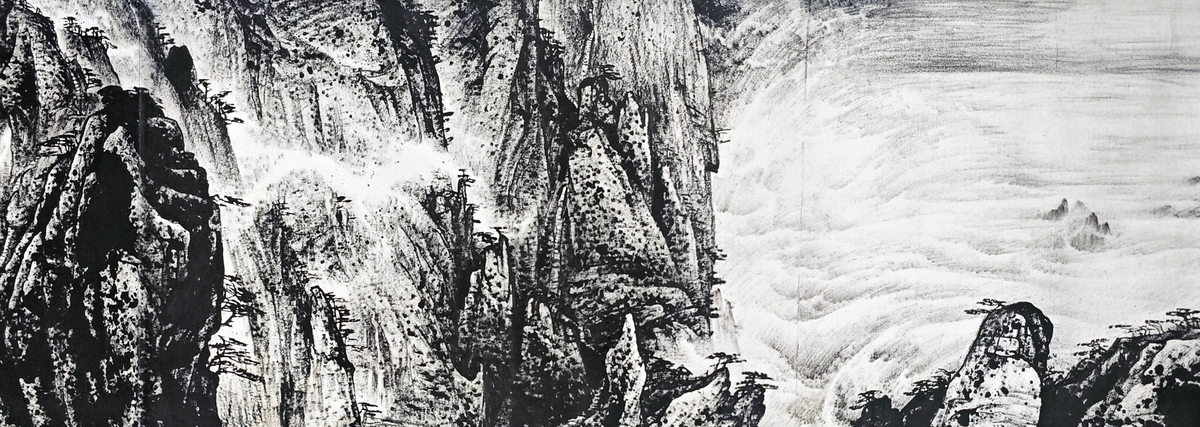 朱峰在晚年的创作中,更多以焦墨山水为媒介,展开对“虚相”的哲学思辨。他在2015年创作的《五百里黄山氤氲图》中,通过焦墨技法对传统水墨“虚相”美学进行重构,实现了从物象再现到存在追问的跨越。在这幅长达99米的巨作中,以云海构成的“虚相”占据了画作的三分之一。他一改早年对墨色的反复叠加,墨色由浓转淡至无,这不仅是对黄山云海变化的视觉捕捉,更是对海德格尔“林中空地”概念的东方化诠释。山石树木的隐现,以笔墨的“空”喻示存在的敞开,象征着存在从遮蔽走向澄明的动态过程。值得注意的是,朱峰独特的勾云皴染技法直接摒弃了传统水墨的偶然性。他通过组合排线的干笔皴擦形成飞白肌理,不仅是对黄山氤氲气象的意向表达,还以笔触的未完成性暗示了现象学“悬搁”的“在场”。当观者试图捕捉具体物象时,笔墨的形态已悄然消解为存在显影的通道。