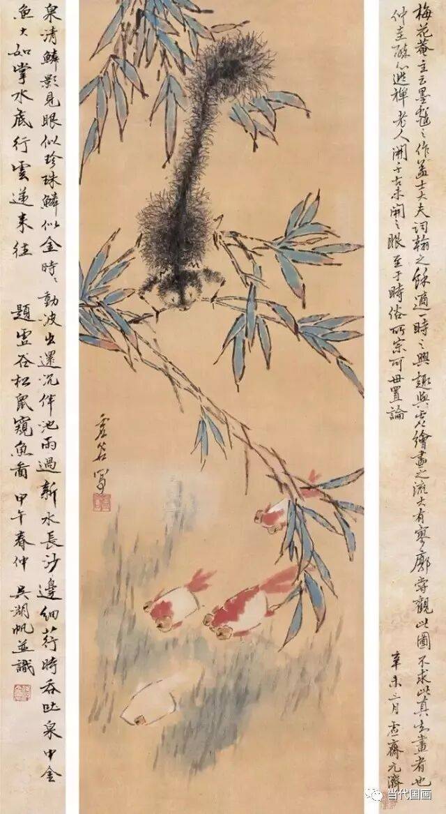虚谷早年学界画,工人物写照。擅花果、禽鱼、山水,尤长于金鱼、松鼠,他继承新安派渐江、程邃画风并上溯宋元,又受华新罗等扬州画家影响,作品中对象的造型奇特,章法与众不同。作品有苍秀之趣,敷色清新,造型生动,落笔冷隽,别具风格。