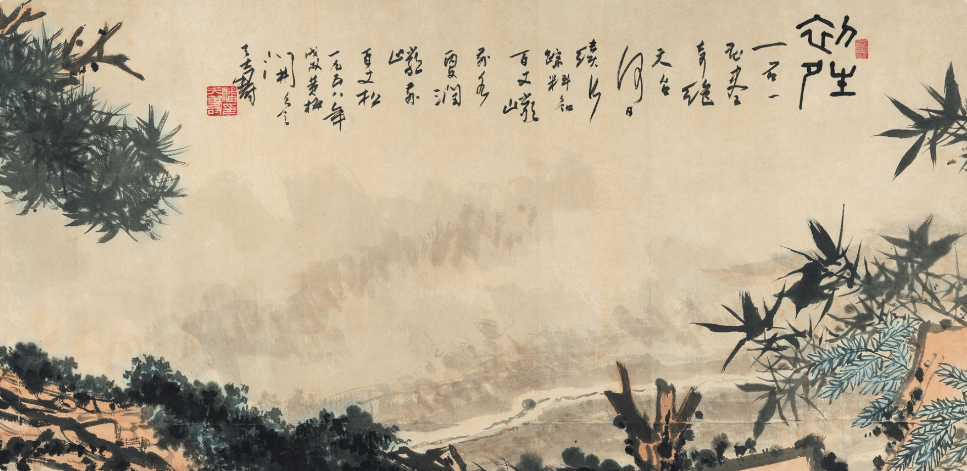 1958年,潘天寿在梅雨季节创作了一幅《初晴》,画在140.5×364.0厘米的纸上,展示了近现代中国画的气势磅礴。这幅画以2.0585亿元的价格成交,不仅体现了潘天寿“强其骨”的艺术理念,也是传统笔墨与时代精神的碰撞。
