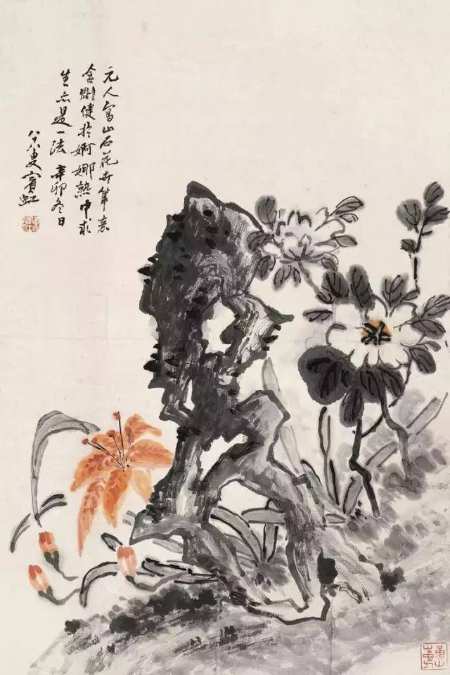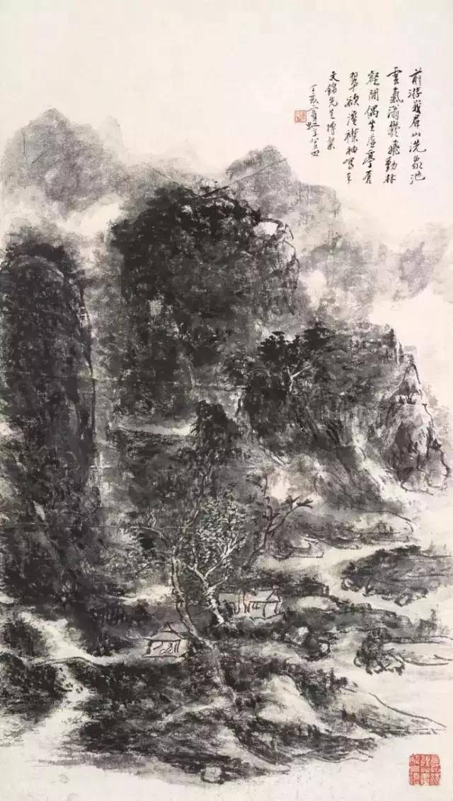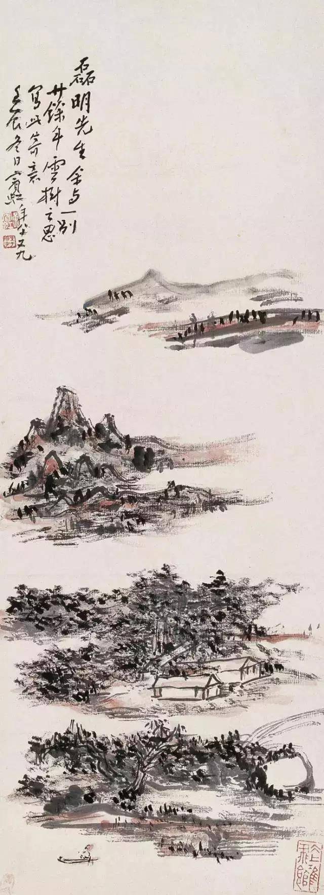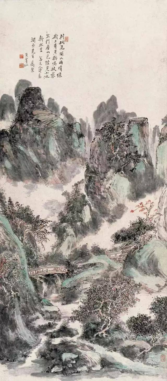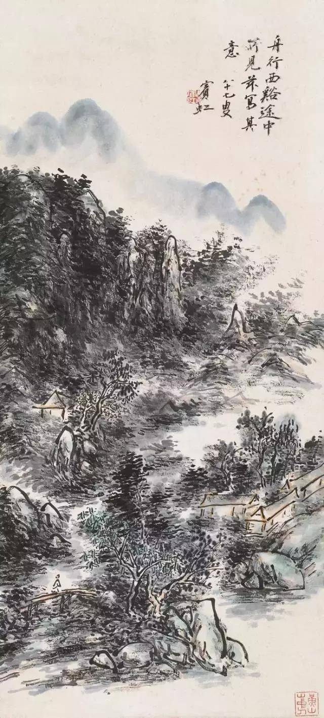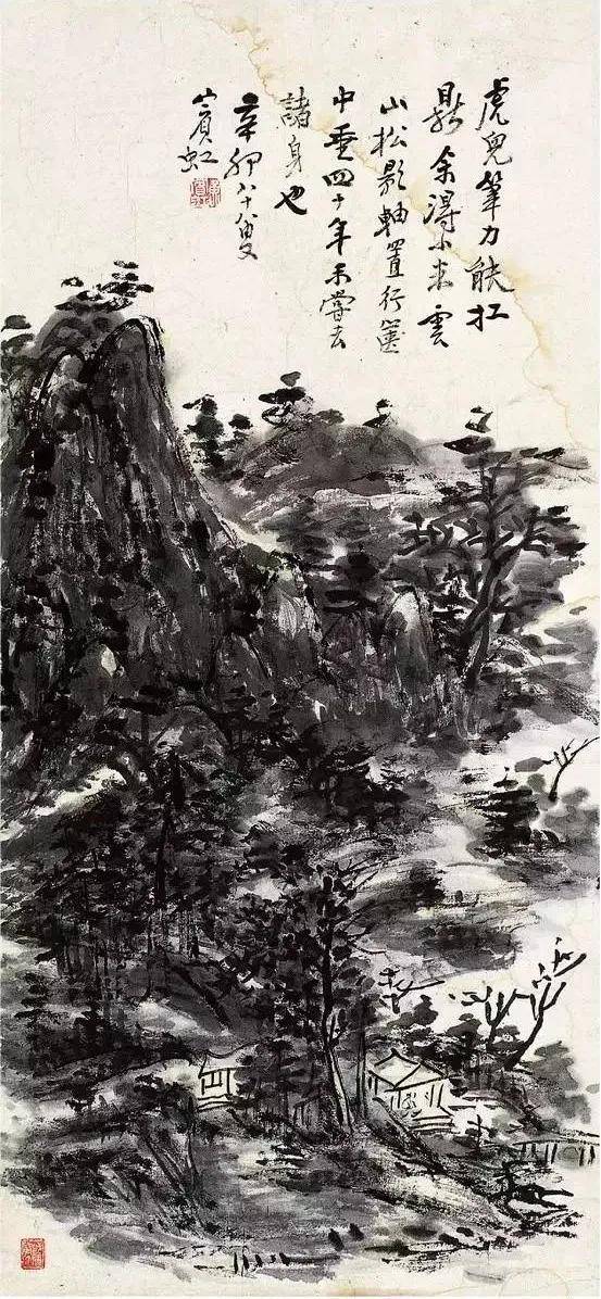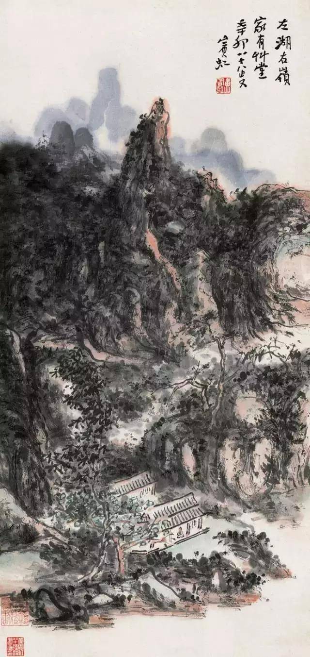 在北平的十一年,黄宾虹完成“黑宾虹”的转变后,又进行“水墨丹青合体”的试验。用点染法将石色的朱砂、石青、石绿厚厚地点染到黑密的水墨之中,“丹青隐墨,墨隐丹青”,这是受西方印象派启发,思以将中国山水画两大体系(水墨与青绿)进行融合的一大创举。