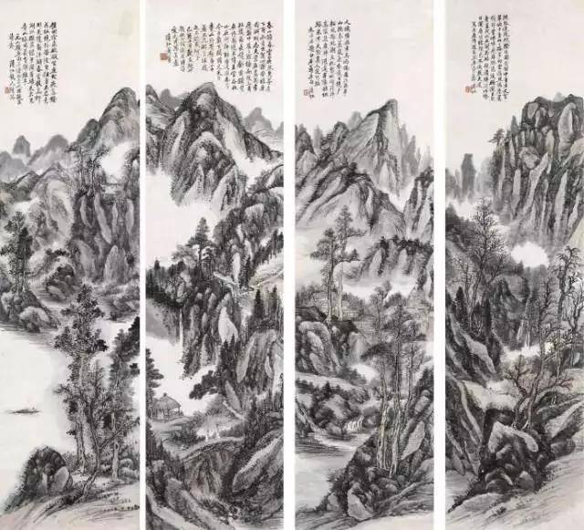 (黄宾虹 1909 山水四屏146×38cm×4)