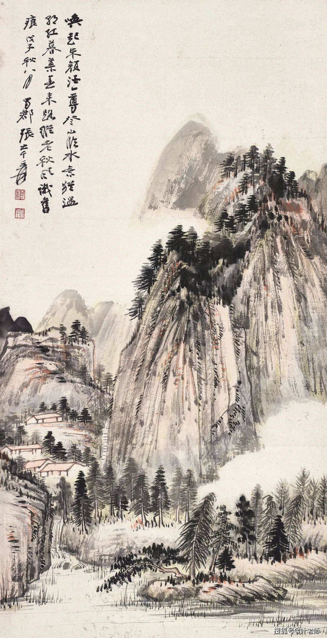 题识:唤起朱颜酒一尊,登山临水意犹温。朝红暮叶春来路,纵老秋风识旧痕。戊子秋八月,蜀郡张大千爰。