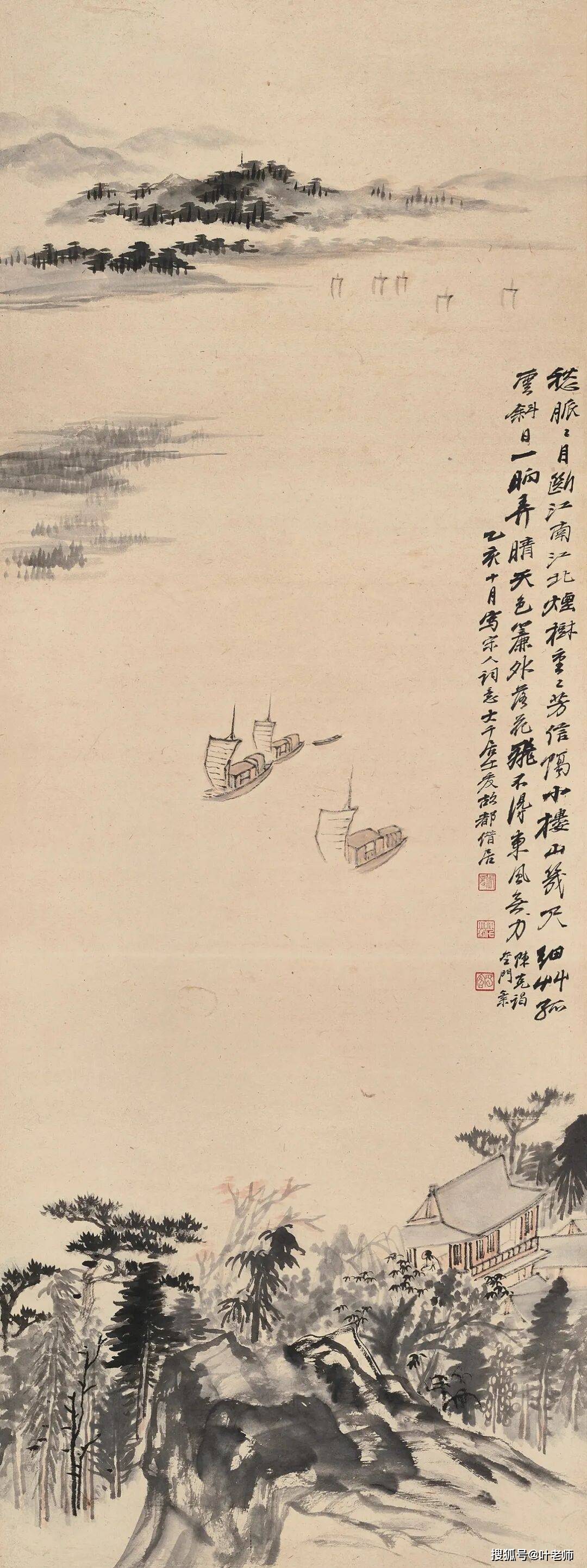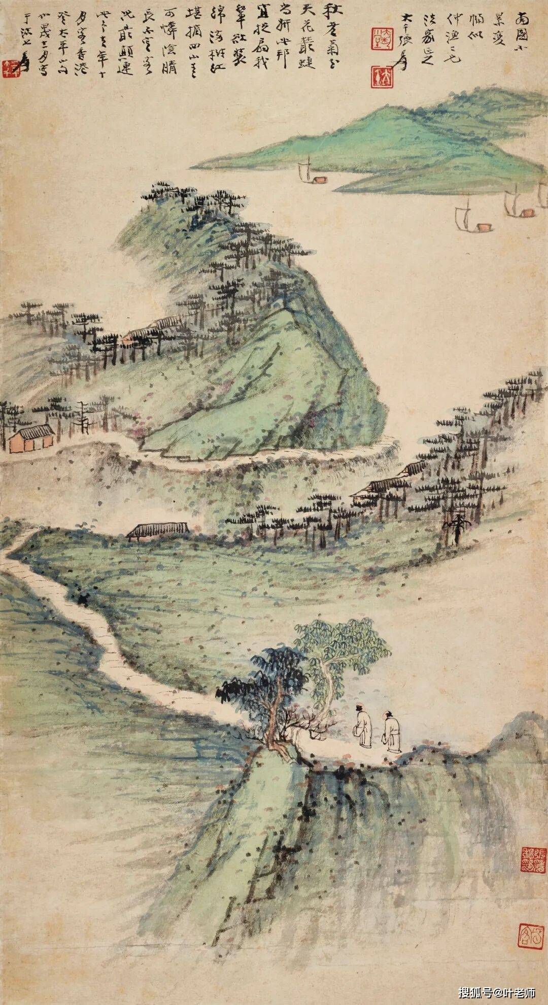说明:1933年大千有香港之游,与黄般若、黄君璧、何冠五、马武仲等把酒论艺,游玩写生。太平山、屯门、赤柱、青山等地,都留下了他们的足迹。大千游兴甚浓,曾感叹:“太平山小景可入画者甚富。惜当代名家皆不屑为之耳”。此幅所题五律即《太平山雨景》,大千曾自述:“般若道兄招游太平山,为雨所阻至山半而归,次日拈此以退笔书之。”此幅《南国小景》作于次年1934年,大千时客沽上。应为回忆旧游所作。