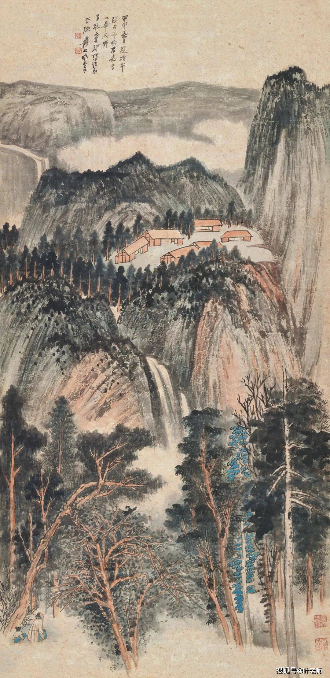 1944年的成都,新春氛围因一场艺术盛事而格外热烈。1月25日,正值农历正月初一,“张大千临摹敦煌壁画展览”隆重开幕,观者络绎不绝,成为蓉城百姓春节期间一桩津津乐道的雅事。此后不足两月,3月15日,“张大千收藏古书画展览”再度登场,全城为之轰动,观者如云。3月25日,四川省美术协会为庆祝首届全国美术节大会并举办会员作品展,张大千亦有数件作品参展。这一系列的展览,使得张大千的绘画地位与公众声名扶摇直上,几至妇孺皆知。同年,张大千应“赵增年、赵百茀两君”之请,为他们的老师“子移”先生创作了此幅山水。弟子为师长求画祝寿,是中国文人传统中一段佳话,古已有之,前有如沈周为其师陈宽绘《庐山高》,以山喻德,表达“仰之弥高”之意。此图似写青城幽邃山色,用笔繁复精微,设色沉厚苍润,图中高士携礼前行,意境深婉。它不仅见证赵、赵二人尊师重道之孝心,更可见张大千应景命笔时的精心构思与诚挚用心。