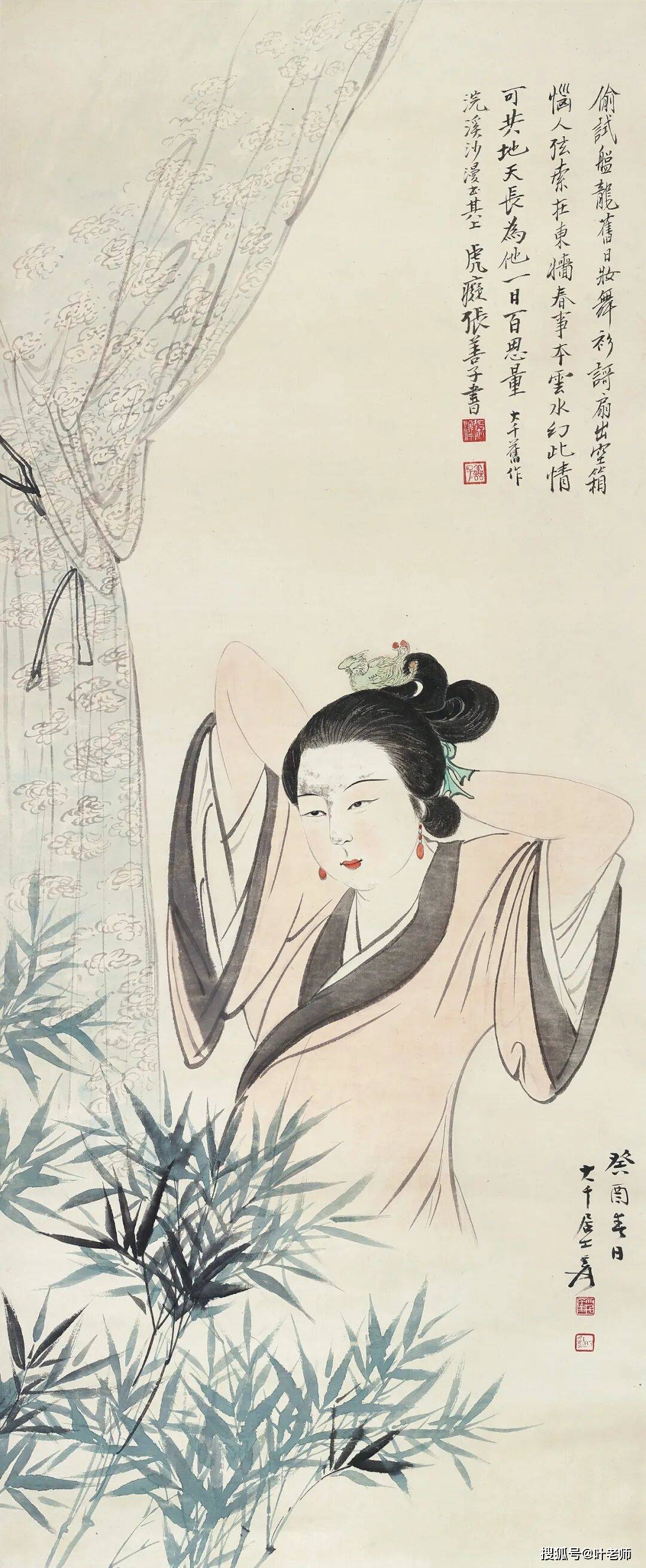 1933年农历新春,苏州网师园内,张大千与兄长张善孖及一众好友雅集园中,诗画相酬。此时的苏州,正是新柳初绽,暖阳微斜之时,张大千绘制于此时的少女,色彩华美,妍丽动人,似春日褪去冬装之轻快,于端庄娴静中含着几分活泼伶俐,并有明目皓齿、肌肤胜雪之状。仿佛将园中初春的明媚与轻快凝于笔端。既有古意,又见新韵。张大千早年便喜以仕女入画,聊作消遣。随着他潜心追摹唐寅、仇英、陈洪绶,乃至改琦、任伯年等明清诸家笔意,终成自我面貌。无论古装仕女的高华气韵,还是时装女子的理想风姿,在他笔下皆风神独具。