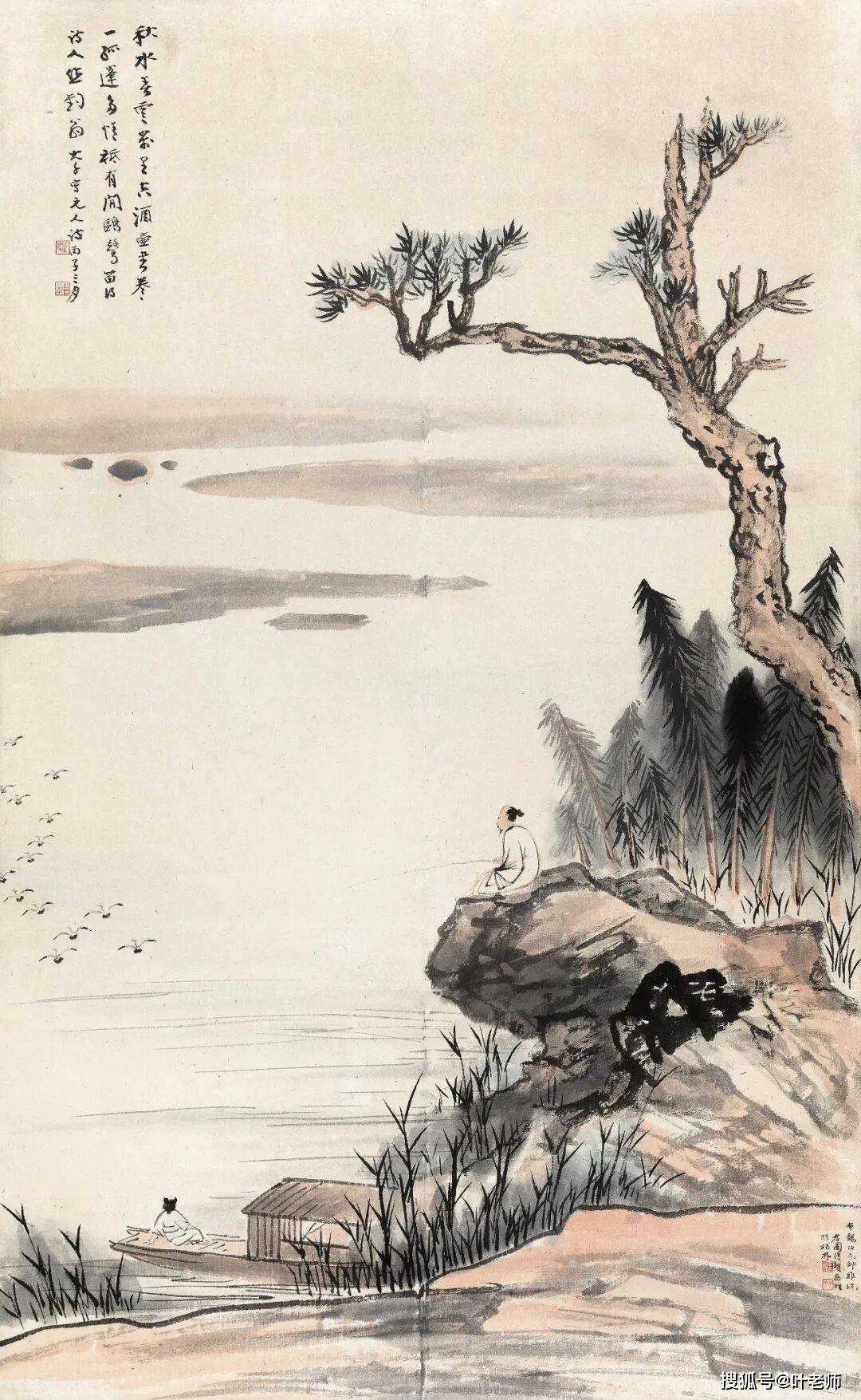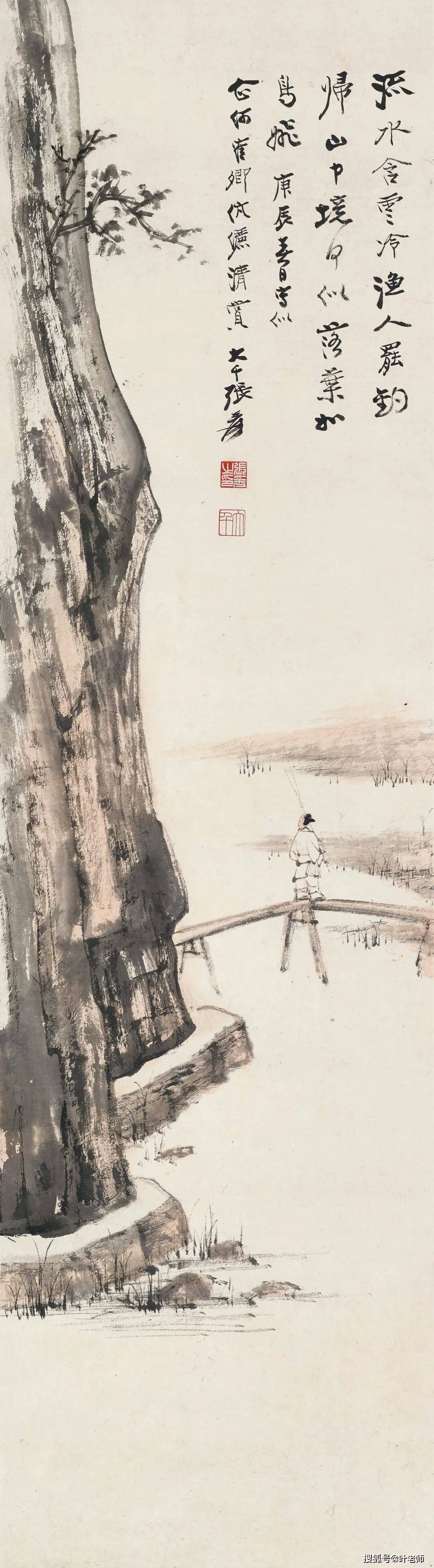 题识:秋水春云万里空,酒壶书卷一孤蓬。多情只有闲鸥鹭,留得诗人作钓翁。大千写元人诗。丙子三月。