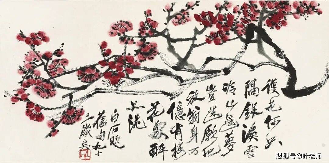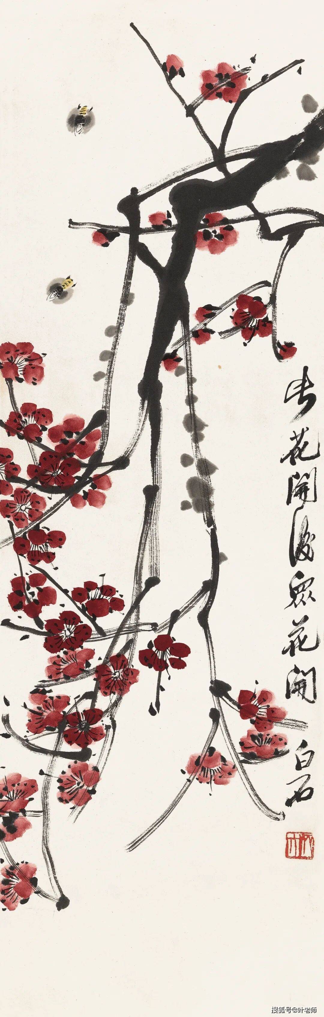 “护花何只隔银溪,雪冷山遥梦岂迷。愿化放翁身万亿,有梅花处醉如泥”是齐白石早年拟陆游诗意所作七言绝句,题曰《雪峰梅梦》,收录于1920年代辑成之《借山吟馆诗草》。《诗草》序言中,齐白石亦自言“余年四十至五十多感伤,故喜放翁诗,所作之诗,感伤而已。虽嬉笑怒骂,幸未伤风雅。”直至耄耋之年画家亦以此诗题画梅花。齐白石笔下的红梅,愈至晚年愈见笔墨之老辣。浓墨写出盘曲虬枝,洋红点写重萼花瓣。色墨并用,正是“红花墨叶”风格的延伸。