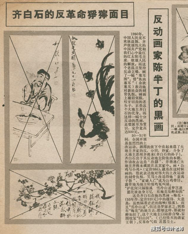 如此佳作,在特殊年代被江西师范学院井冈山兵团与广州美术革命编辑部作为“齐白石的反革命狰狞面目”的典型作品,刊登于联合出版之《井冈山画报、美术革命》予以批判。老人早年的咏梅诗作被曲解为“虽然隔着茫茫的海峡,而且雪冷山遥,但还是梦寐求之,到那有梅花的地方去,能够这样那就如醉如狂了。这个大地主以陆游自喻,妄图收复旧山河。”回顾这段往事,竟是何等的荒唐。