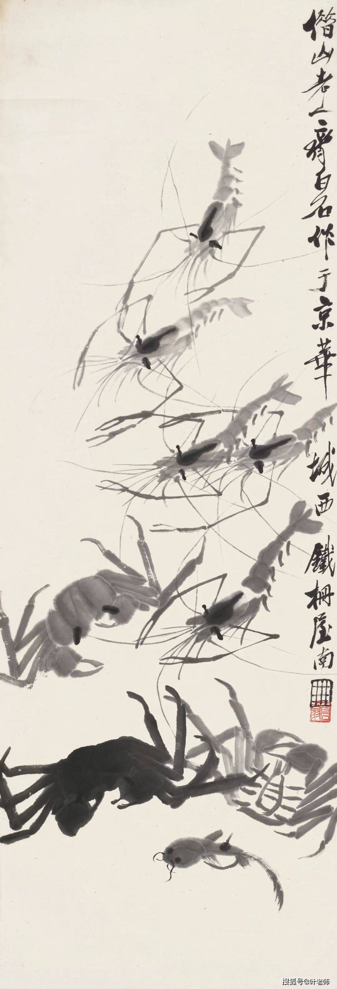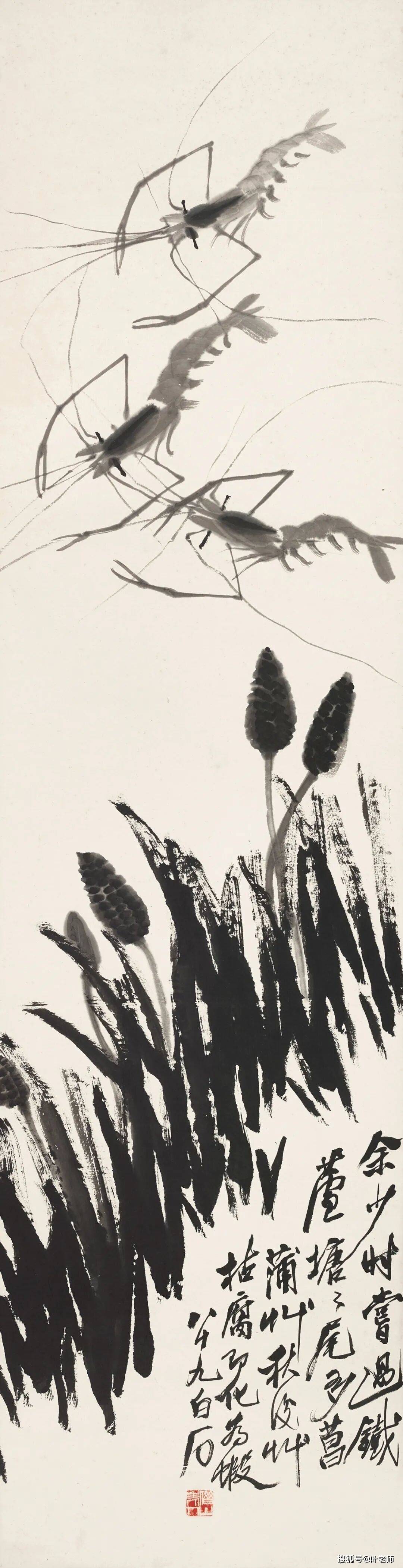 题识:余少时尝过铁芦塘,塘尾多菖蒲草。秋后草枯腐即化为虾。八十九,白石。