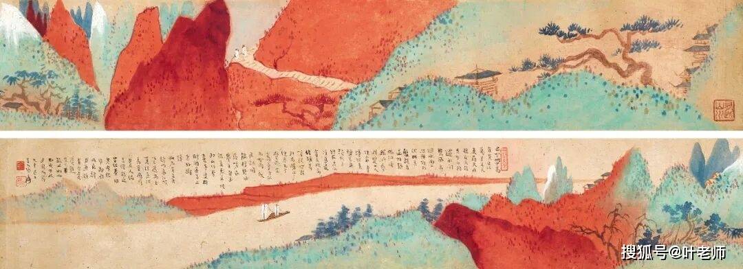 此卷写群峰万壑之间,有高士俯视无垠江水,远处扬帆,有巴船出峡之景象。卷后张大千长题元代·吴莱《题袁子仁所藏巴船出峡图》诗句。此卷尺幅仅高三寸,长近四尺,却在山峦转折间,有咫尺天涯之感。图中既有诗中描绘出“巴船出峡”中三峡的地势险峻,又有意欲夏珪之比较“血战古人”之意,以彰显出大千起承转合随笔即现的能力。画中题“乙亥中秋月圆时节”,为1935年中秋,此时居住在颐和园听鹂馆的张大千,或正思念着自己的蜀国故乡,而“因案有佳纸”,即兴所作。