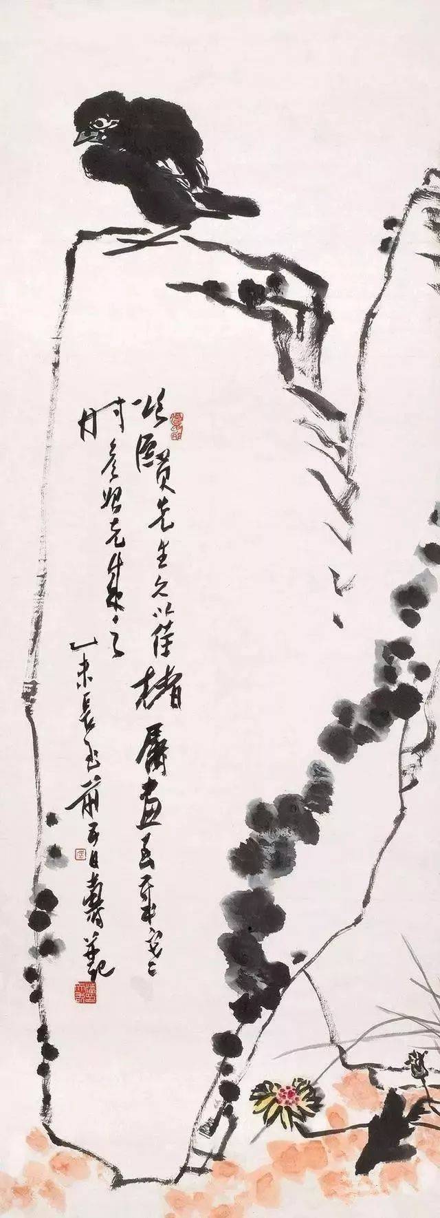 《翠石双雀》是潘先生反复入画的题材,画来得心应手,一气呵成。潘天寿在此作的构图中使用了他所惯用的“造险”与“破险”技法。画面正中一块巨石,奇崛、孤兀,呈不规则矩形,几乎填塞了整个画面,不过石块上的双雀和石下的野草又平衡了画面,不仅使画面转危为安,且获得与众不同的新奇意境。