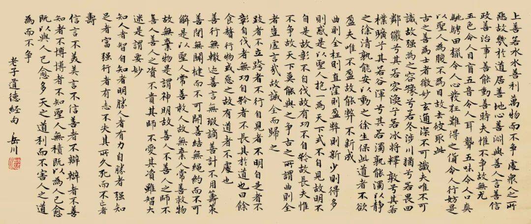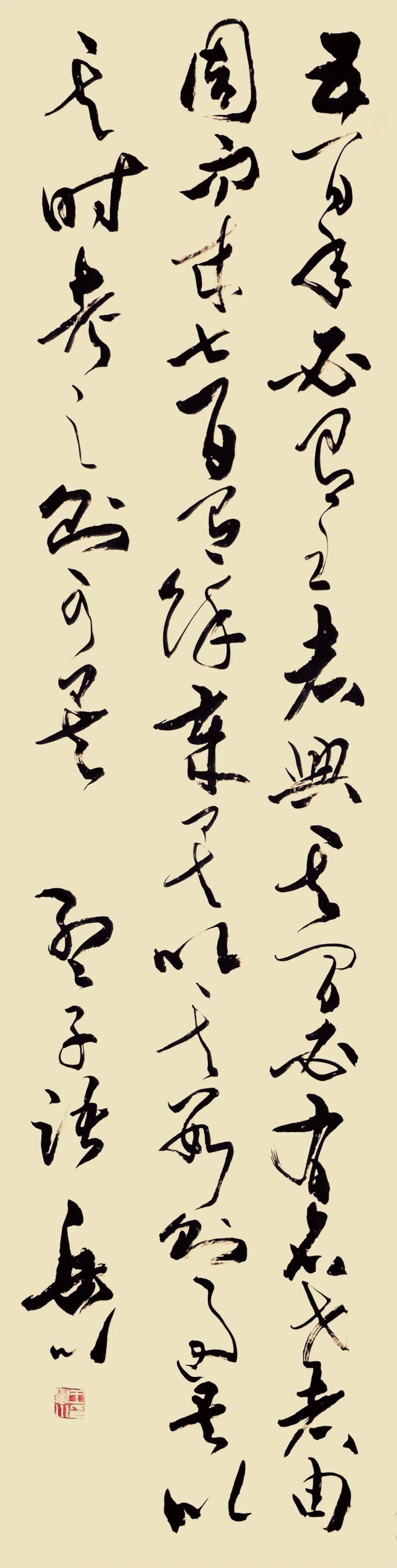 章法是一幅作品字与字、行与行之间是否疏密得当,大小相宜。一幅章法讲究的作品,则能表现顾盼有情、精神飞动、全章贯气的艺术效果。知书者“观章见阵”。章即章法,是欣赏书法艺术的总体表现;阵是布白,即书写以外的空白之处。就章法而言,“一点乃一字之规,一字乃终篇之准。”(孙过庭《书谱》)通篇结构,引领管带,首尾相应,一气呵成。巧妙的章法布白脱离世俗之气,使作品通篇产生高古深幽的审美效果。