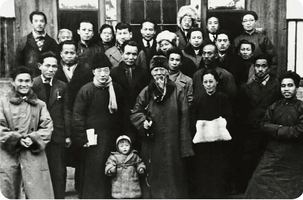 (抗战胜利后,徐悲鸿、齐白石与北平艺专的部分教员合影,齐白石后面穿浅色衣服的人就是卢光照)