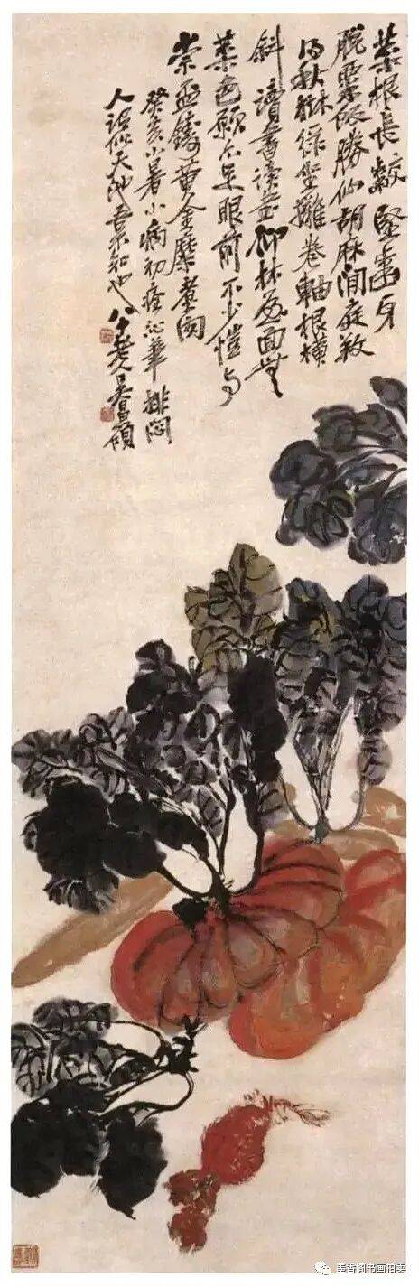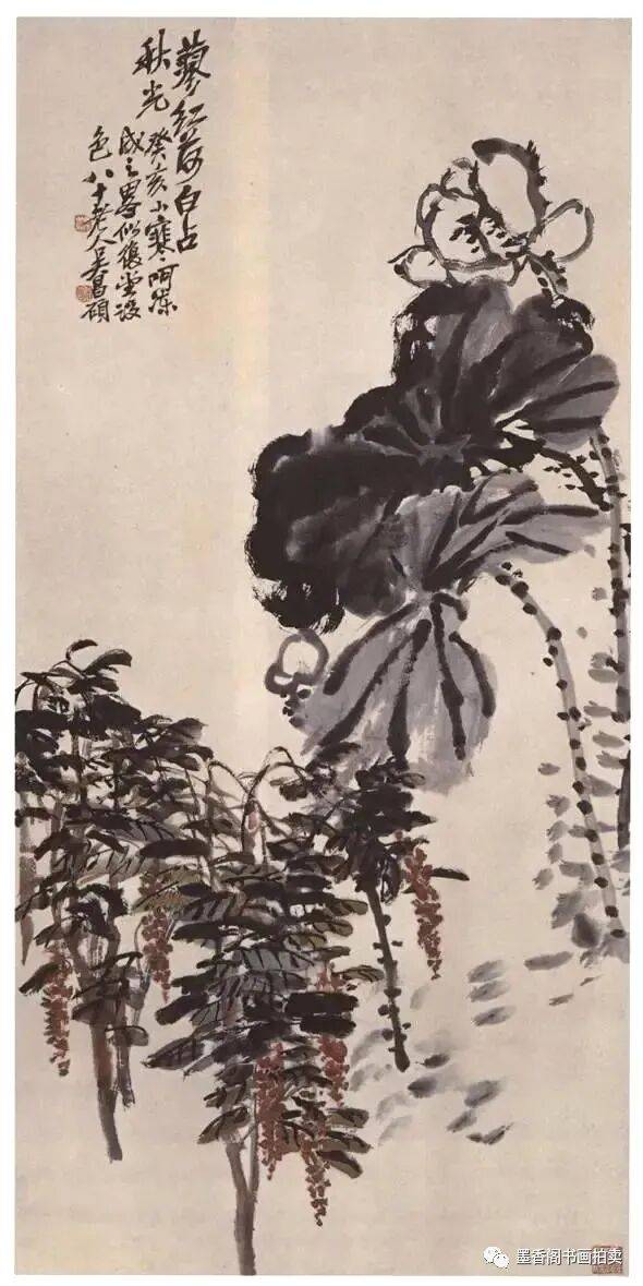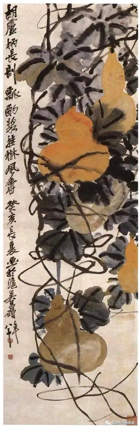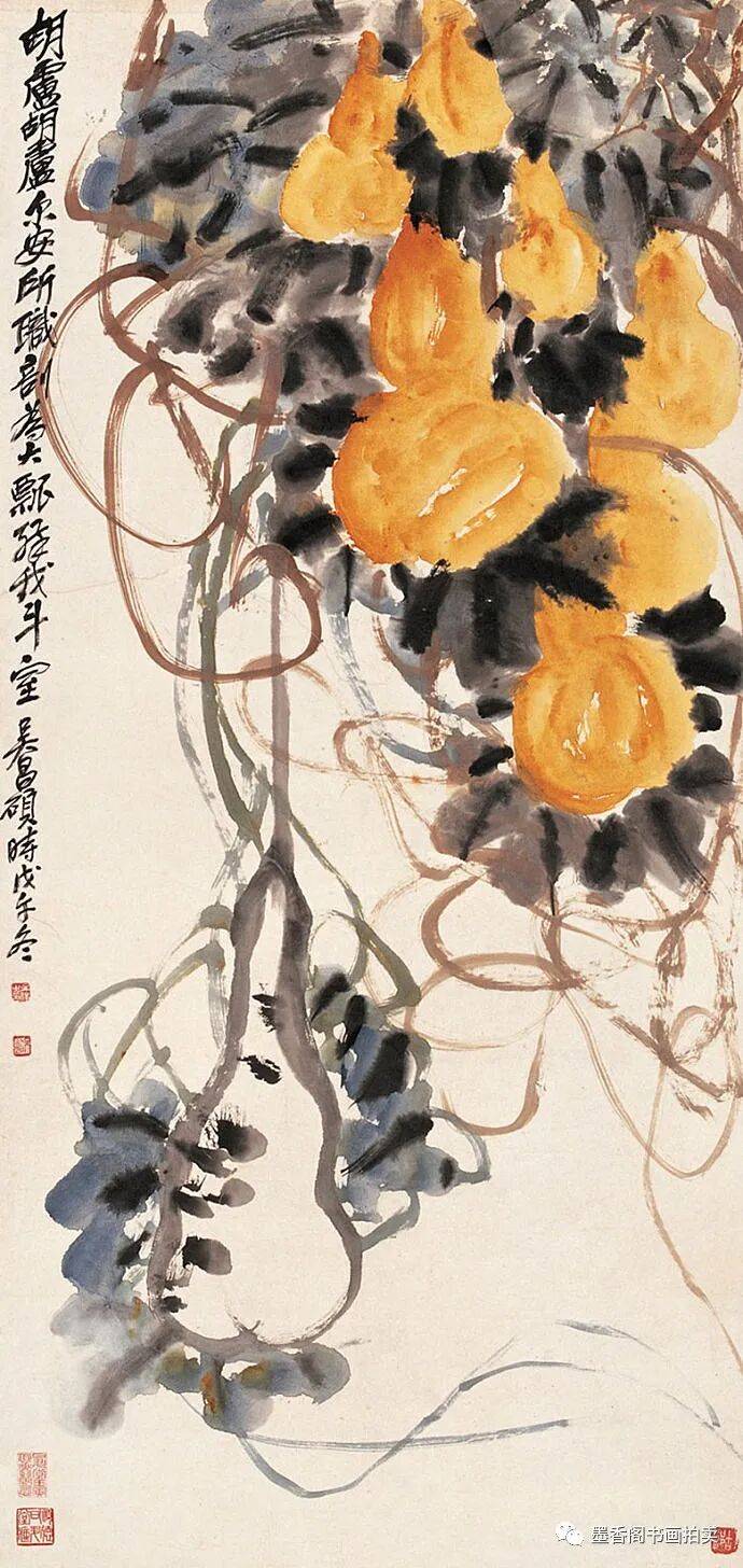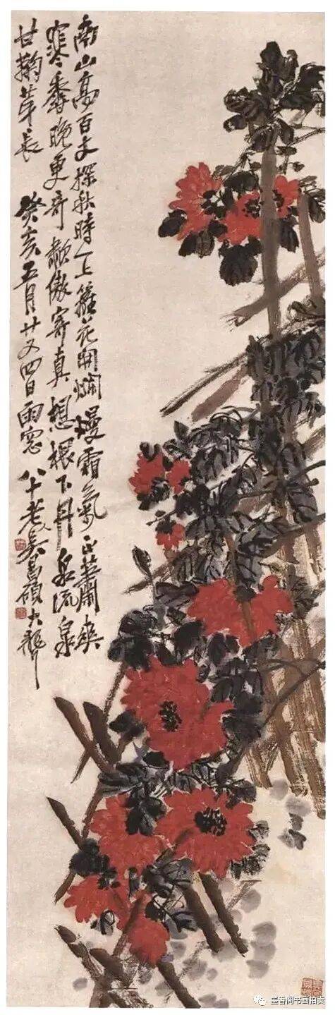 若论吴昌硕对后世影响最巨者,当属其绘画。他虽中年始专意绘事,却以深厚的书法与篆刻功底,开辟出一条“以书入画”的新路。