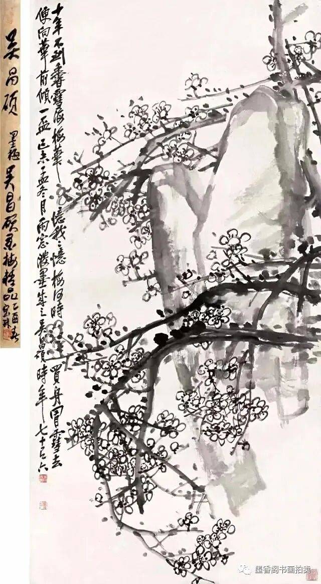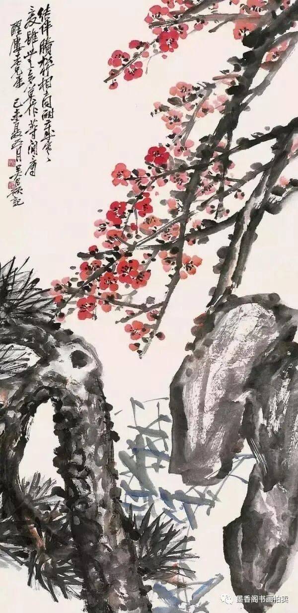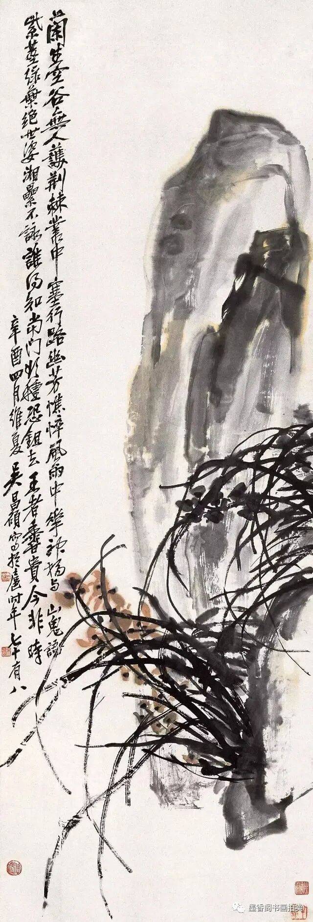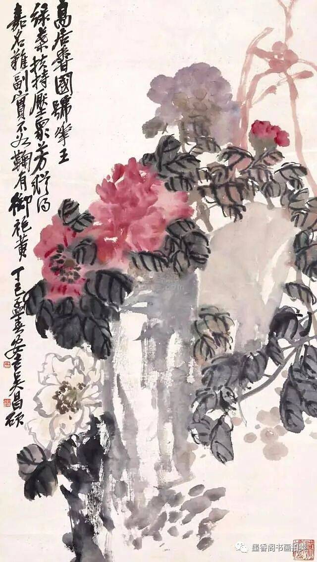他自言:“我平生得力之处,在于能以作书之法作画。”其画多写意花卉,尤擅梅、兰、竹、菊、牡丹、紫藤、荷花、水仙等题材。然与传统文人画重“清雅”不同,吴昌硕的画风雄强、浓烈、饱满,充满“金石气”——即以篆籀笔法写枝干,以狂草笔意绘藤蔓,线条老辣如铁,墨色酣畅如酒。