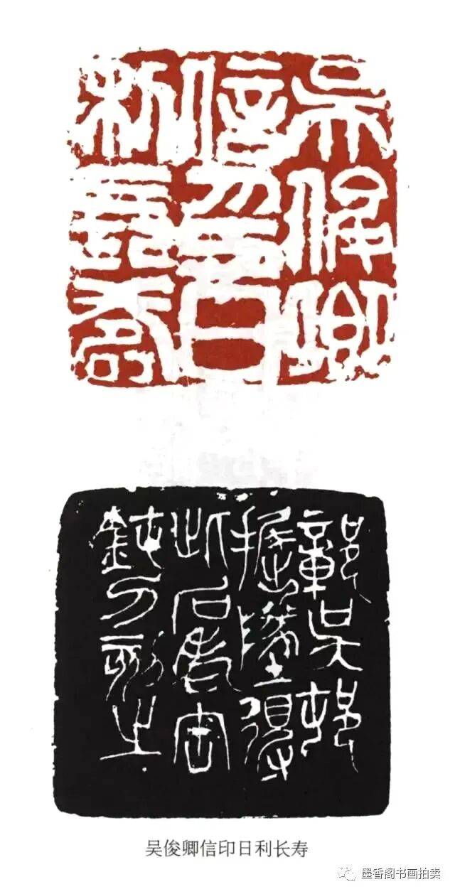 吴昌硕的篆刻,是其艺术体系中最先成熟、最具开创性的部分。他少年习印,初从浙派入手,后专攻汉印,又吸收邓石如、吴让之、赵之谦之长,最终形成“冲切结合、雄浑朴茂”的独特风格。