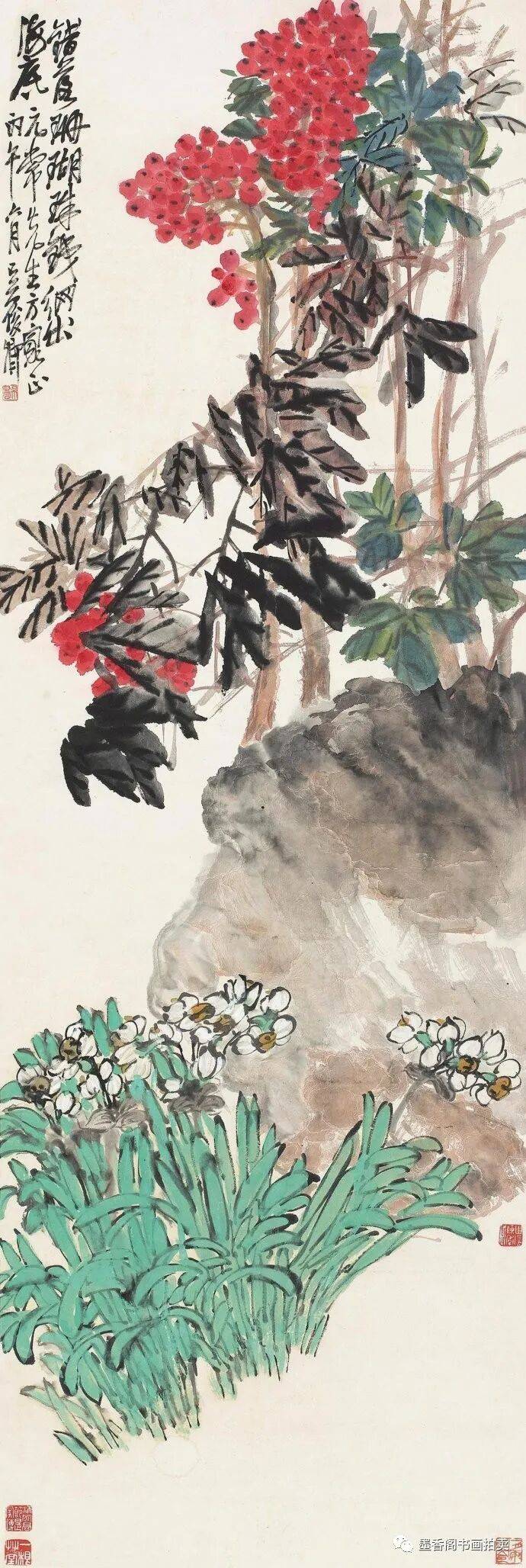 设色方面,吴昌硕大胆使用西洋红、石绿、胭脂等浓丽色彩,尤以红梅、红菊、红牡丹著称。然其色虽艳而不俗,因其以墨为骨,色为肉,墨色相济,艳中见古,艳中见雅。如《天竺水仙图》中,嫣红天竺与翠绿水仙冷暖对比,生机盎然;《牡丹水仙图》则红牡丹富贵热烈,白水仙清雅脱俗,相映成趣,寓意“富贵长寿”。
