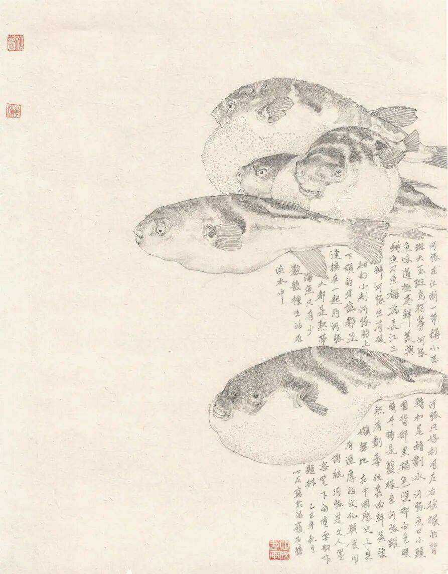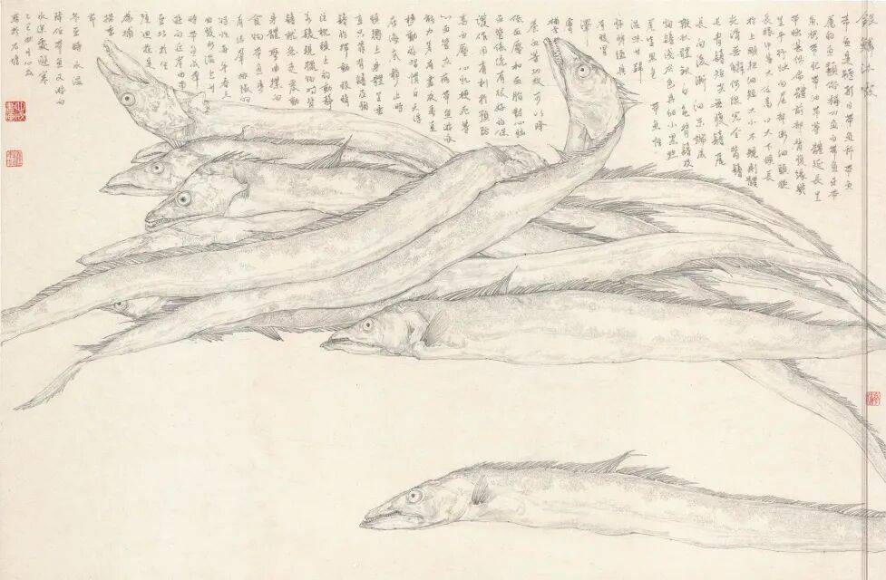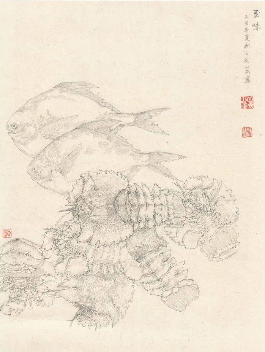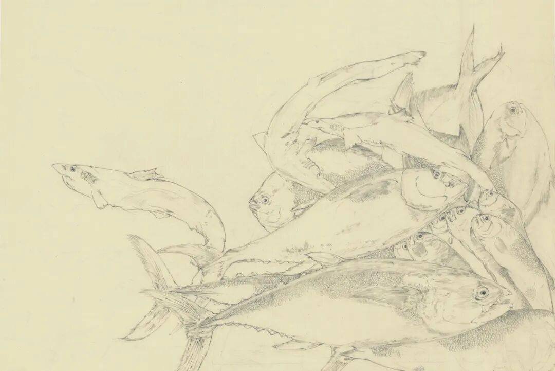 至石塘,渔港物象的质感与烟火气,使人沉醉。鱼蟹的白描对我来说是新的尝试,在不同的题材上以写生为基础再加以创作的构思,去组织我的绘画语言,在此次下乡中教我重新学习“观看”与“呈现”。