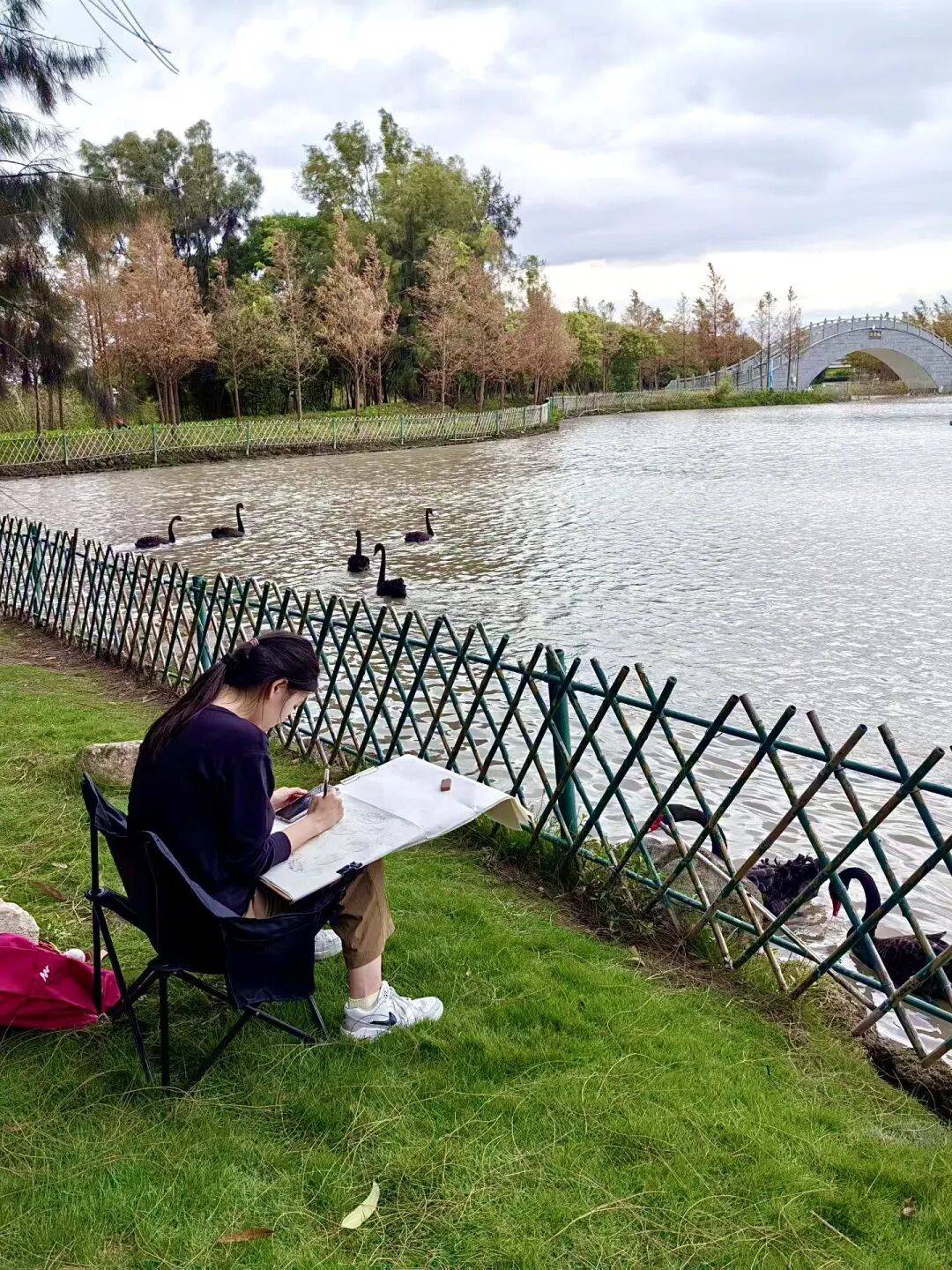 在漩门湾看黑天鹅悠哉悠哉游的游来游去时,我忽然理解了在爬山时看到的竹子,它们和山中竹子的共通之处——都按照自己的节奏自在生长。竹节上的斑驳,天鹅羽翼的微乱,都不是瑕疵,而是生命真实的痕迹。听山风过竹的声响,看天鹅极美的曲颈的弧度,又触摸树皮粗糙的纹理。写生时最快乐的,或许正是这份与万物真实相遇的诚恳。