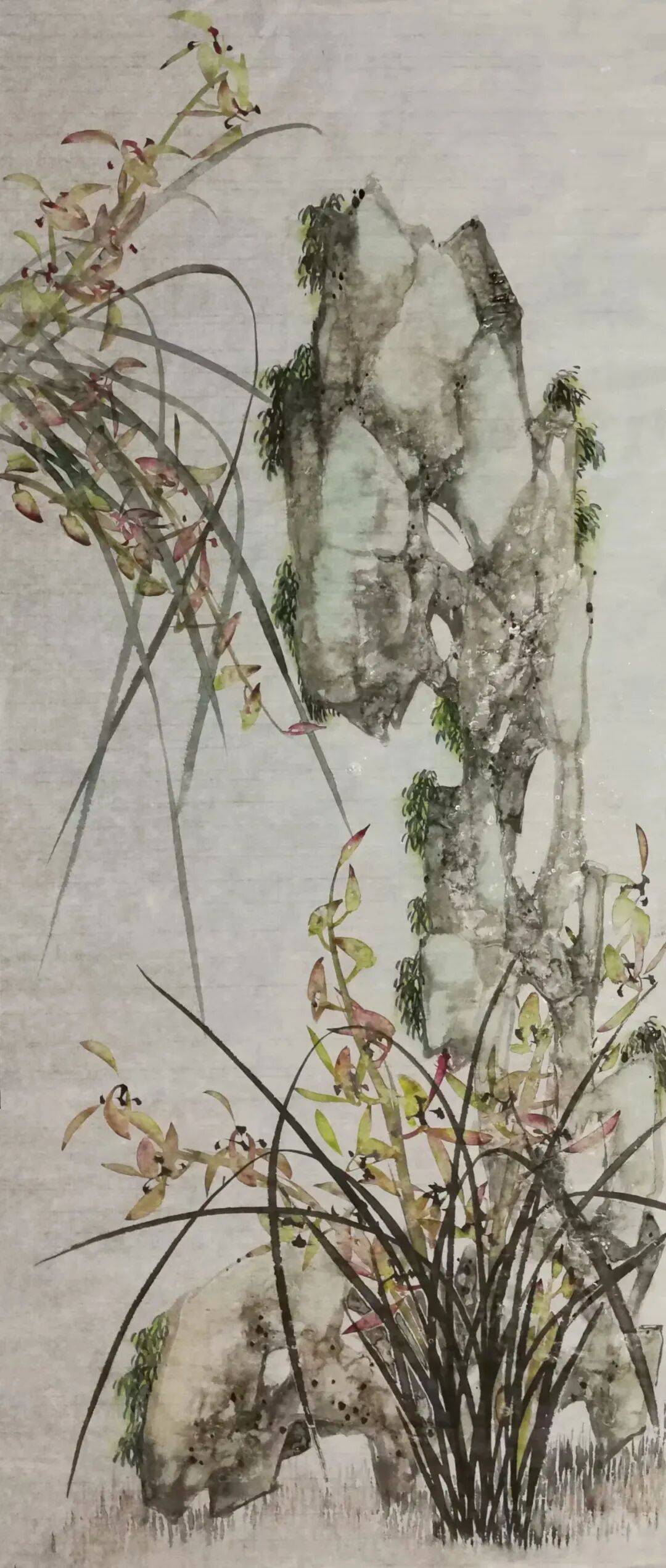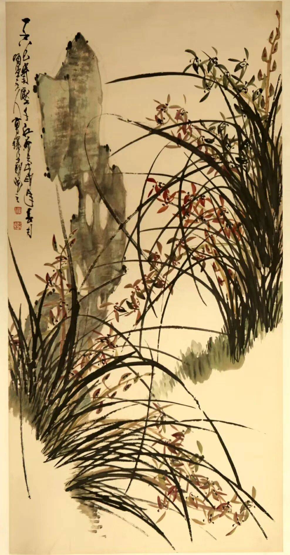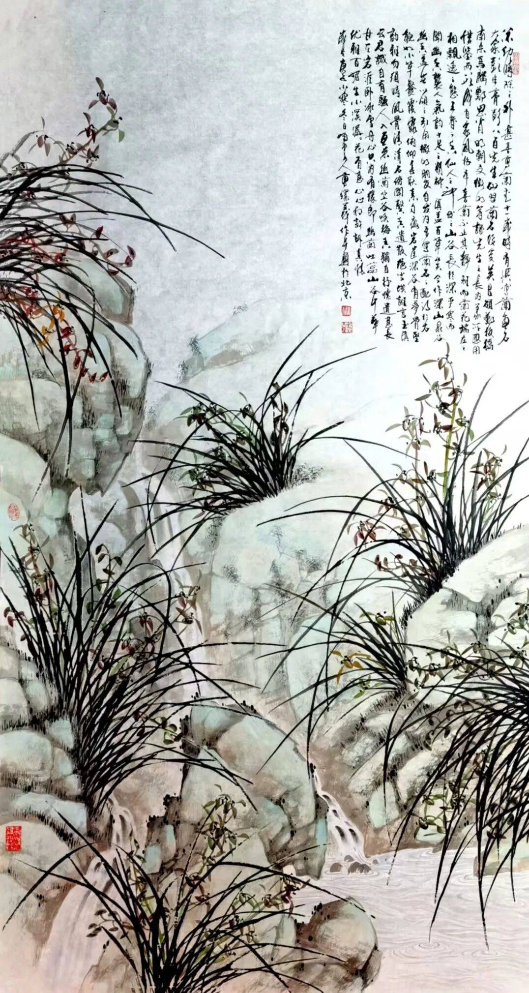 2. "文人精神的延续" 他继承“诗书画一体”传统,常在画中题写自作诗词。如《幽兰》配诗“性本清芬品不暇,自在深林养气华”,以兰喻己,彰显文人孤高气节。书法用笔亦融入绘画,兰花叶脉以草书笔意挥洒,荆棘则以隶书方折表现,形成“以书入画”的美学特质。
