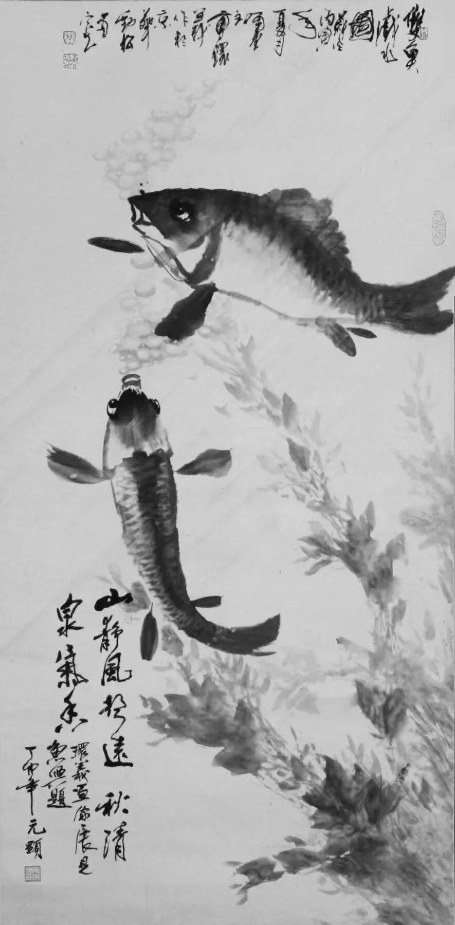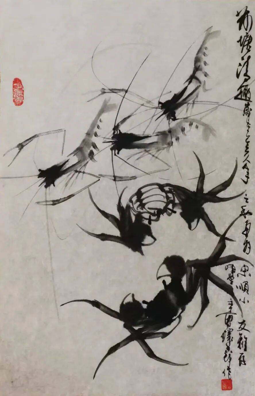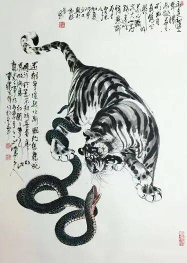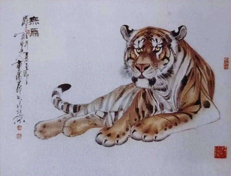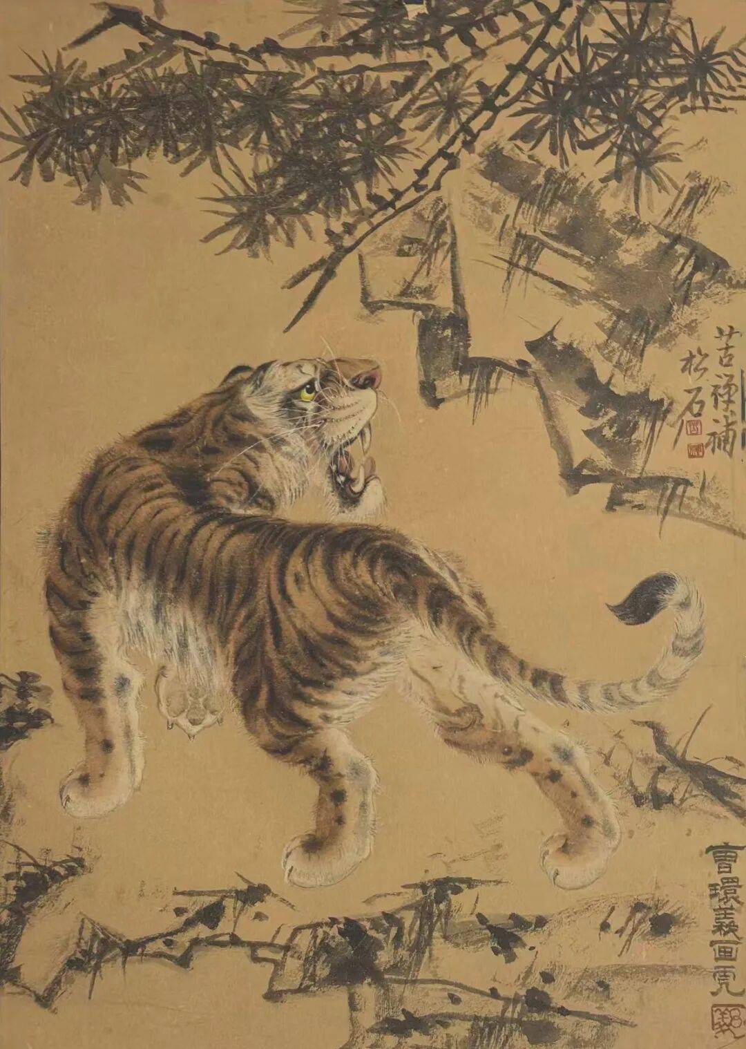 2."中西技法的融合"受西方绘画影响,他将块面构成引入构图。如《雄风盖世图》中,虎的躯干以墨块堆积形成体积感,背景山石以几何切割强化空间层次,兼具传统皴法的肌理与现代抽象美感。