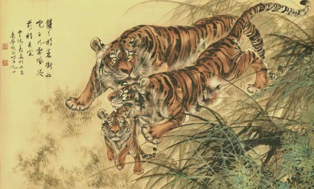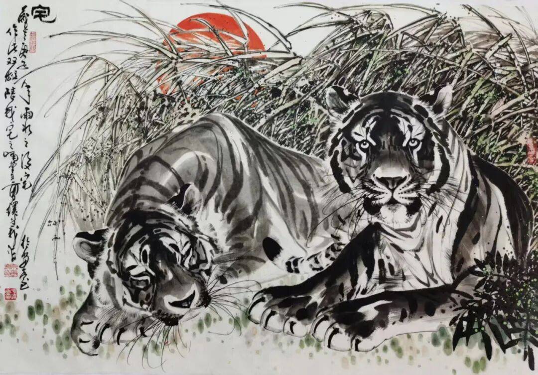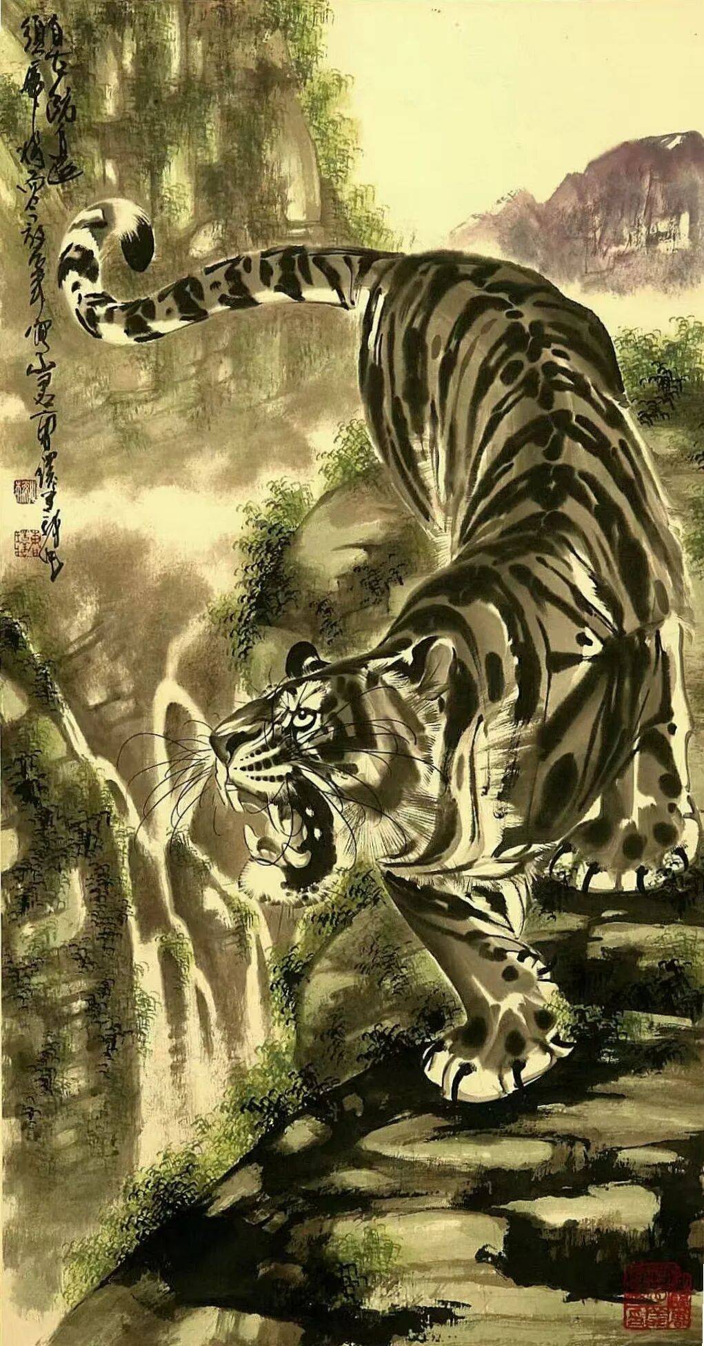 2. “写意的豪放气韵”巨幅作品如《百虎图》,运用泼墨技法渲染山石背景,虎群姿态各异,或卧或跃,墨色酣畅淋漓。其线条借鉴书法“屋漏痕”“折钗股”笔意,如《长啸》中虎背轮廓以篆书圆转笔法完成,腿部则以隶书方折笔法强化力量感。
