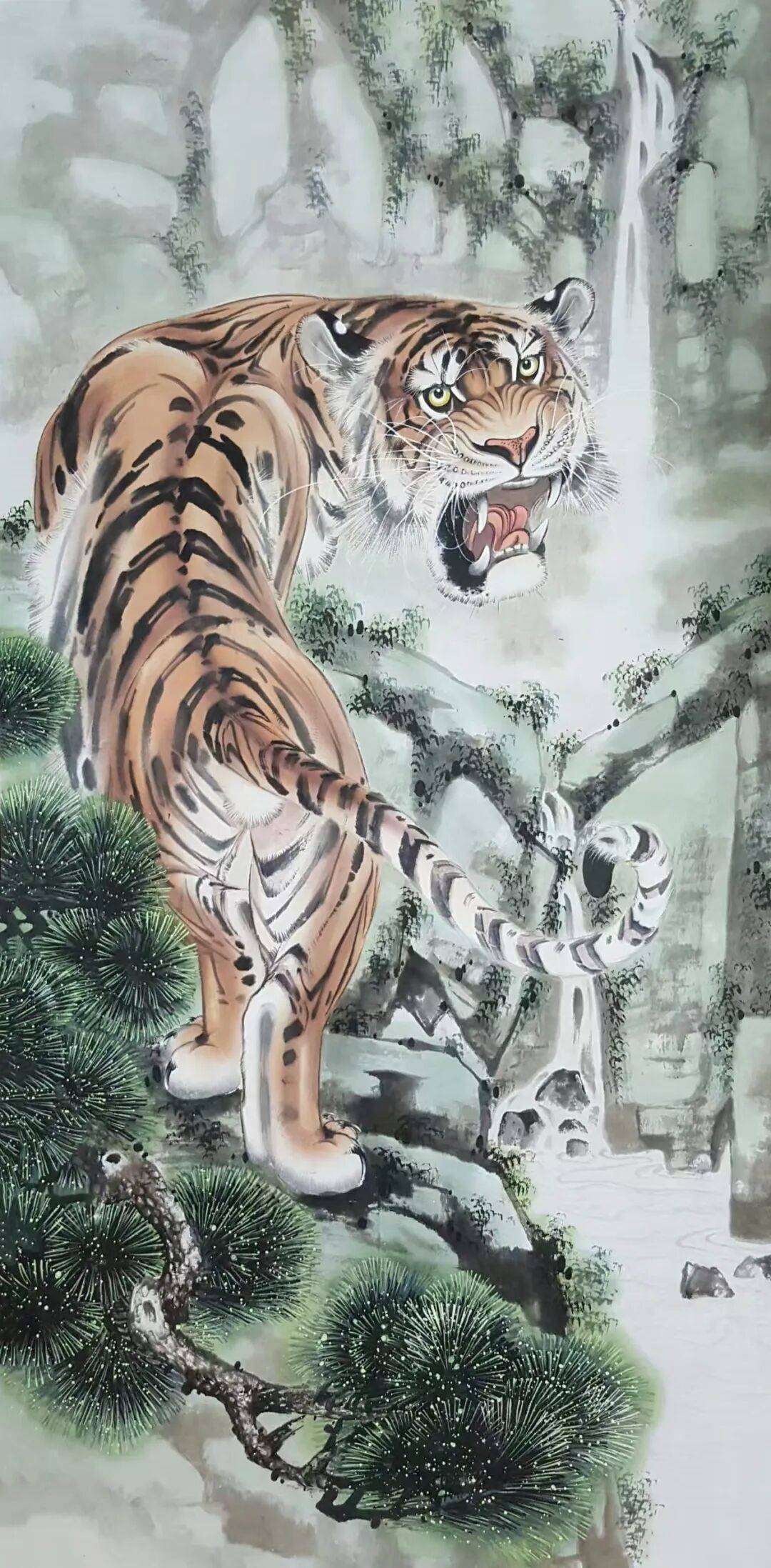1. “五法体系”的构建他系统归纳出虎的五种画法:泼墨写意、彩墨、小写意、小工写及工笔,形成完整的创作方法论。如《五福临门图》采用“彩墨法”,在传统水墨基础上融入石青、朱砂等矿物颜料,虎身斑纹以金粉勾边,在光线折射下呈现流动感,拓展了水墨的材质表现力。