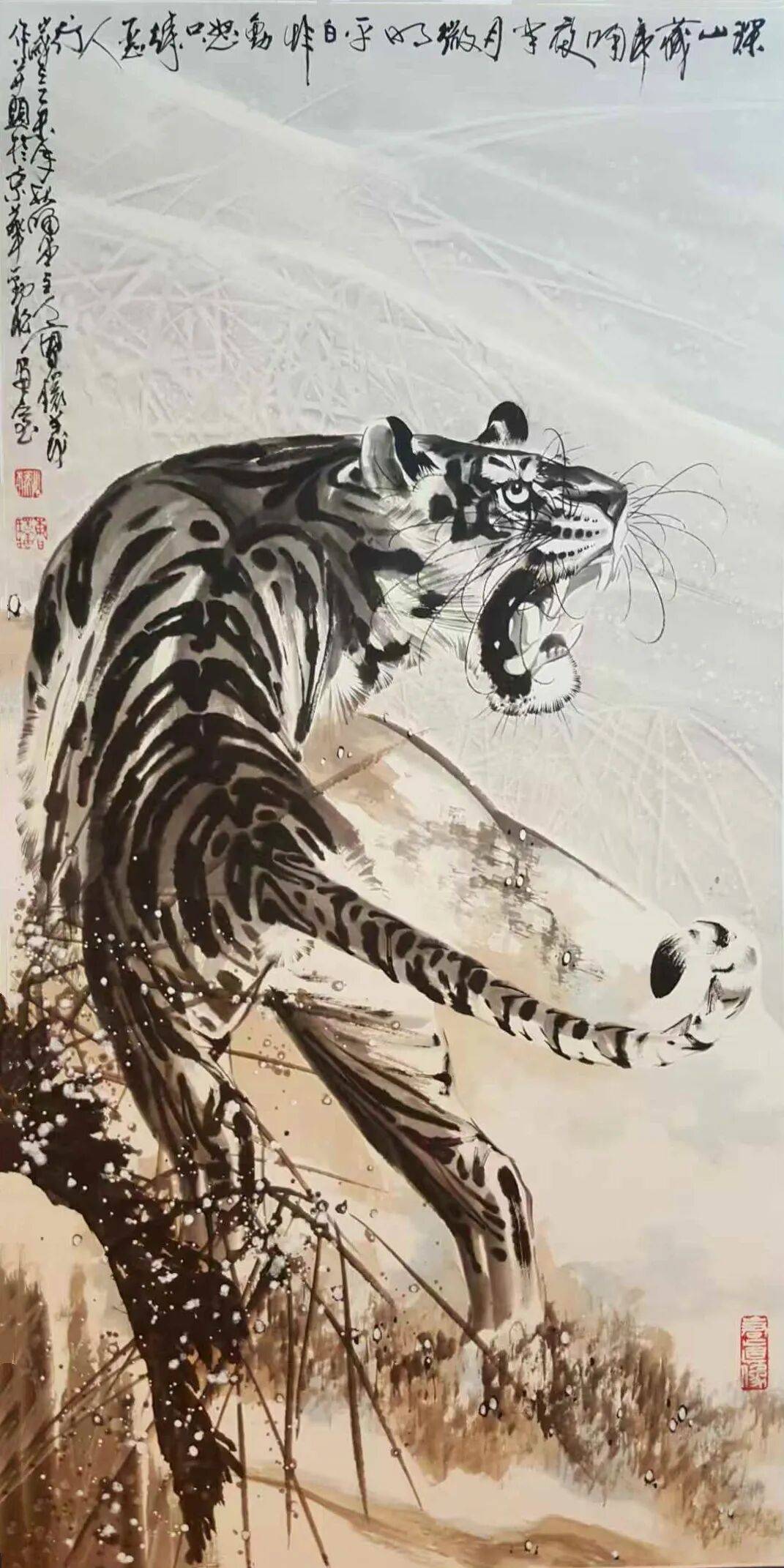 3. “环境氛围的诗意营造 ”不同于传统虎画的孤傲场景,曹环义常将虎置于四季更迭的自然中。如《虎啸深山夜月寒》以淡墨渲染雪夜,虎身留白与背景的冷灰色调形成对比,既突出主体,又烘托出“千山鸟飞绝”的寂寥意境。