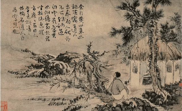 《幽栖图》是髡残“自为写照”之作。近处松下茅屋新结成,一人侧坐古木老干上回头望着水口湖泽,一派随遇而安的自适之情。题款云:“余自黄山来,幽栖随寓。道人,出家的人何所不可?残衲过白云岭,爱其幽僻,结茅于兹,坐树流泉,纵市之尘玄目,亦当至此清清(心)。此幅石道人自为写照也。”用笔粗重苍朴,淡彩稍加点染,有秋肃之意。